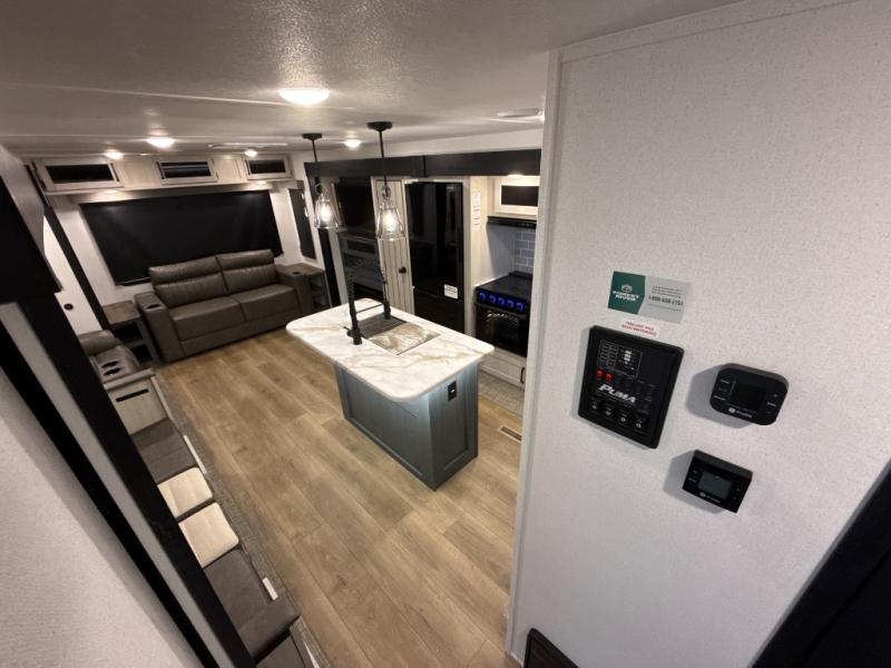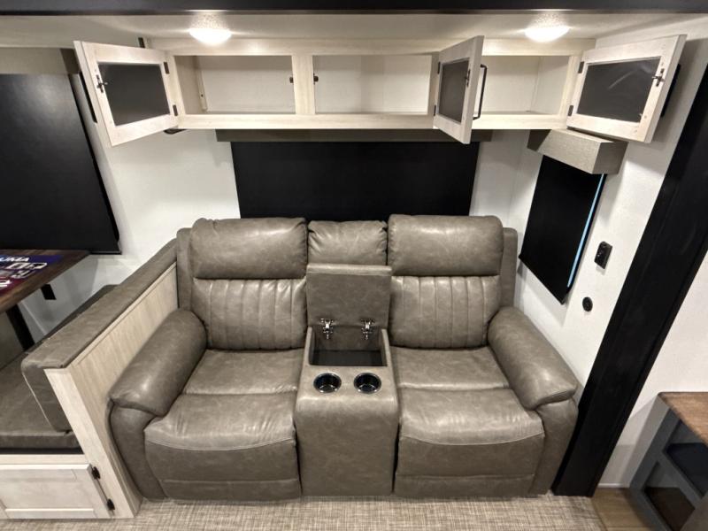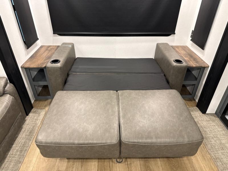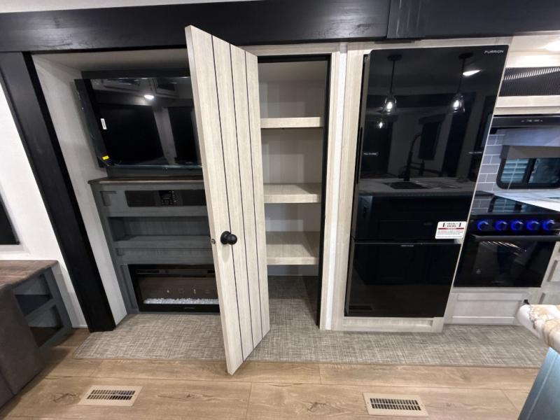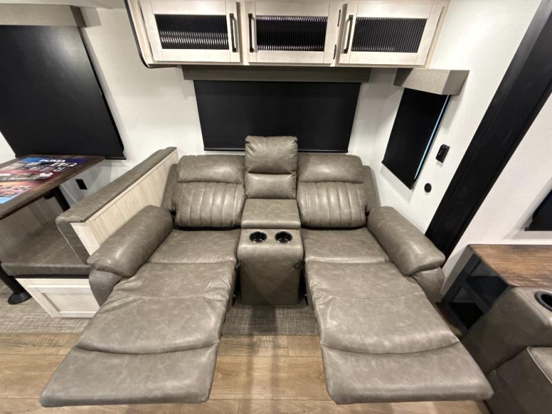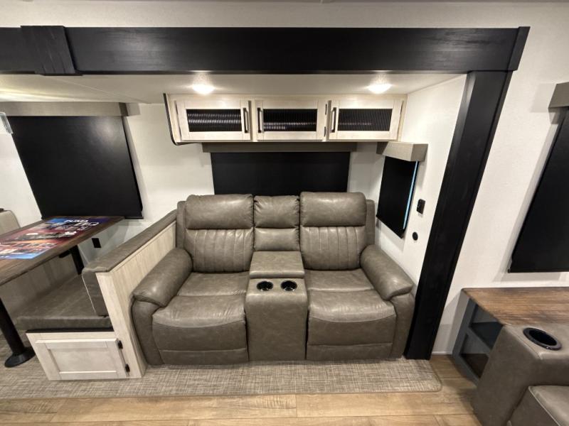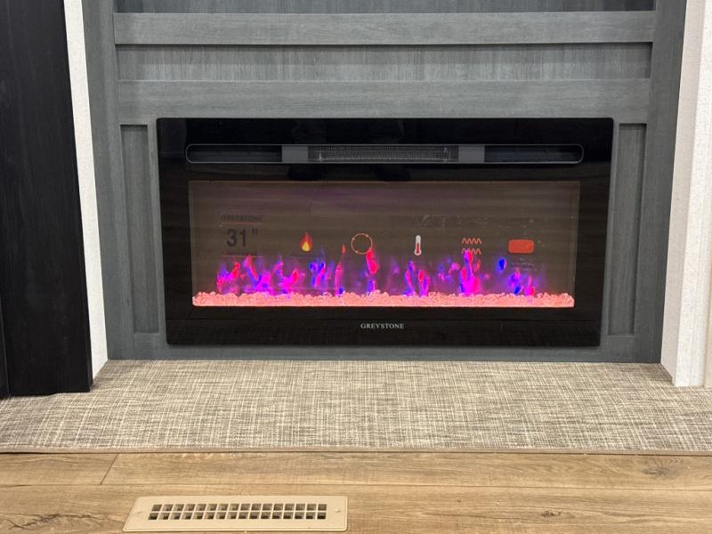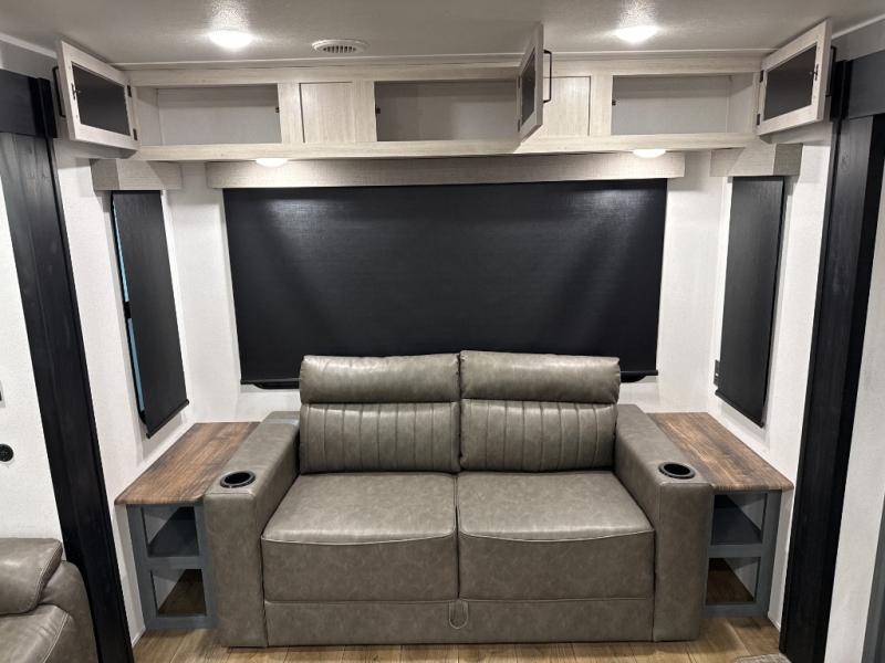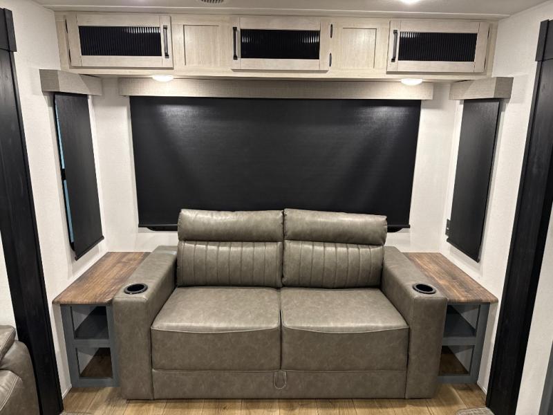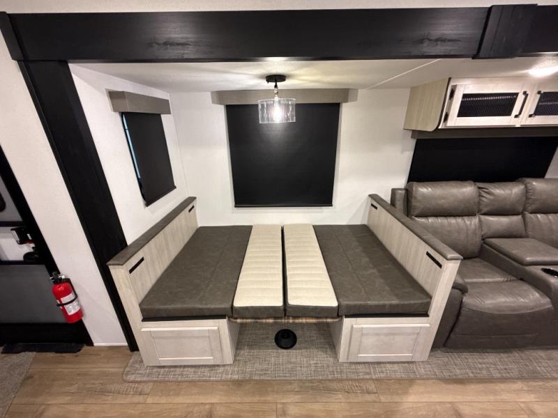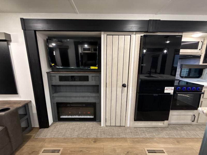 You're going to feel right at home in this travel trailer! The front private bedroom has a queen bed slide for a good night's rest, a dresser and front closet for your clothes, and another closet with washer and dryer prep. Freshen up each morning in the full bathroom with the 32" x 40" shower with a seat and then head to the kitchen to fry up some eggs on the stainless-steel oven and range. You will also appreciate having a kitchen island for easier meal prep and a walk-in pantry to easily see your canned goods and snacks. The booth dinette offers a comfortable place to dine, play, and even sleep once converted. What better way to wind down your nights than to relax on either the rear sofa or on the theater seating across from the entertainment center with a fireplace!