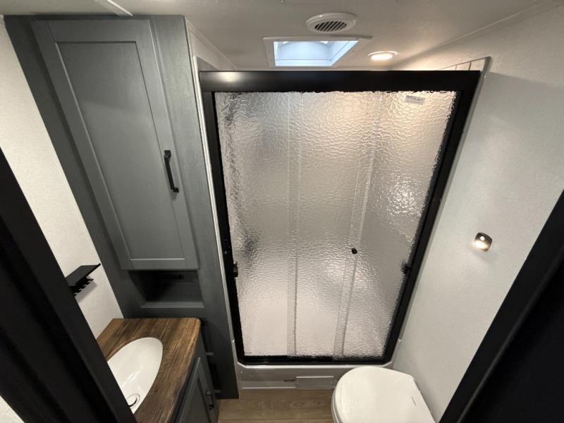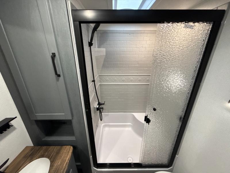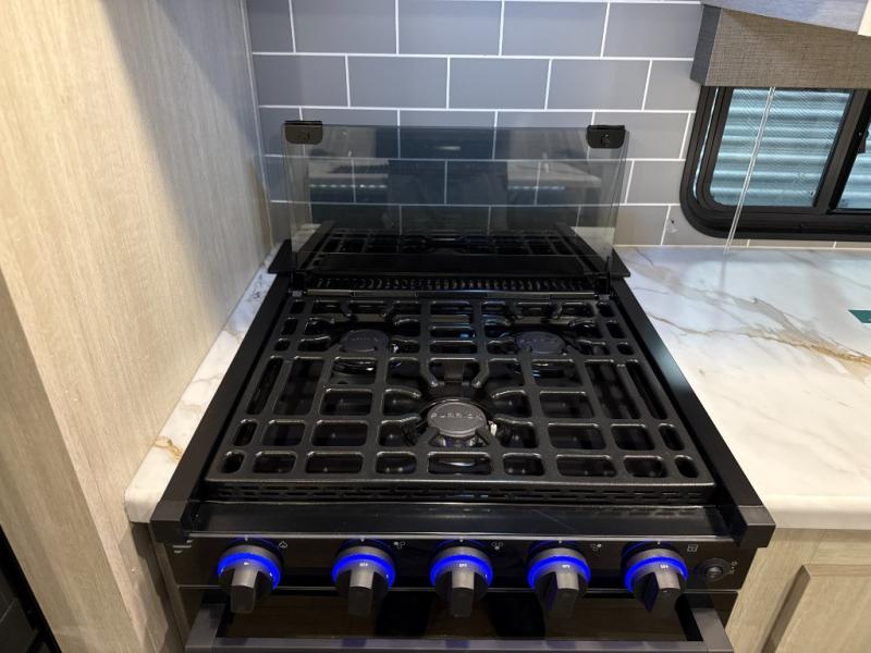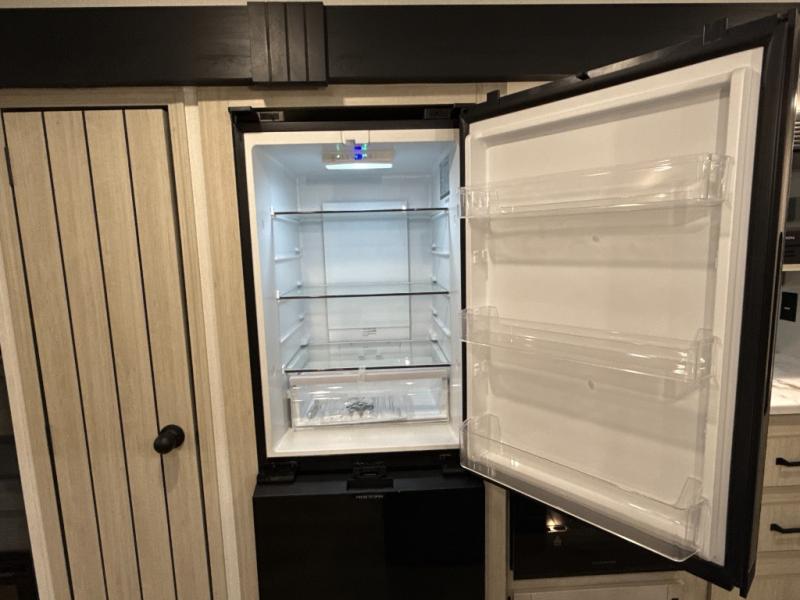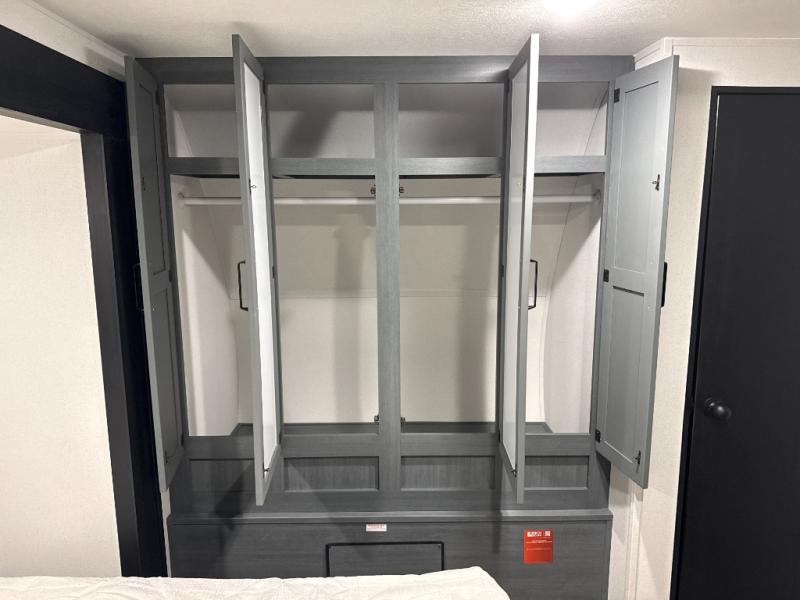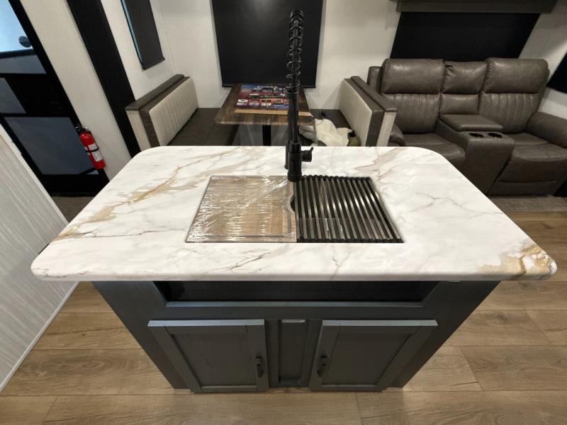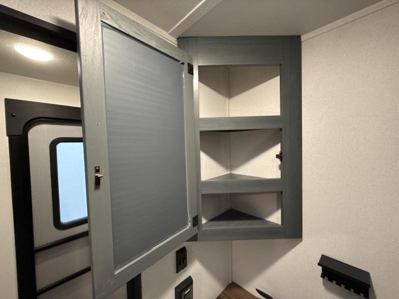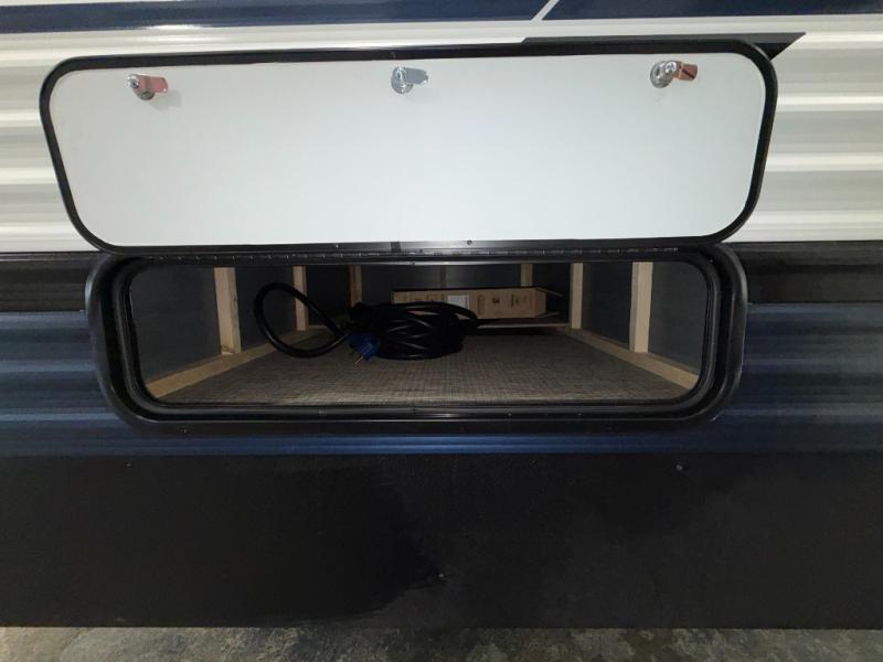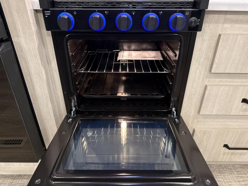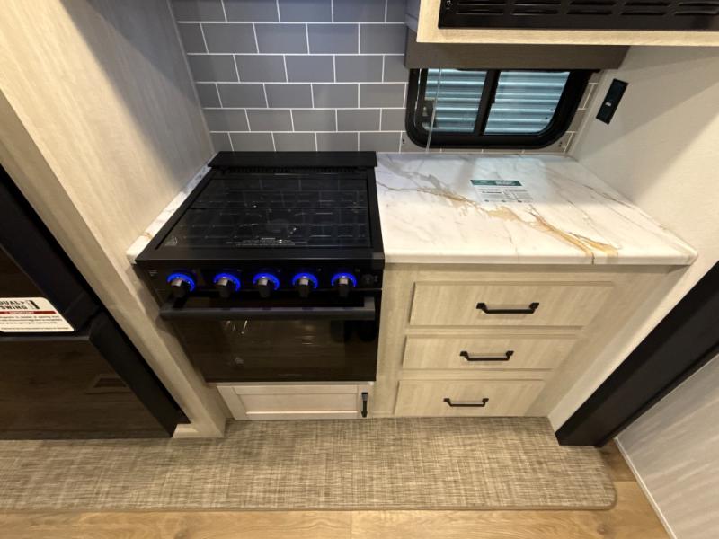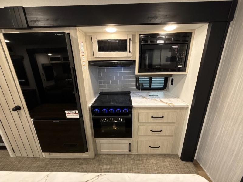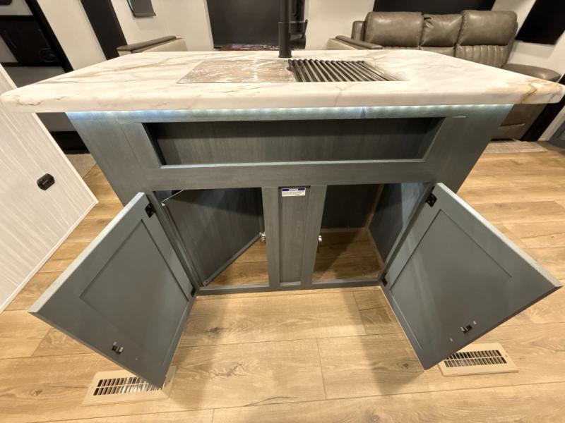 You're going to feel right at home in this travel trailer! The front private bedroom has a queen bed slide for a good night's rest, a dresser and front closet for your clothes, and another closet with washer and dryer prep. Freshen up each morning in the full bathroom with the 32" x 40" shower with a seat and then head to the kitchen to fry up some eggs on the stainless-steel oven and range. You will also appreciate having a kitchen island for easier meal prep and a walk-in pantry to easily see your canned goods and snacks. The booth dinette offers a comfortable place to dine, play, and even sleep once converted. What better way to wind down your nights than to relax on either the rear sofa or on the theater seating across from the entertainment center with a fireplace!