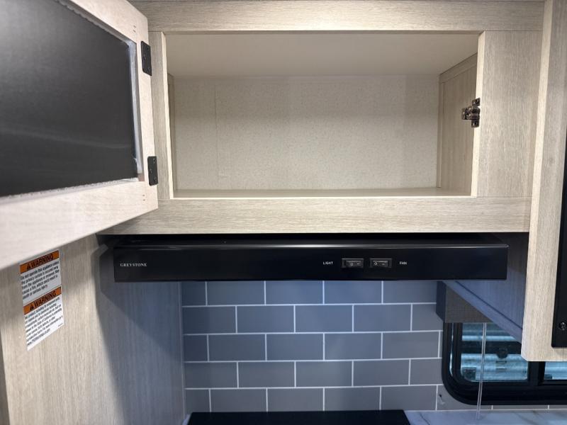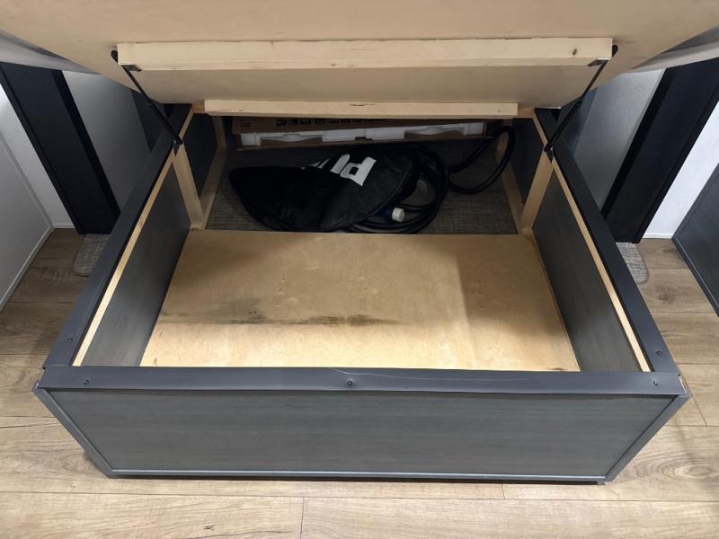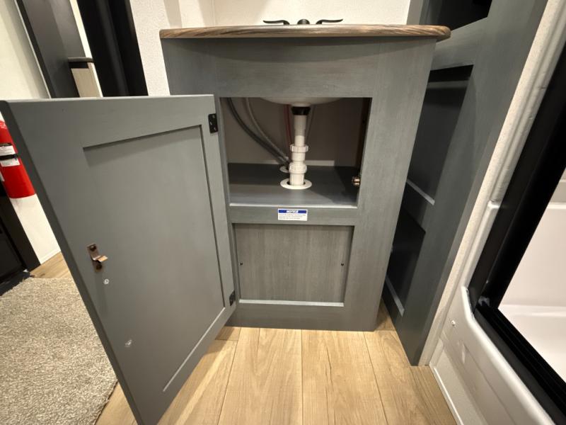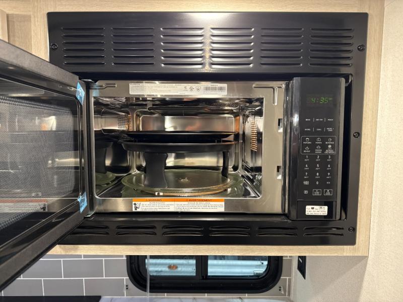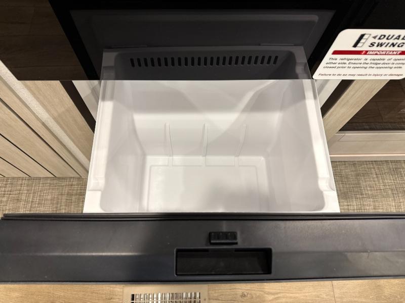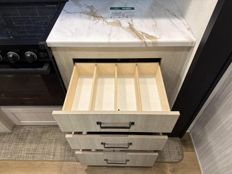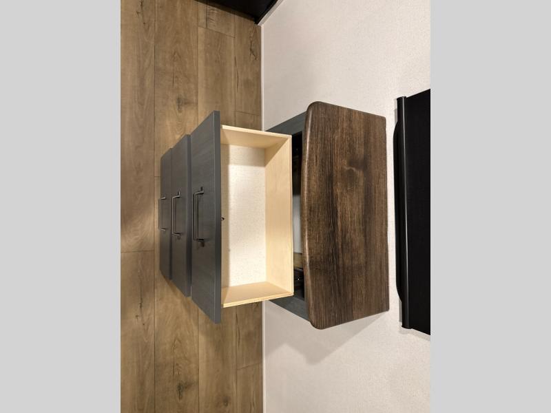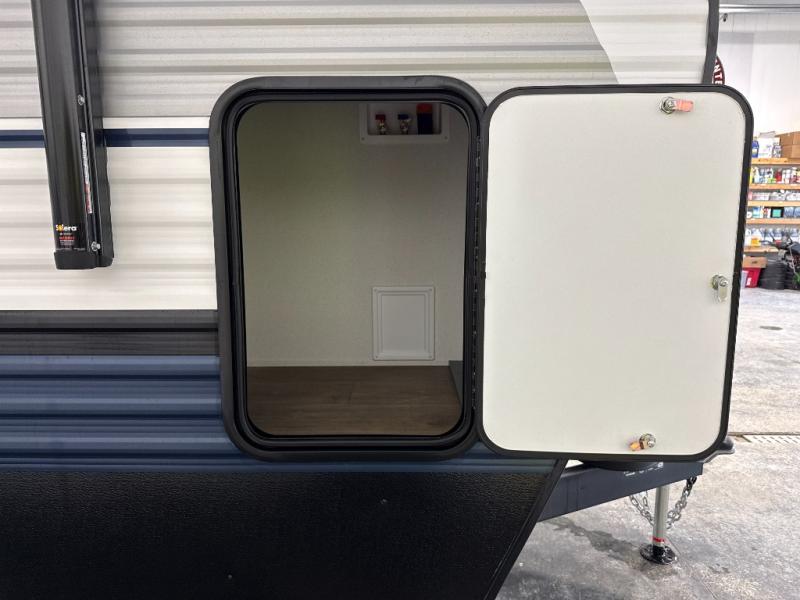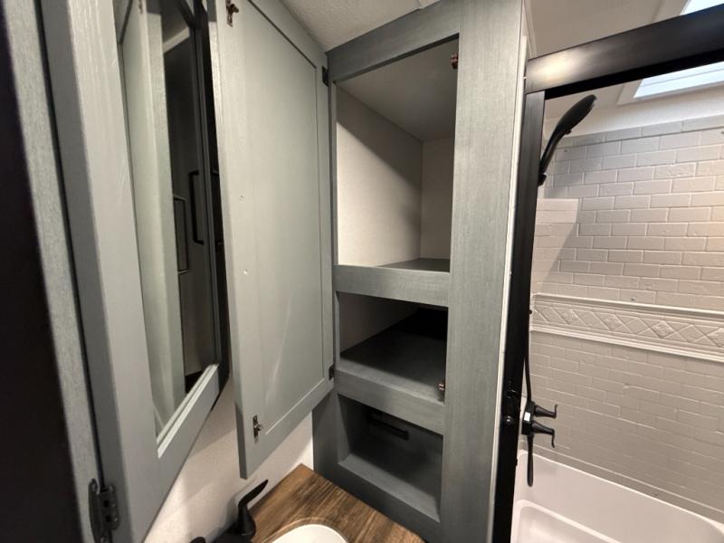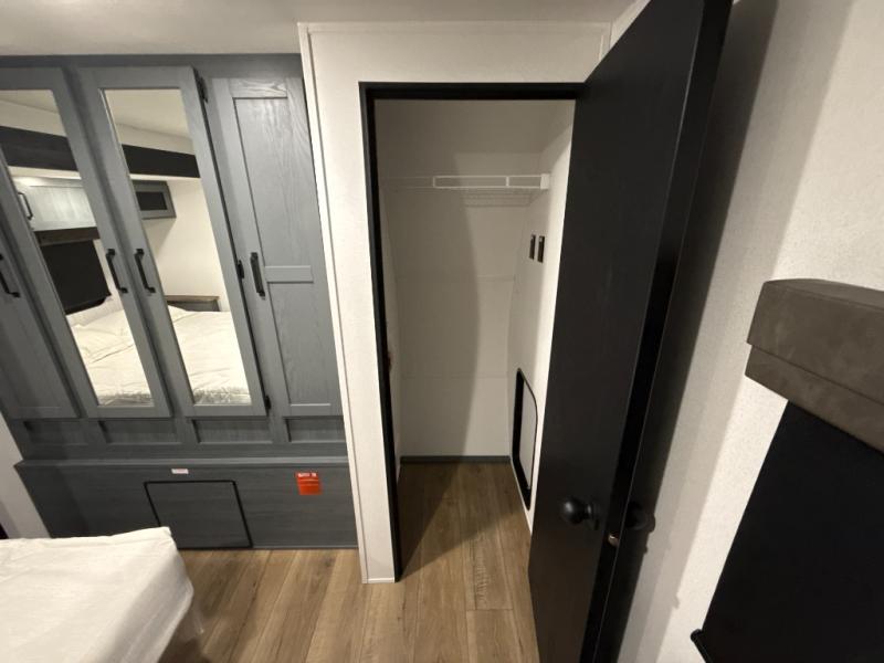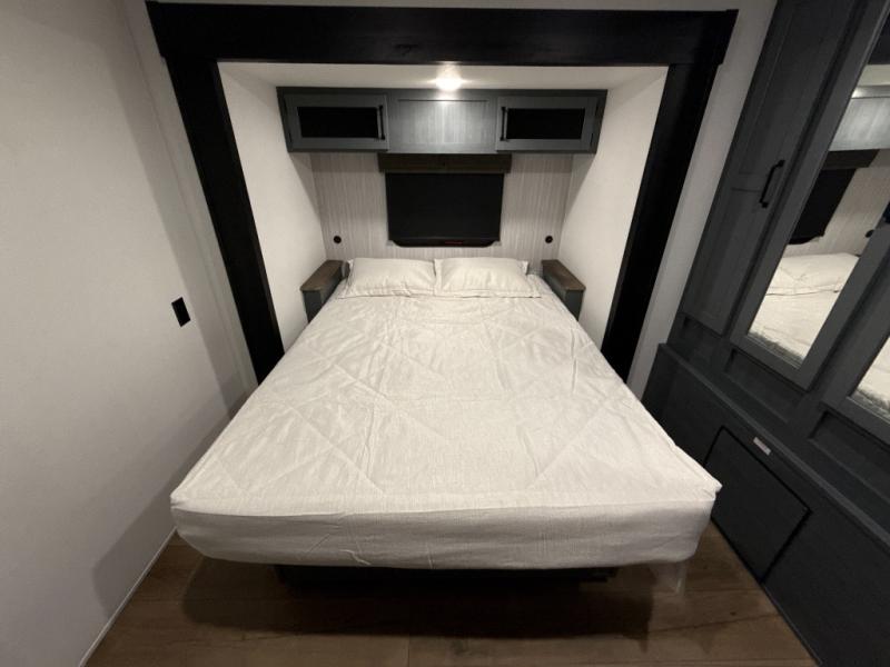 You're going to feel right at home in this travel trailer! The front private bedroom has a queen bed slide for a good night's rest, a dresser and front closet for your clothes, and another closet with washer and dryer prep. Freshen up each morning in the full bathroom with the 32" x 40" shower with a seat and then head to the kitchen to fry up some eggs on the stainless-steel oven and range. You will also appreciate having a kitchen island for easier meal prep and a walk-in pantry to easily see your canned goods and snacks. The booth dinette offers a comfortable place to dine, play, and even sleep once converted. What better way to wind down your nights than to relax on either the rear sofa or on the theater seating across from the entertainment center with a fireplace!