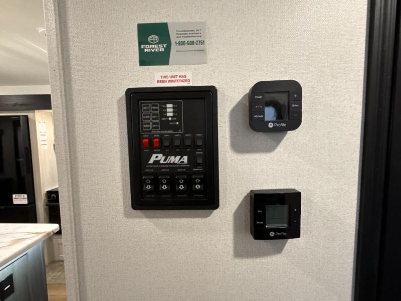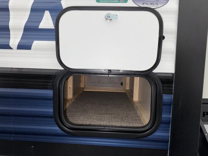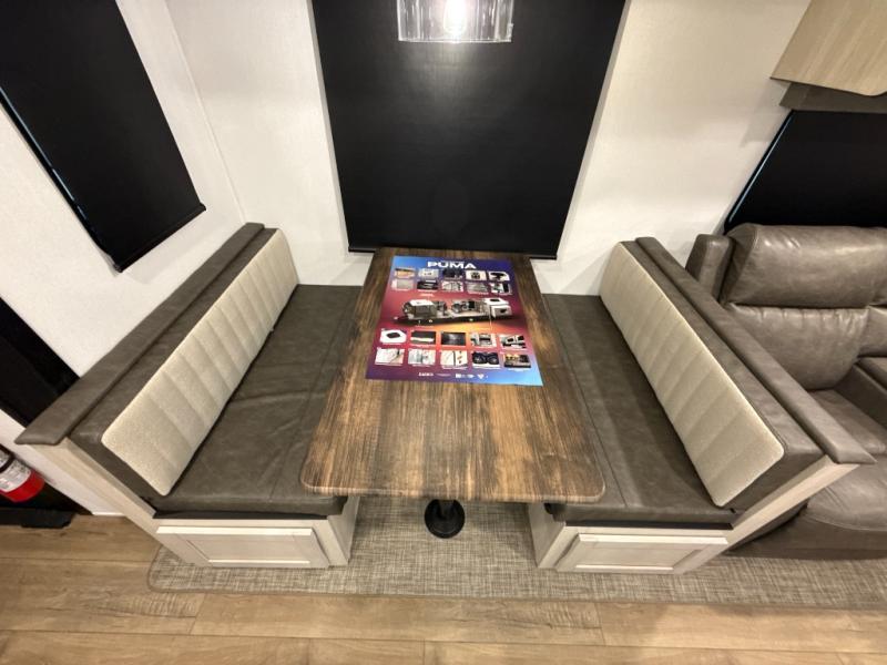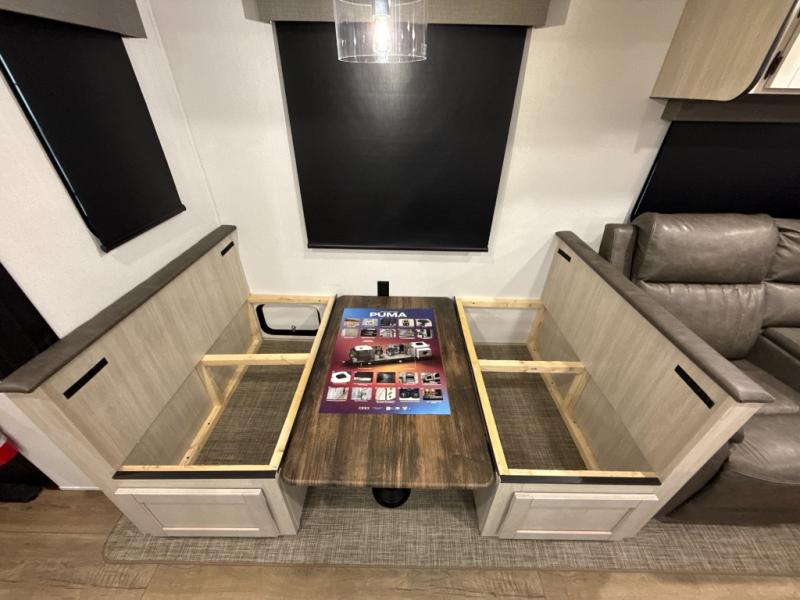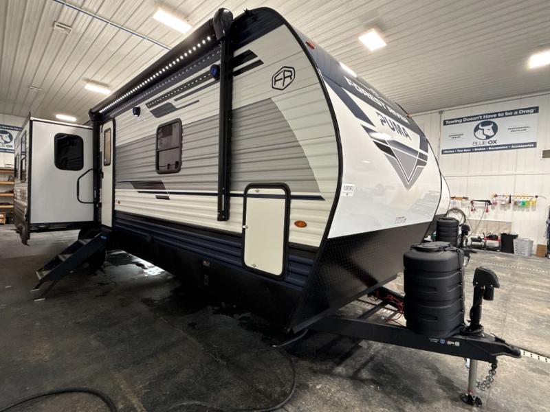 If you're looking for family-fun adventures, then you need one of these Forest River Puma travel trailers! They are built rugged, easy to tow, and jam packed with features. The Darco wrapped underbelly will help protect your unit, and the roof and side mount solar prep gives you the option to add off-grid power. Inside, the Congoleum linoleum will be easy to keep clean, and the night roller shades will provide privacy when it's time to turn in. You'll also enjoy an electric awning with an LED light strip plus an AM/FM/Bluetooth stereo and two outside speakers to keep the party going!