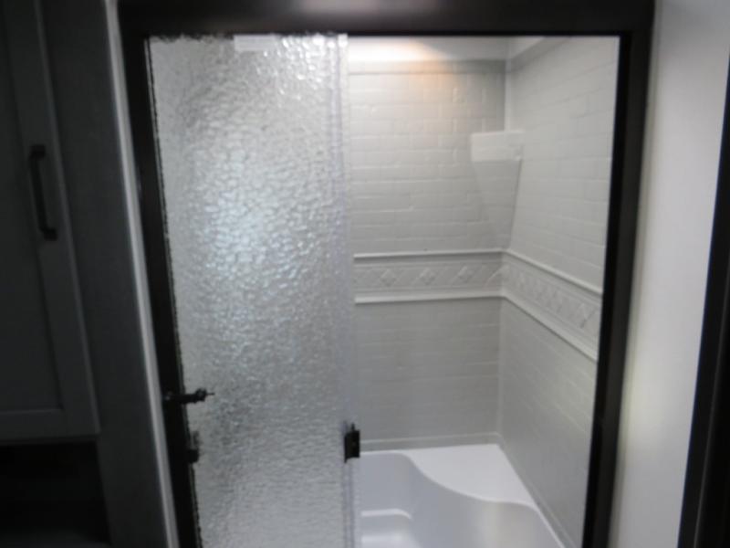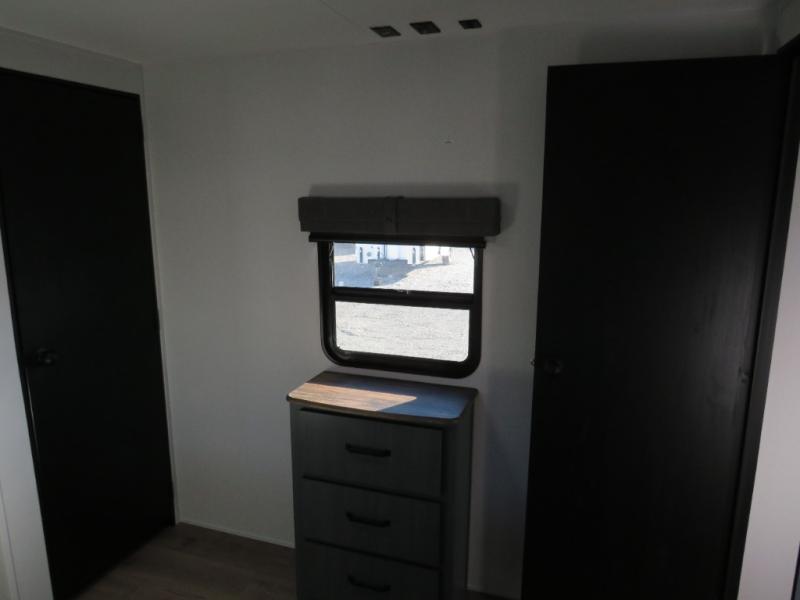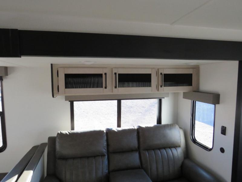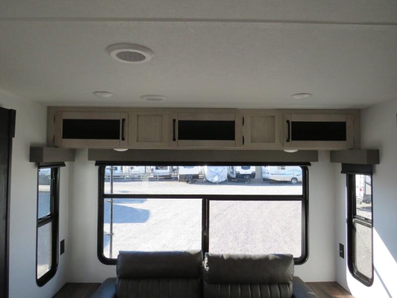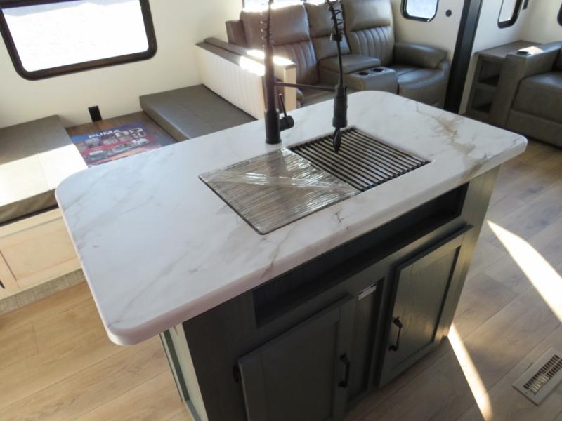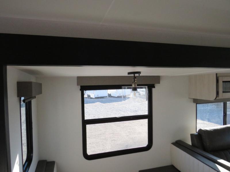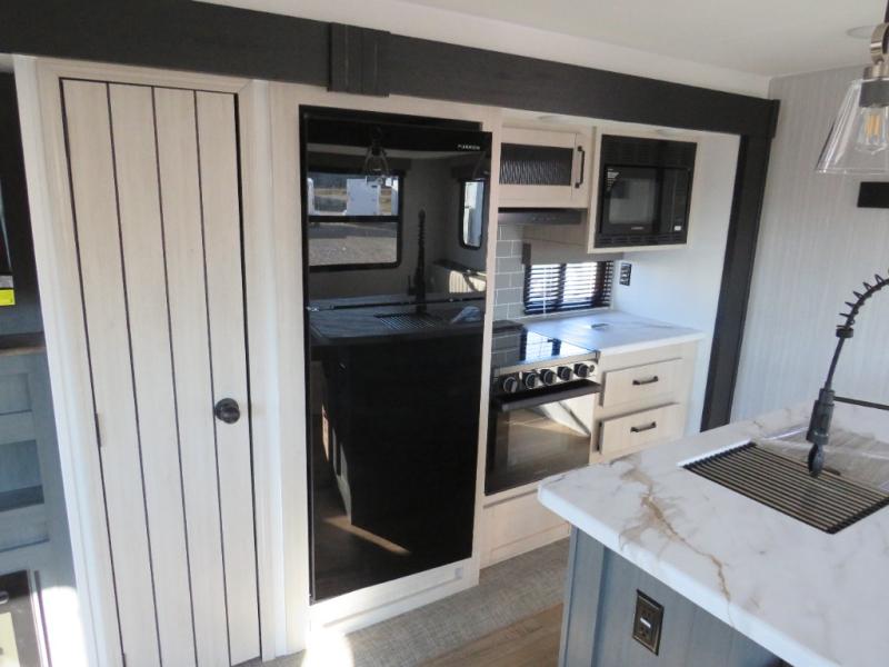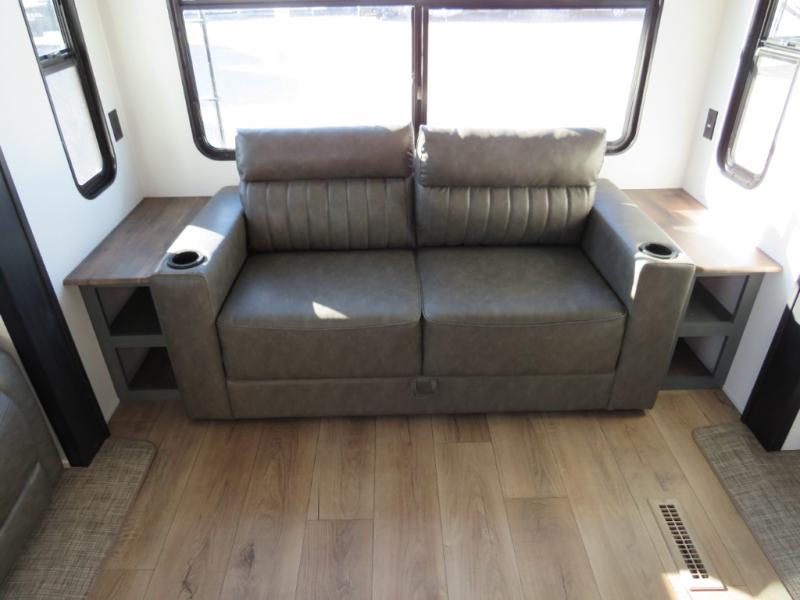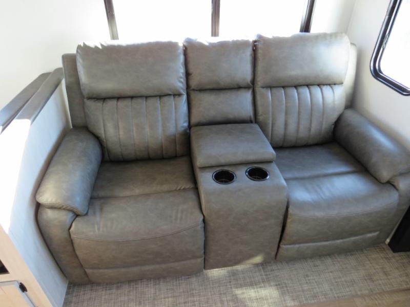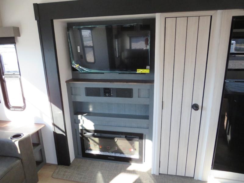 You're going to feel right at home in this travel trailer! The front private bedroom has a queen bed slide for a good night's rest, a dresser and front closet for your clothes, and another closet with washer and dryer prep. Freshen up each morning in the full bathroom with the 32" x 40" shower with a seat and then head to the kitchen to fry up some eggs on the stainless-steel oven and range. You will also appreciate having a kitchen island for easier meal prep and a walk-in pantry to easily see your canned goods and snacks. The booth dinette offers a comfortable place to dine, play, and even sleep once converted. What better way to wind down your nights than to relax on either the rear sofa or on the theater seating across from the entertainment center with a fireplace!