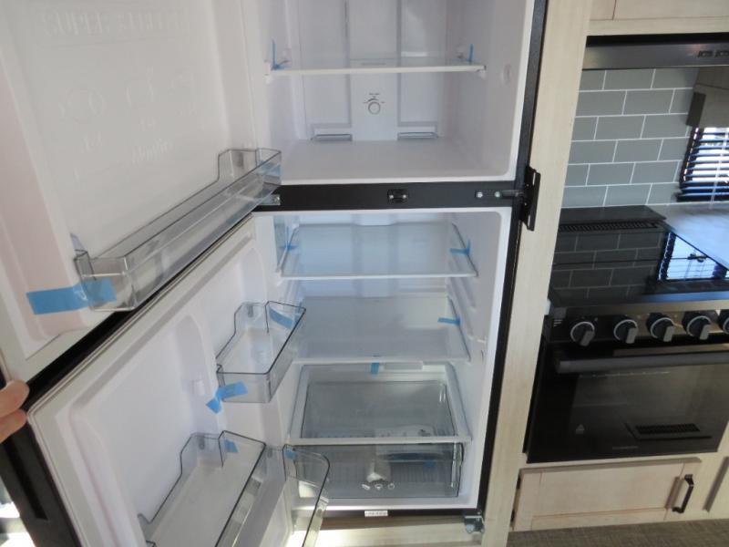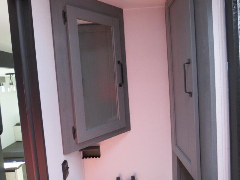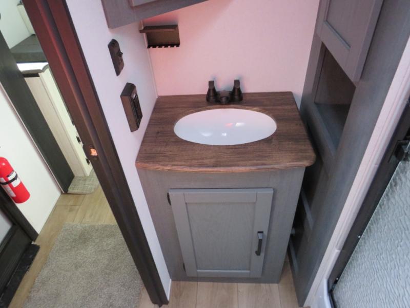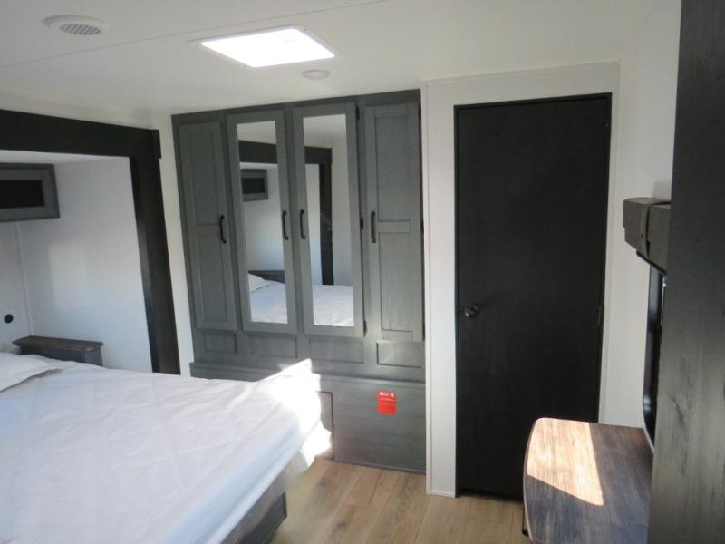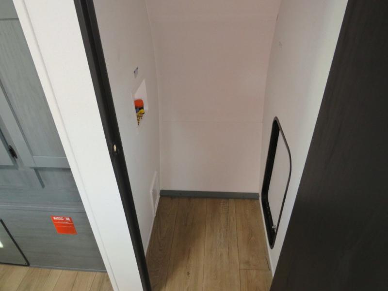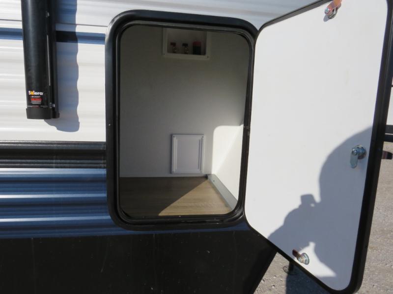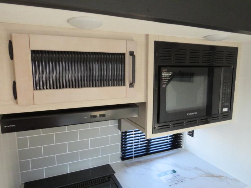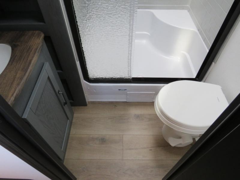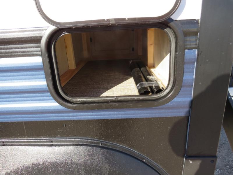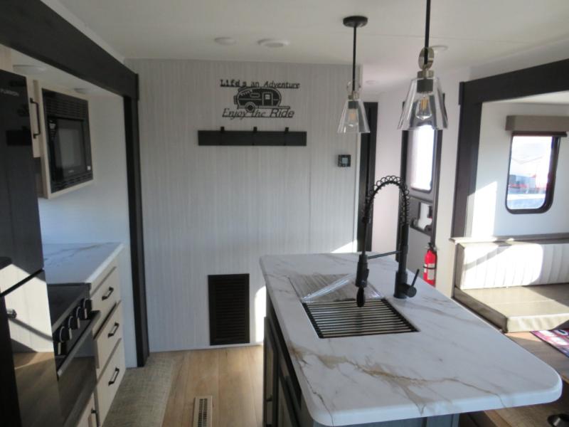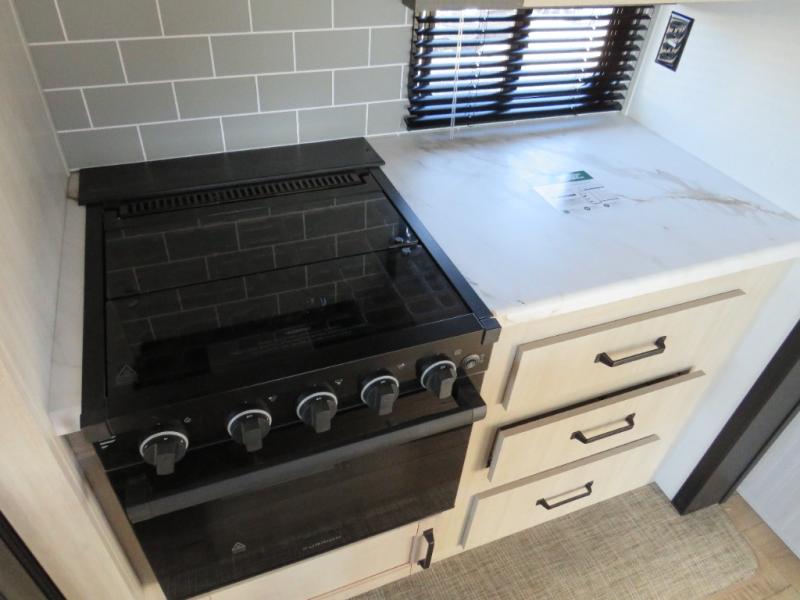 You're going to feel right at home in this travel trailer! The front private bedroom has a queen bed slide for a good night's rest, a dresser and front closet for your clothes, and another closet with washer and dryer prep. Freshen up each morning in the full bathroom with the 32" x 40" shower with a seat and then head to the kitchen to fry up some eggs on the stainless-steel oven and range. You will also appreciate having a kitchen island for easier meal prep and a walk-in pantry to easily see your canned goods and snacks. The booth dinette offers a comfortable place to dine, play, and even sleep once converted. What better way to wind down your nights than to relax on either the rear sofa or on the theater seating across from the entertainment center with a fireplace!