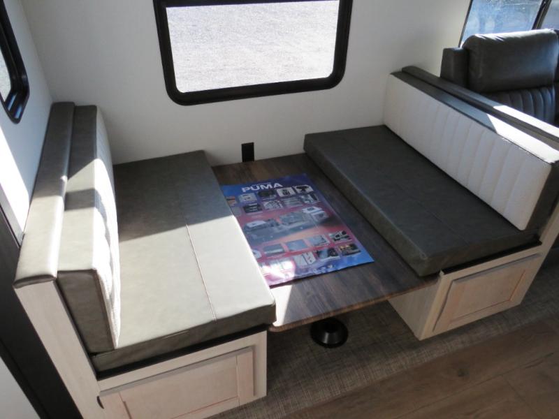 If you're looking for family-fun adventures, then you need one of these Forest River Puma travel trailers! They are built rugged, easy to tow, and jam packed with features. The Darco wrapped underbelly will help protect your unit, and the roof and side mount solar prep gives you the option to add off-grid power. Inside, the Congoleum linoleum will be easy to keep clean, and the night roller shades will provide privacy when it's time to turn in. You'll also enjoy an electric awning with an LED light strip plus an AM/FM/Bluetooth stereo and two outside speakers to keep the party going!
