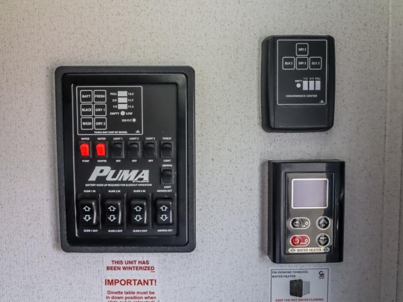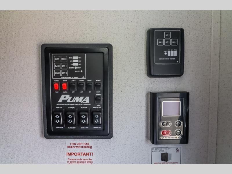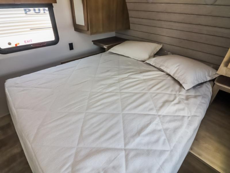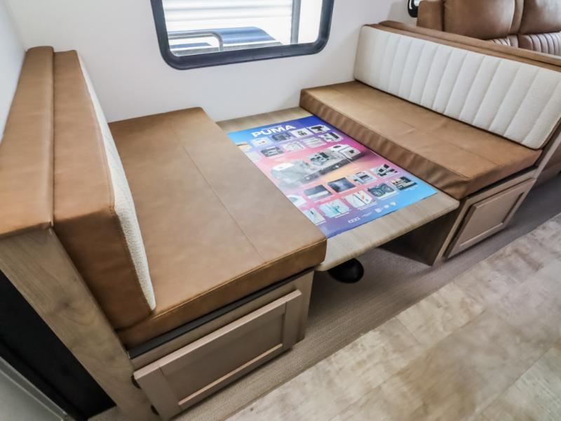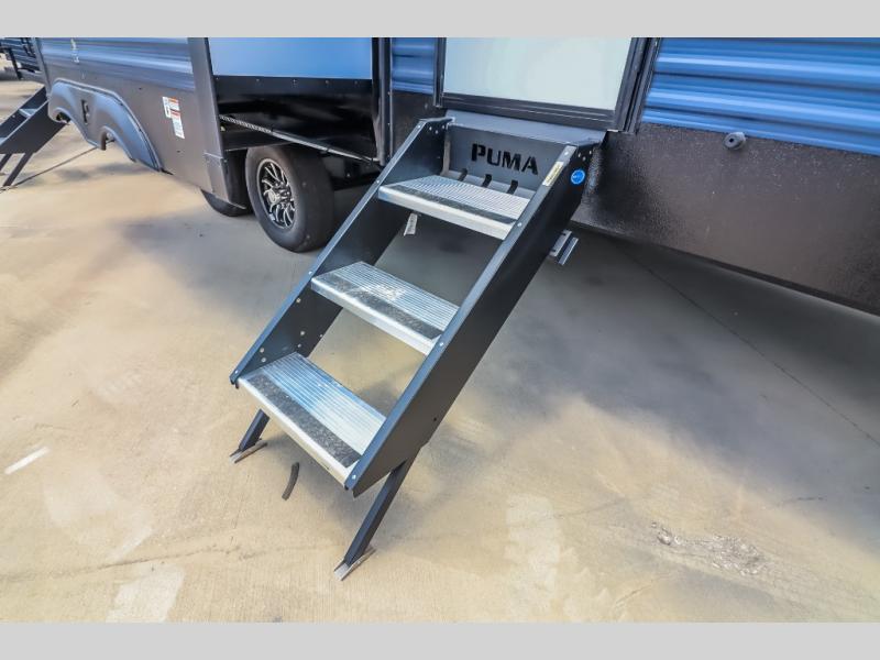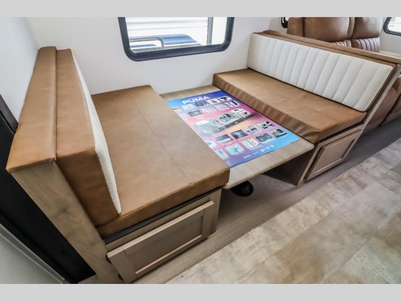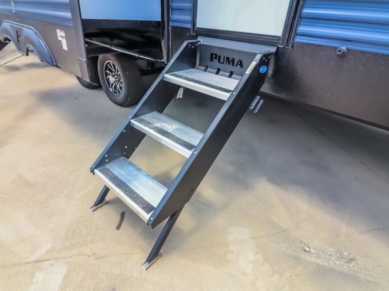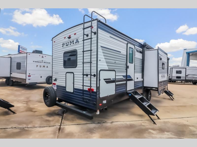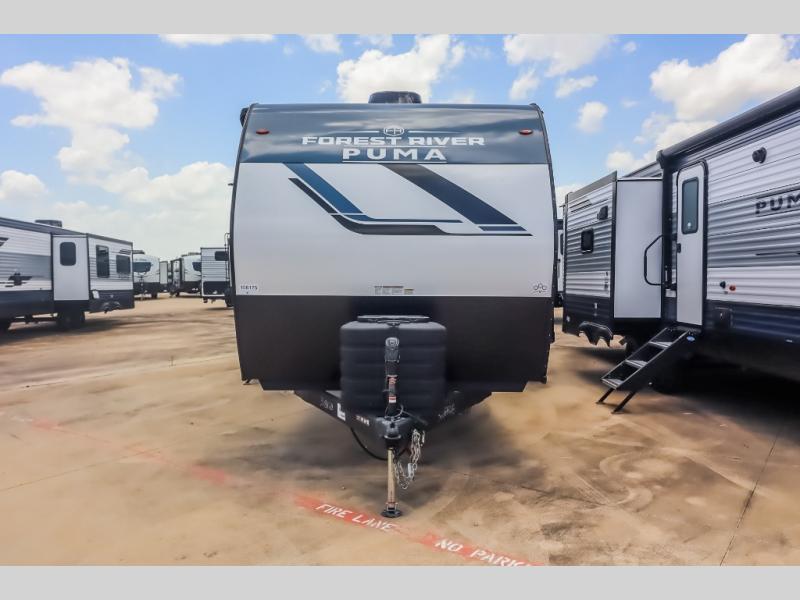 If you're looking for family-fun adventures, then you need one of these Forest River Puma travel trailers! They are built rugged, easy to tow, and jam packed with features. The Darco wrapped underbelly will help protect your unit, and the roof and side mount solar prep gives you the option to add off-grid power. Inside, the Congoleum linoleum will be easy to keep clean, and the night roller shades will provide privacy when it's time to turn in. You'll also enjoy an electric awning with an LED light strip plus an AM/FM/Bluetooth stereo and two outside speakers to keep the party going!