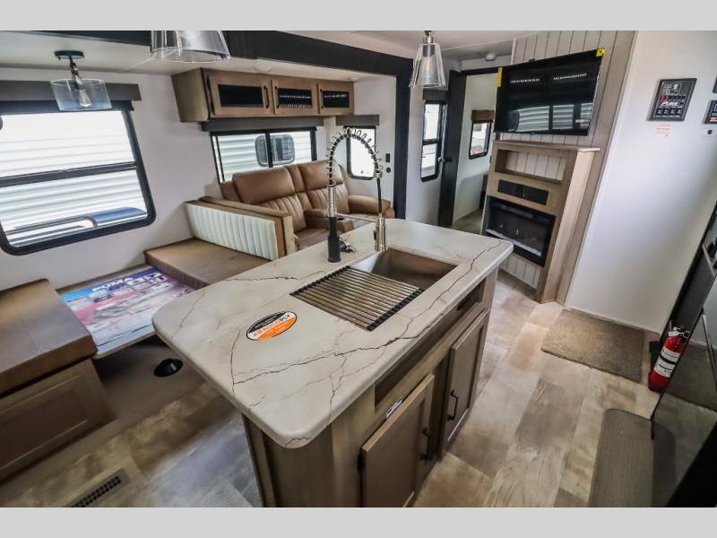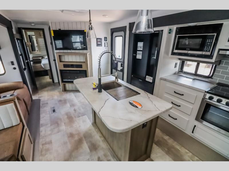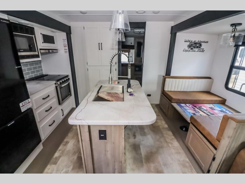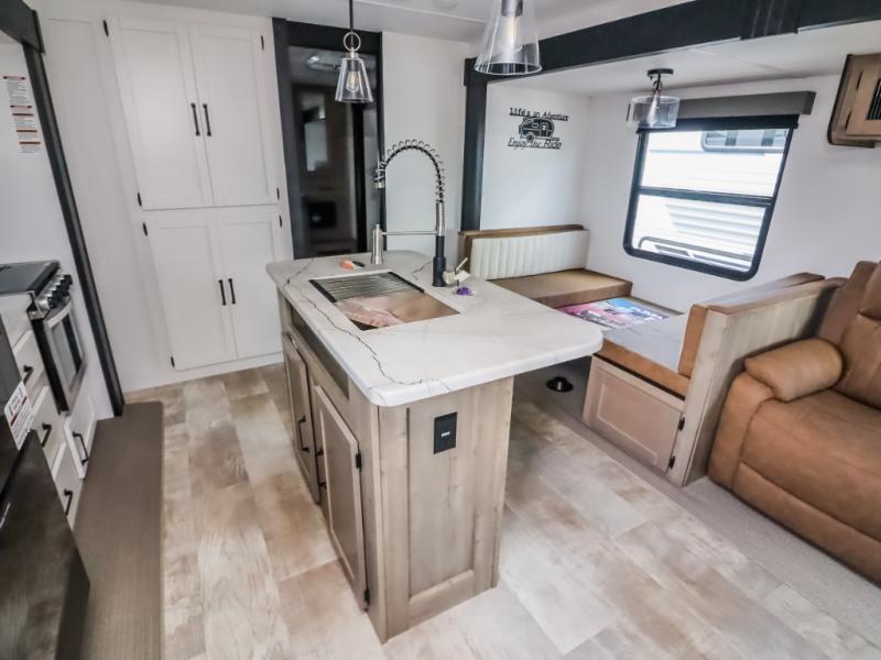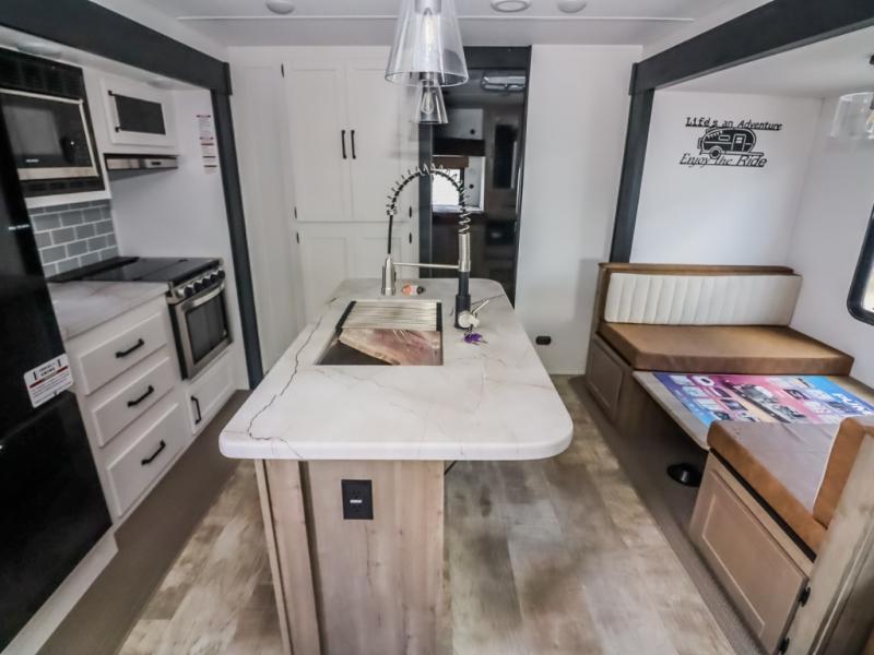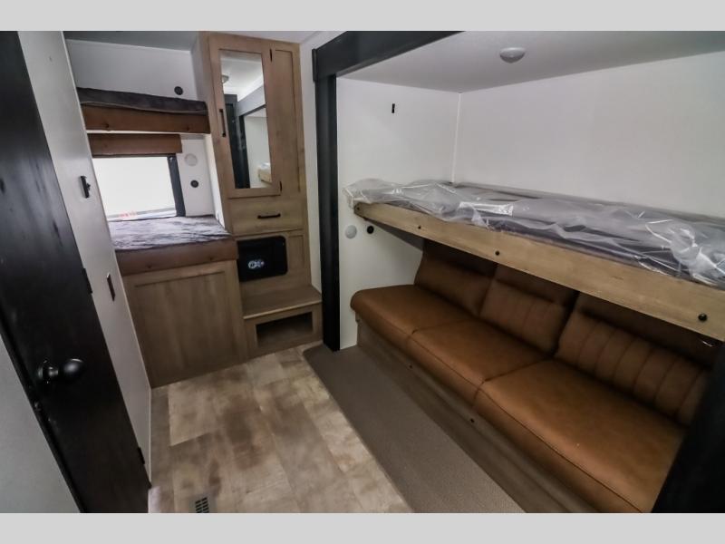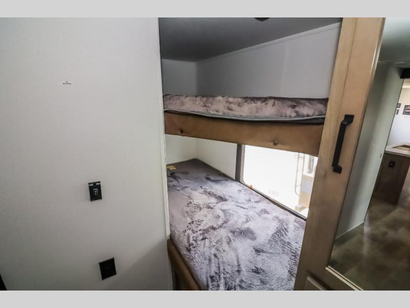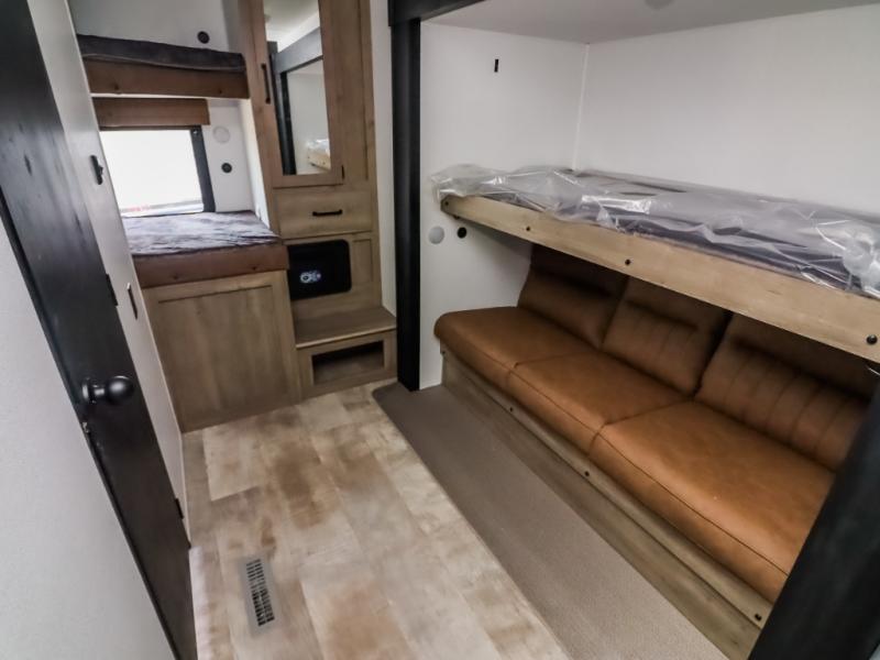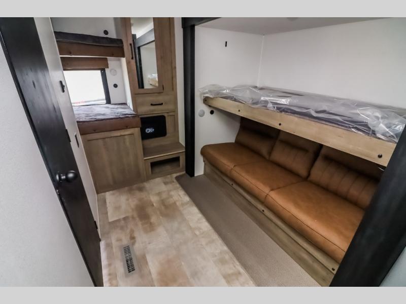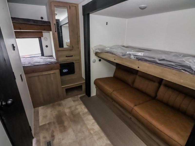 With two full bathrooms, it's a clean decision to take this travel trailer on your next family vacation! Start each morning feeling recharged after sleeping on the queen bed in the front private bedroom or in the rear private bunkhouse with an angled top bunk above a 32" x 69" double bunk bed and a 32" x 69" bunk above a 68" sofa slide. The bunkhouse also has a full bathroom with a 24" x 40" tub and one of the dual entry doors to the unit. You can relax on the sofa while enjoying the entertainment center and eat your meals prepared with the kitchen island at the booth dinette.