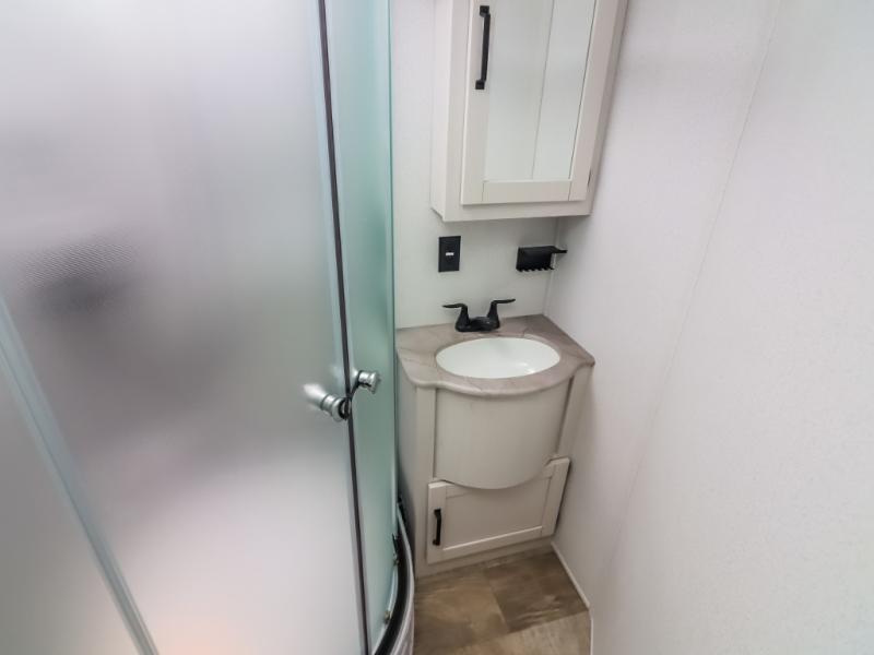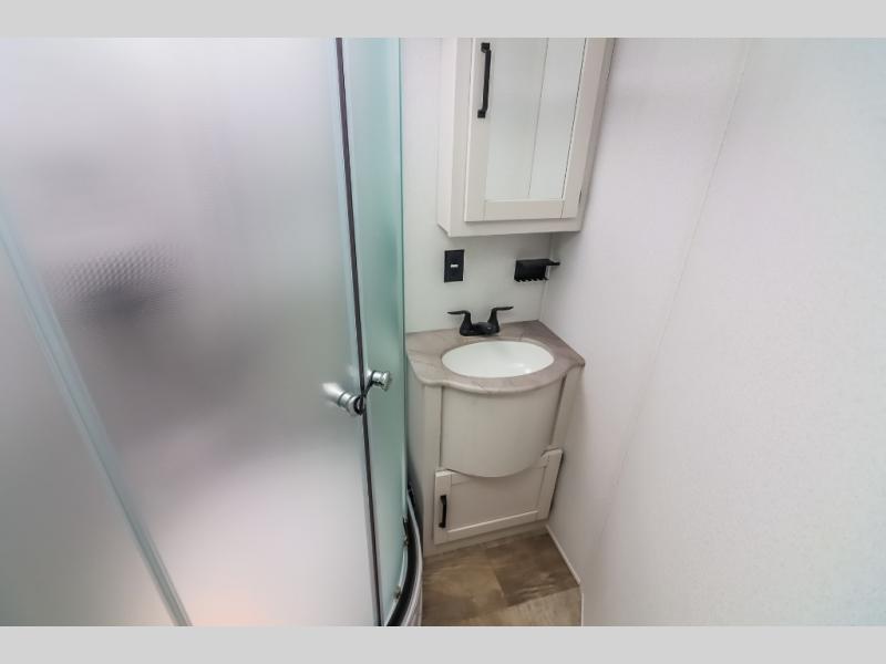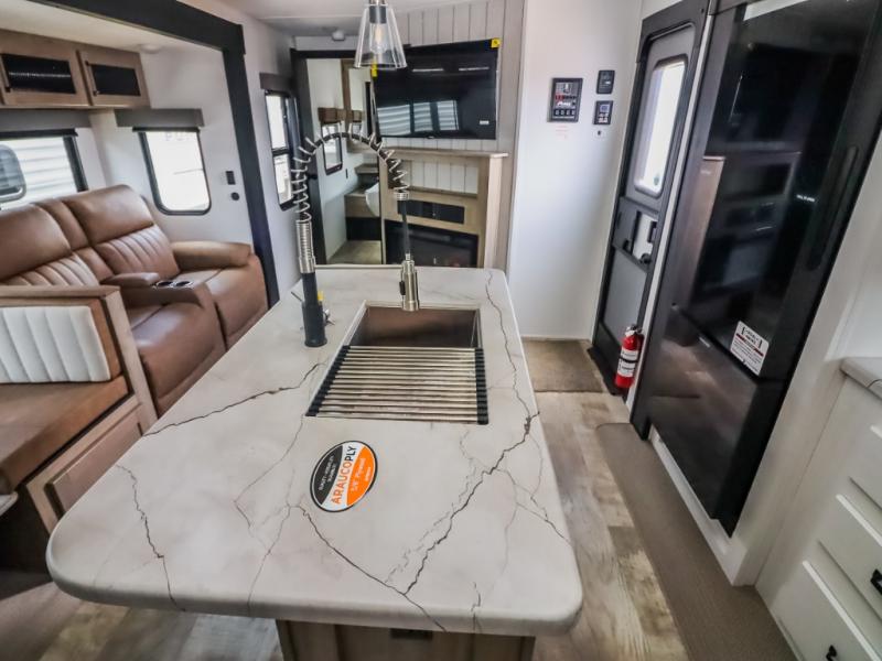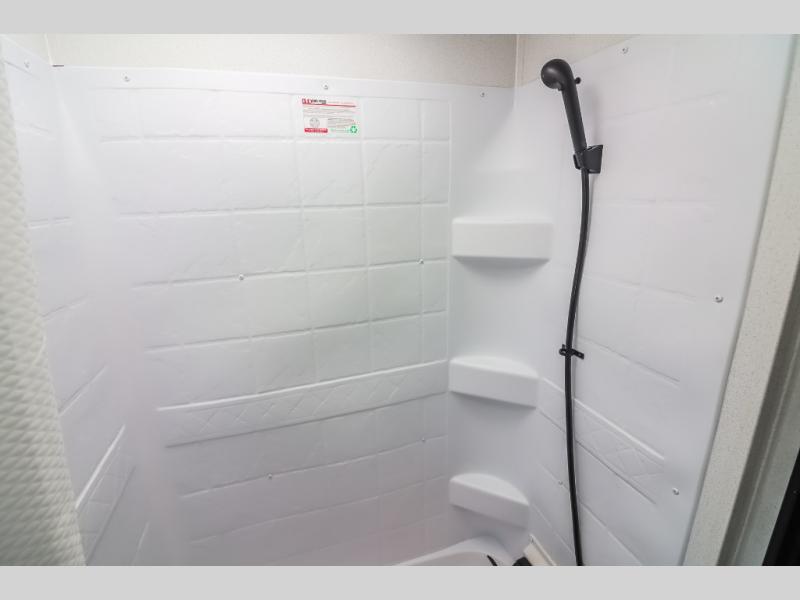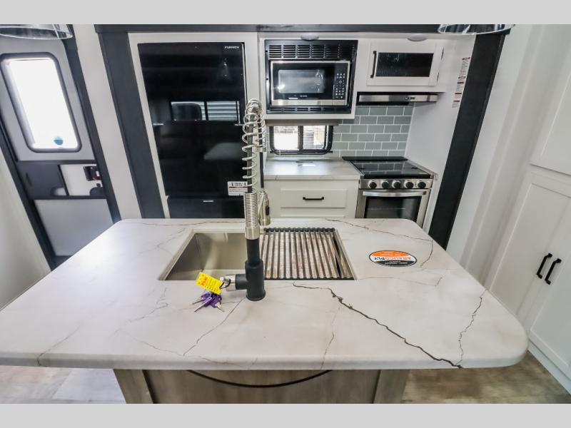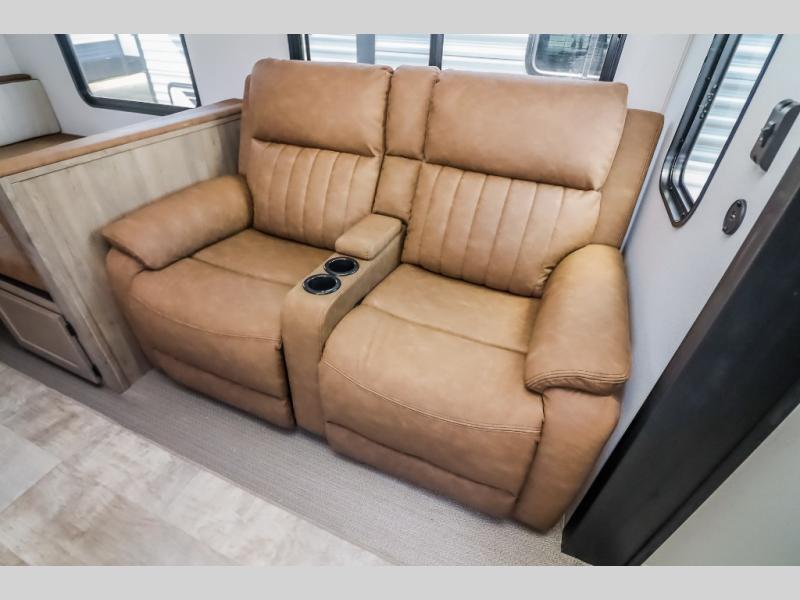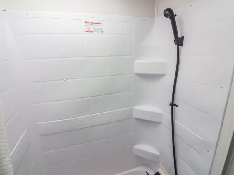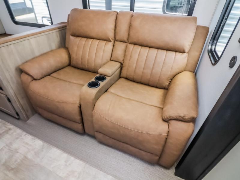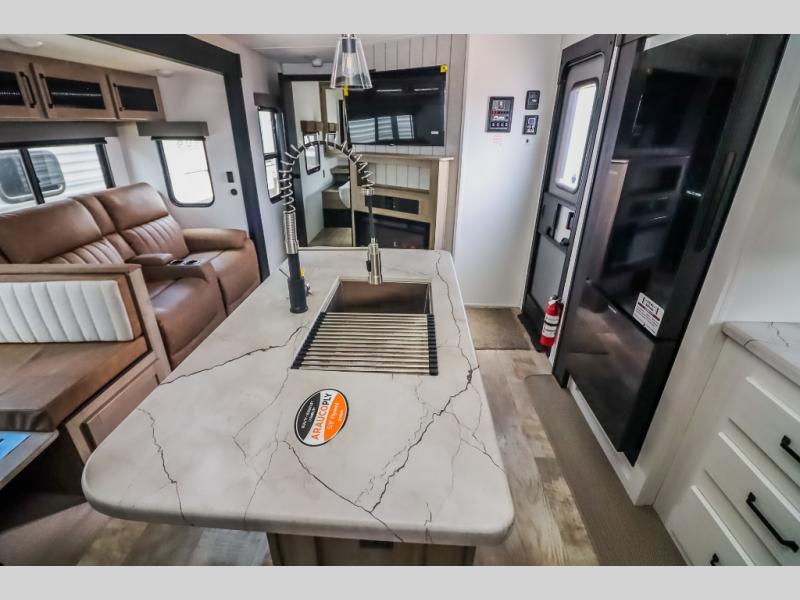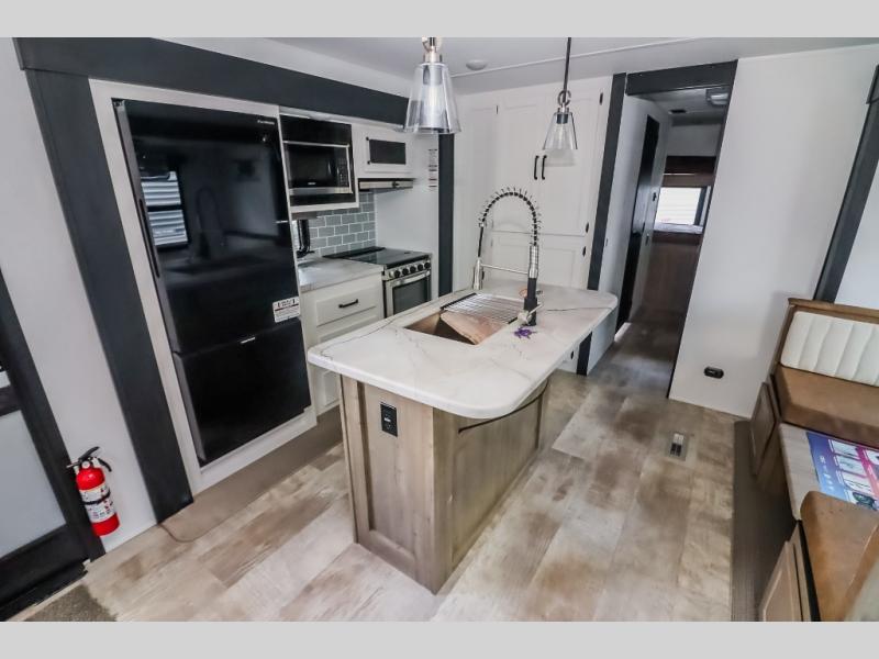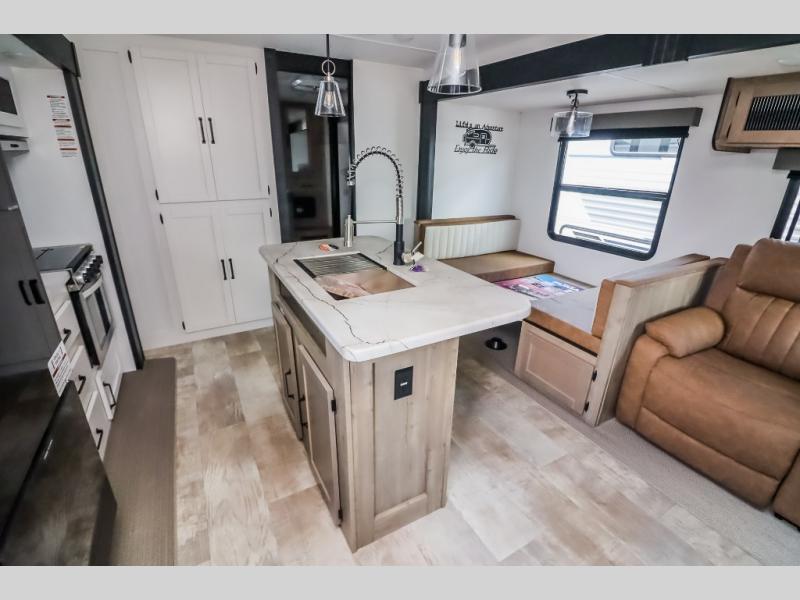 With two full bathrooms, it's a clean decision to take this travel trailer on your next family vacation! Start each morning feeling recharged after sleeping on the queen bed in the front private bedroom or in the rear private bunkhouse with an angled top bunk above a 32" x 69" double bunk bed and a 32" x 69" bunk above a 68" sofa slide. The bunkhouse also has a full bathroom with a 24" x 40" tub and one of the dual entry doors to the unit. You can relax on the sofa while enjoying the entertainment center and eat your meals prepared with the kitchen island at the booth dinette.