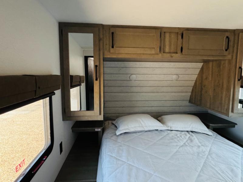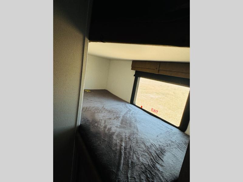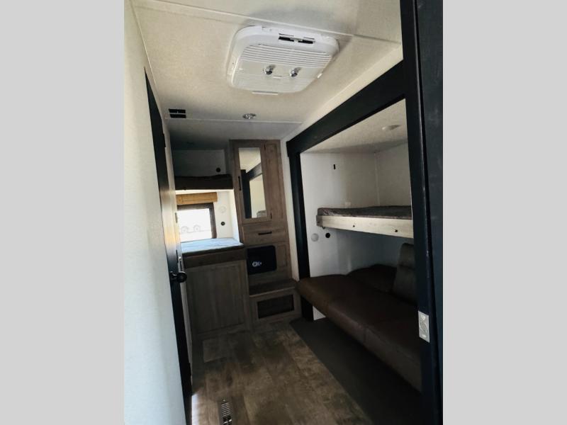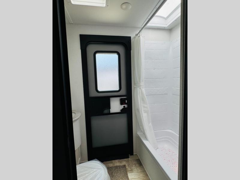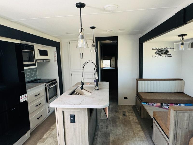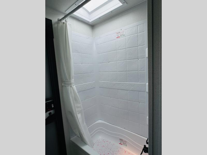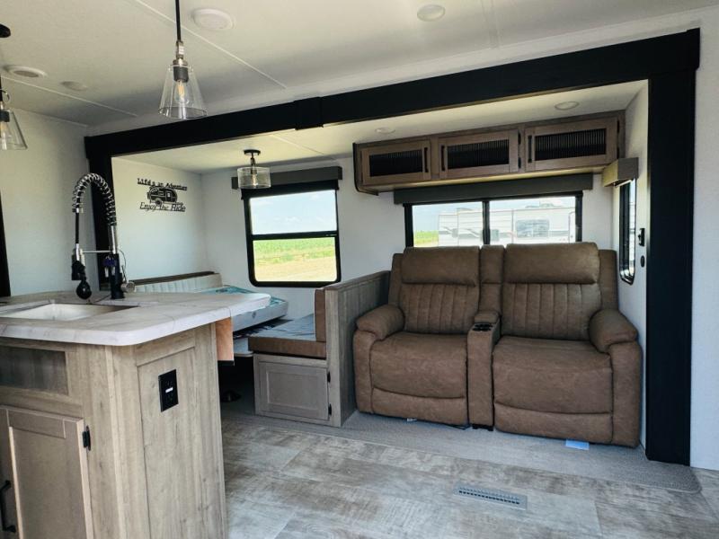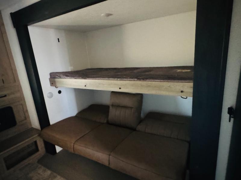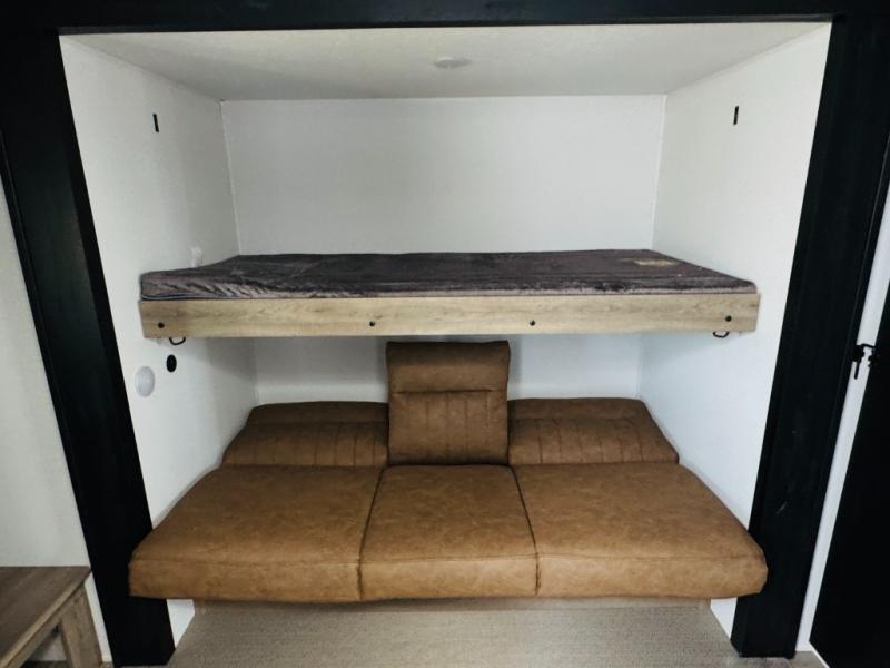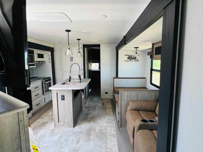 With two full bathrooms, it's a clean decision to take this travel trailer on your next family vacation! Start each morning feeling recharged after sleeping on the queen bed in the front private bedroom or in the rear private bunkhouse with an angled top bunk above a 32" x 69" double bunk bed and a 32" x 69" bunk above a 68" sofa slide. The bunkhouse also has a full bathroom with a 24" x 40" tub and one of the dual entry doors to the unit. You can relax on the sofa while enjoying the entertainment center and eat your meals prepared with the kitchen island at the booth dinette.