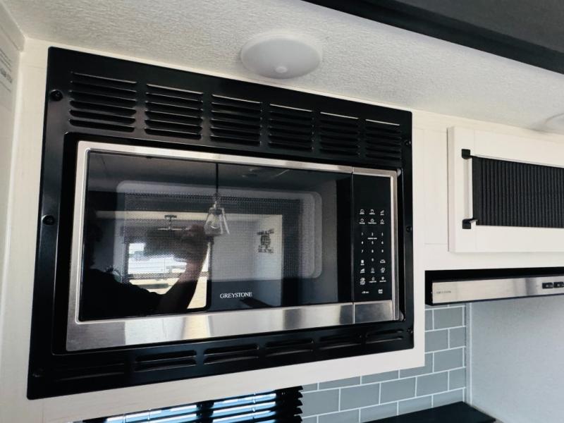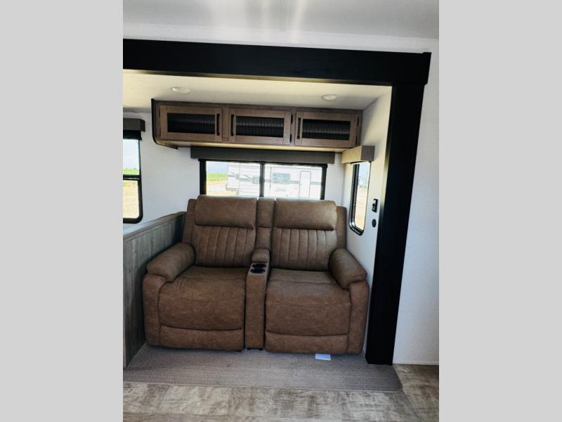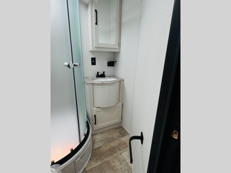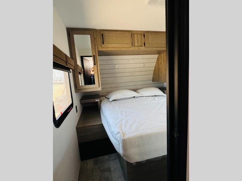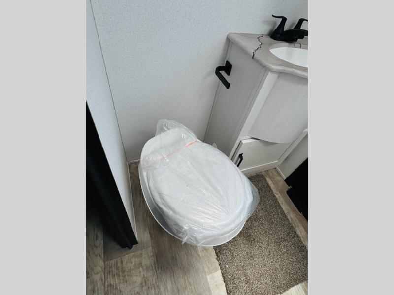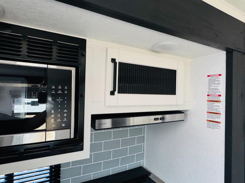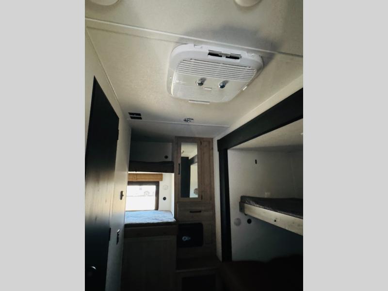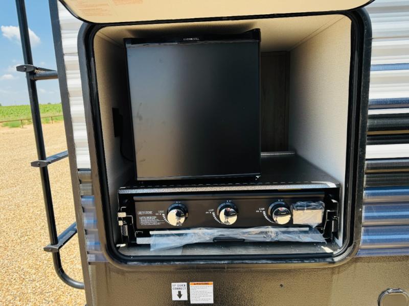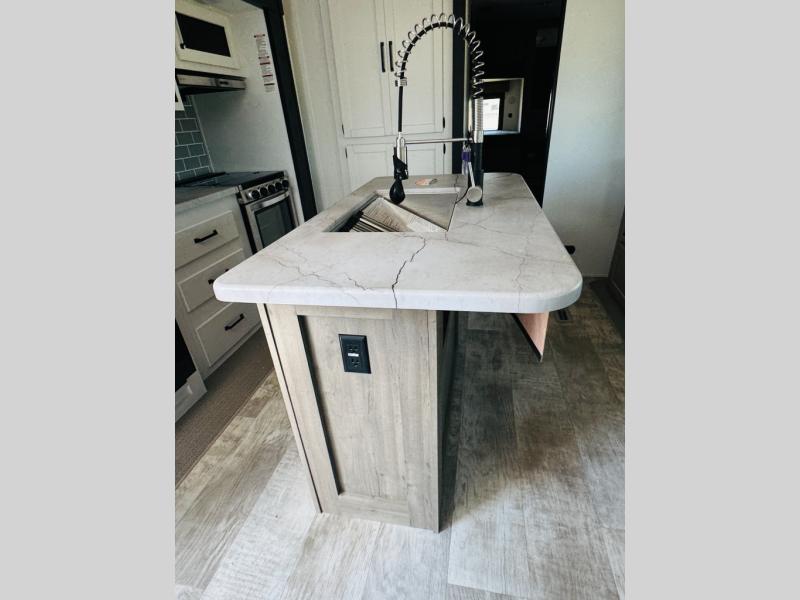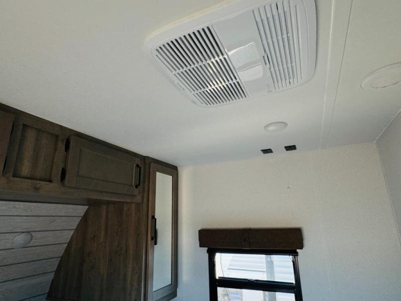 With two full bathrooms, it's a clean decision to take this travel trailer on your next family vacation! Start each morning feeling recharged after sleeping on the queen bed in the front private bedroom or in the rear private bunkhouse with an angled top bunk above a 32" x 69" double bunk bed and a 32" x 69" bunk above a 68" sofa slide. The bunkhouse also has a full bathroom with a 24" x 40" tub and one of the dual entry doors to the unit. You can relax on the sofa while enjoying the entertainment center and eat your meals prepared with the kitchen island at the booth dinette.