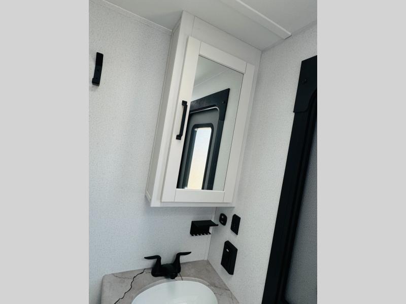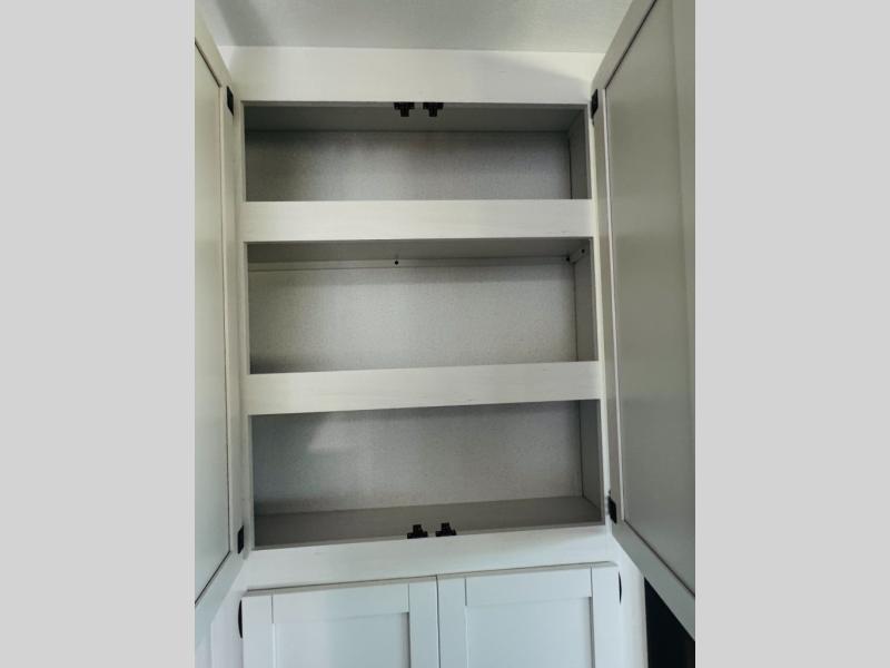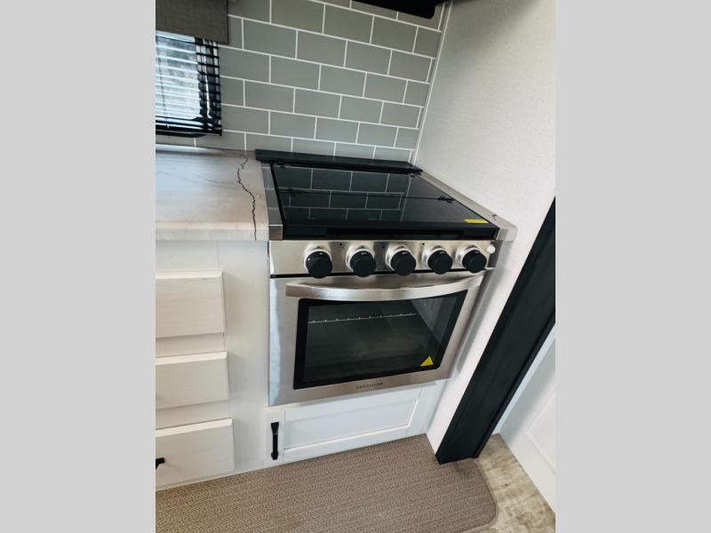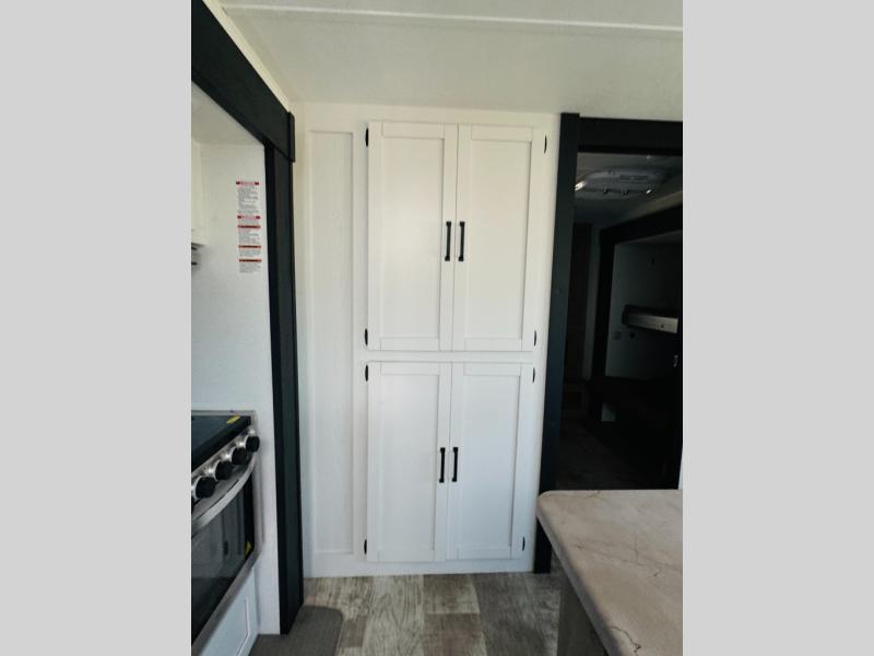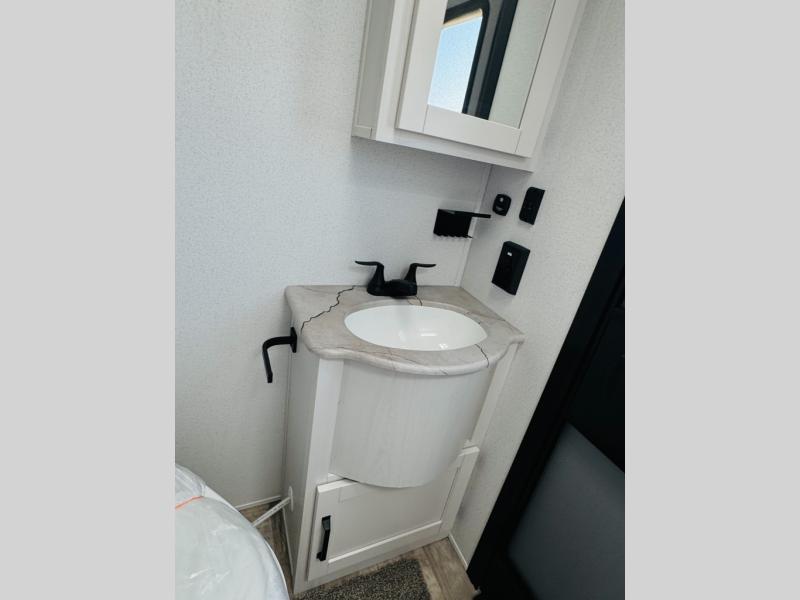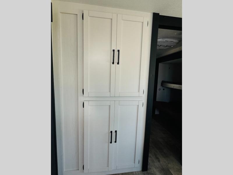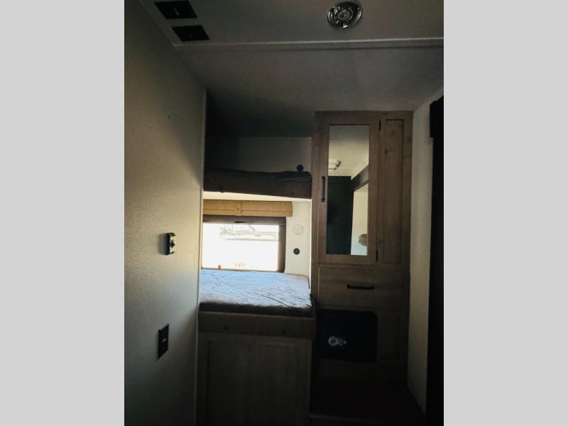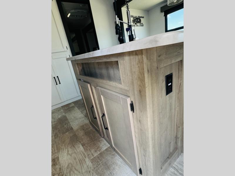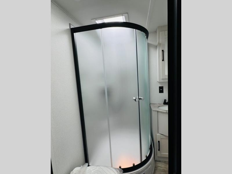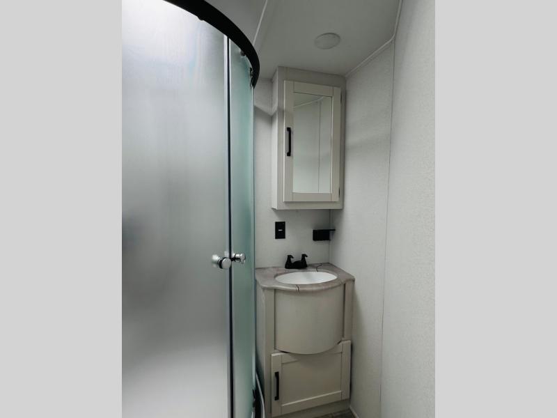 With two full bathrooms, it's a clean decision to take this travel trailer on your next family vacation! Start each morning feeling recharged after sleeping on the queen bed in the front private bedroom or in the rear private bunkhouse with an angled top bunk above a 32" x 69" double bunk bed and a 32" x 69" bunk above a 68" sofa slide. The bunkhouse also has a full bathroom with a 24" x 40" tub and one of the dual entry doors to the unit. You can relax on the sofa while enjoying the entertainment center and eat your meals prepared with the kitchen island at the booth dinette.