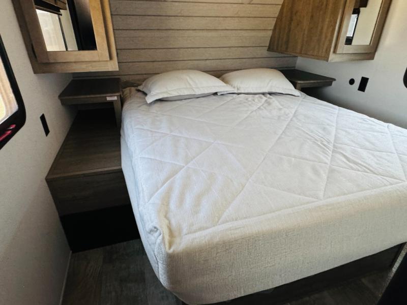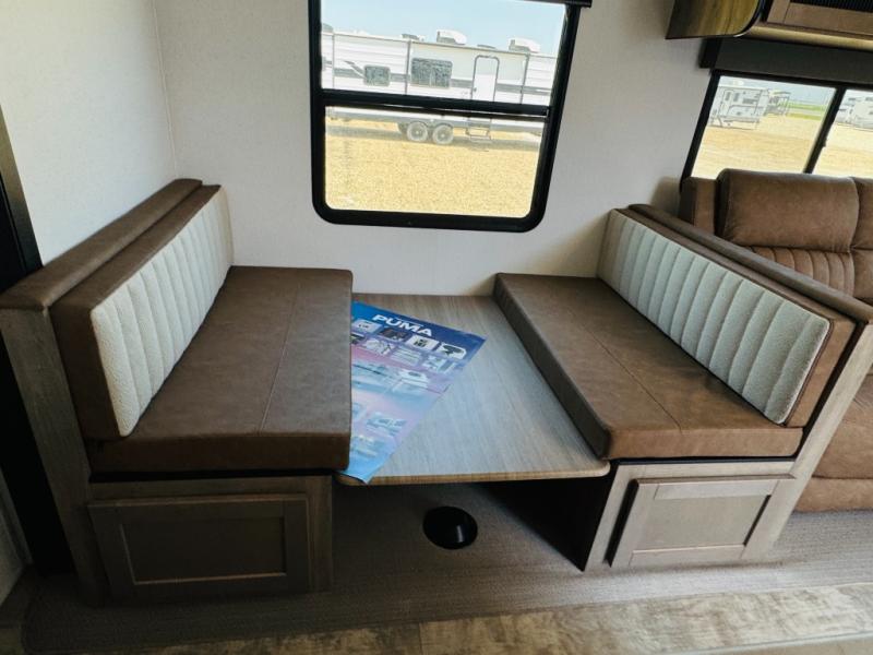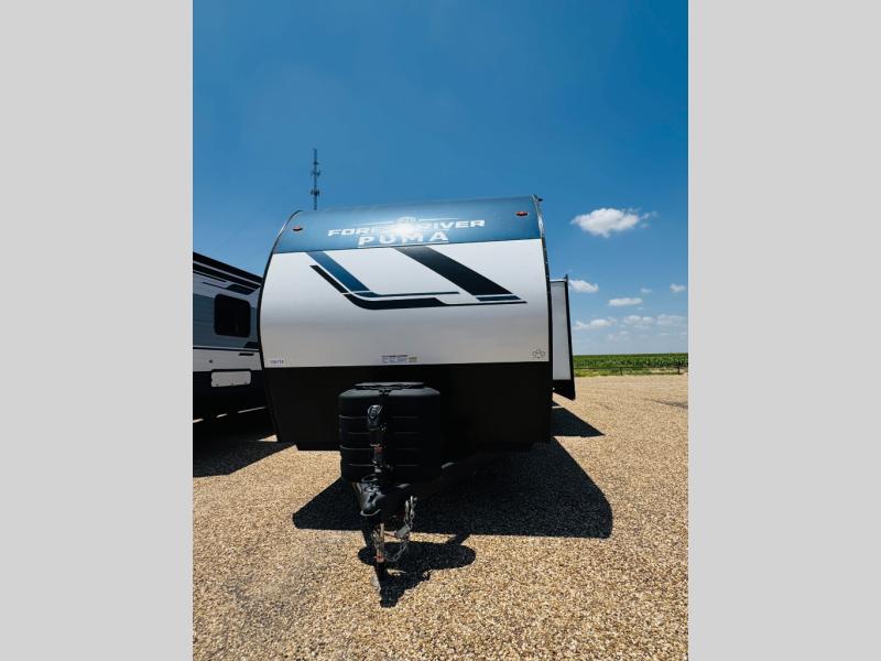If you're looking for family-fun adventures, then you need one of these Forest River Puma travel trailers! They are built rugged, easy to tow, and jam packed with features. The Darco wrapped underbelly will help protect your unit, and the roof and side mount solar prep gives you the option to add off-grid power. Inside, the Congoleum linoleum will be easy to keep clean, and the night roller shades will provide privacy when it's time to turn in. You'll also enjoy an electric awning with an LED light strip plus an AM/FM/Bluetooth stereo and two outside speakers to keep the party going!