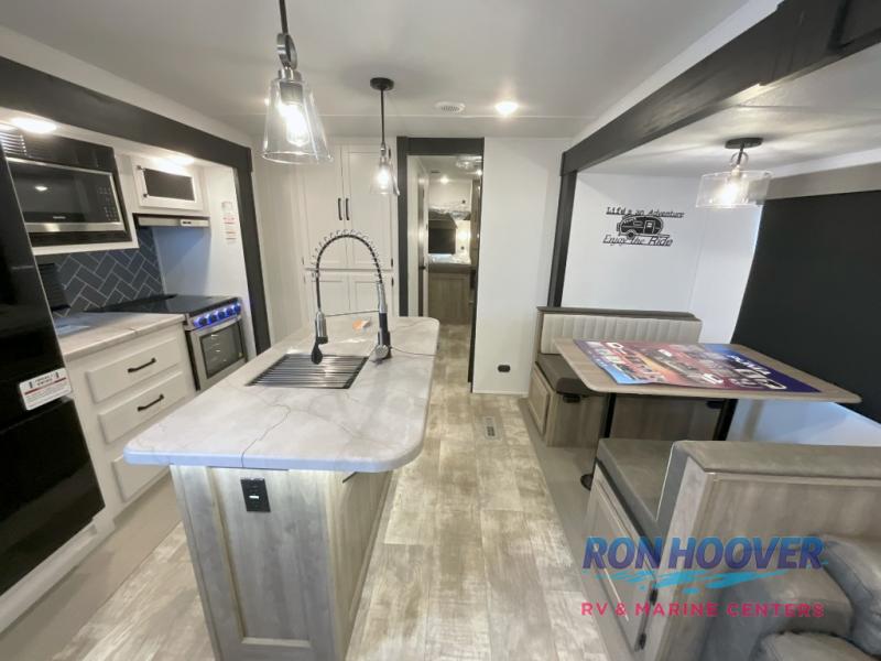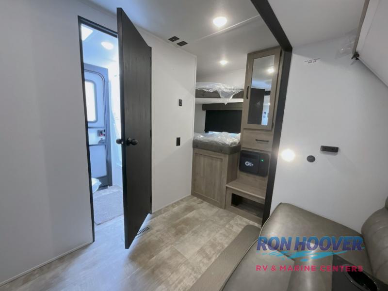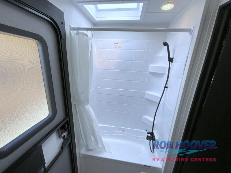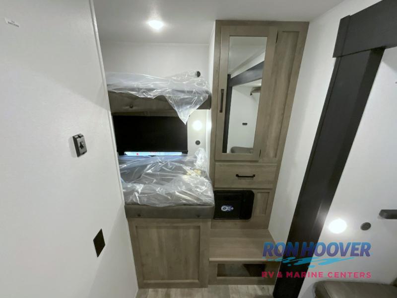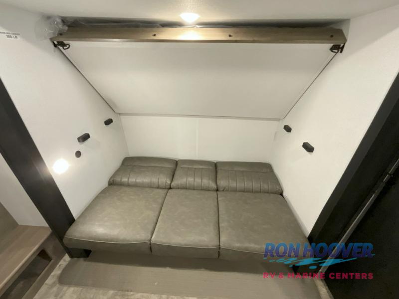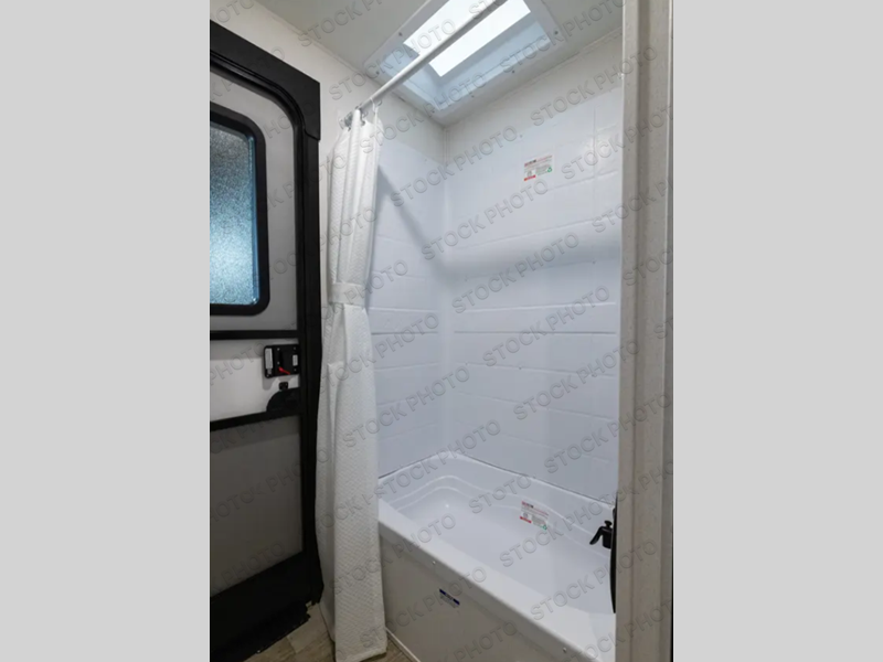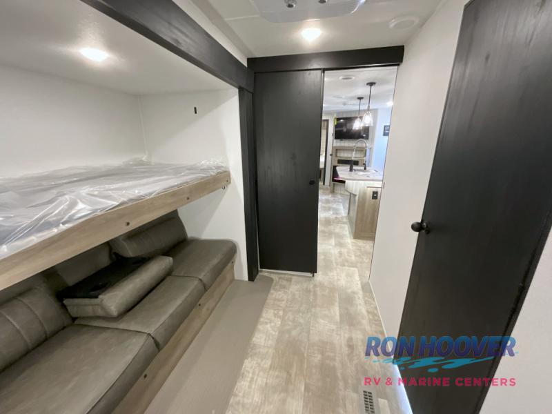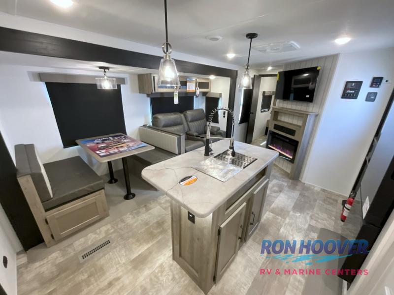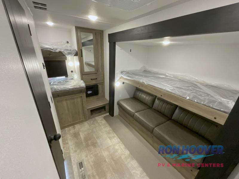 With two full bathrooms, it's a clean decision to take this travel trailer on your next family vacation! Start each morning feeling recharged after sleeping on the queen bed in the front private bedroom or in the rear private bunkhouse with an angled top bunk above a 32" x 69" double bunk bed and a 32" x 69" bunk above a 68" sofa slide. The bunkhouse also has a full bathroom with a 24" x 40" tub and one of the dual entry doors to the unit. You can relax on the sofa while enjoying the entertainment center and eat your meals prepared with the kitchen island at the booth dinette.