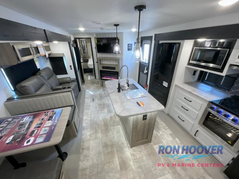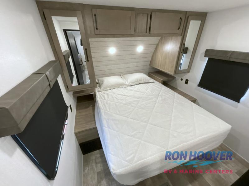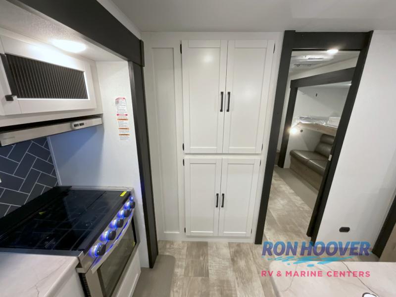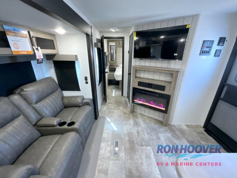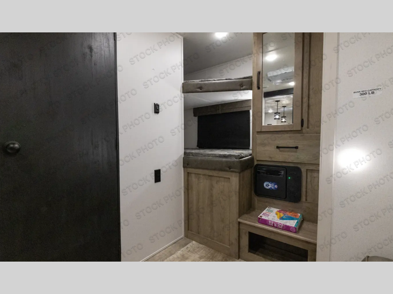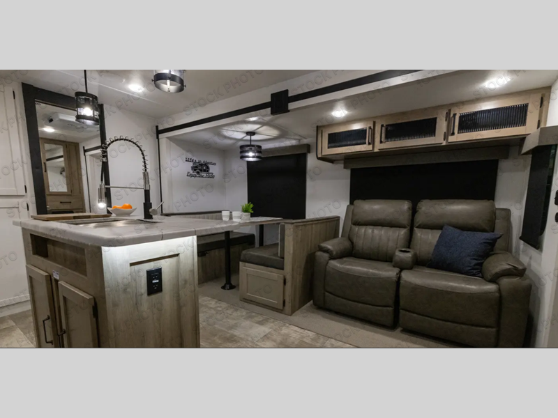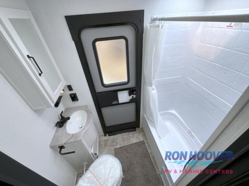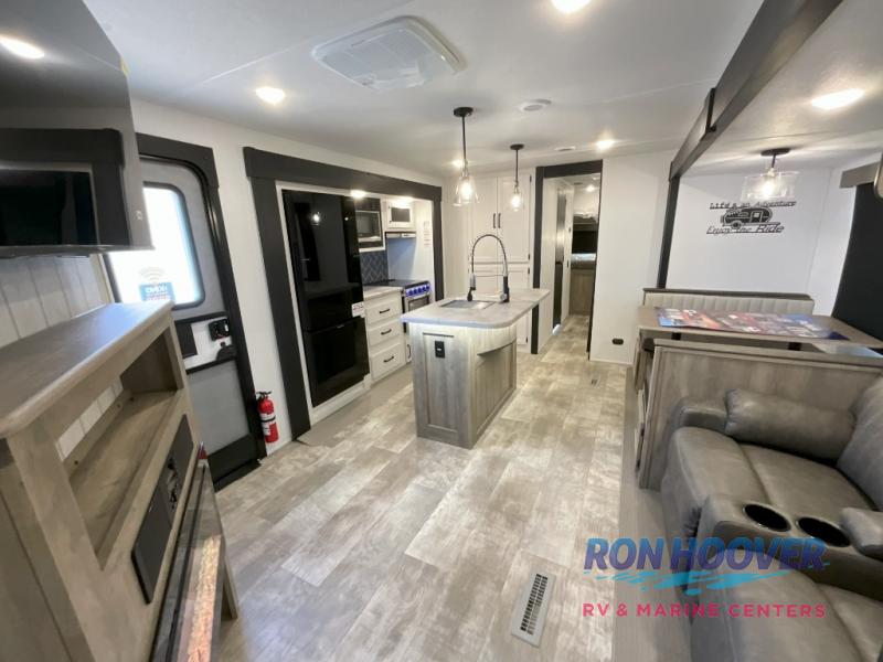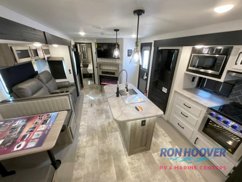 With two full bathrooms, it's a clean decision to take this travel trailer on your next family vacation! Start each morning feeling recharged after sleeping on the queen bed in the front private bedroom or in the rear private bunkhouse with an angled top bunk above a 32" x 69" double bunk bed and a 32" x 69" bunk above a 68" sofa slide. The bunkhouse also has a full bathroom with a 24" x 40" tub and one of the dual entry doors to the unit. You can relax on the sofa while enjoying the entertainment center and eat your meals prepared with the kitchen island at the booth dinette.