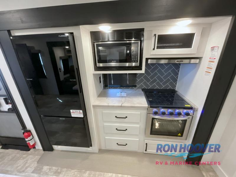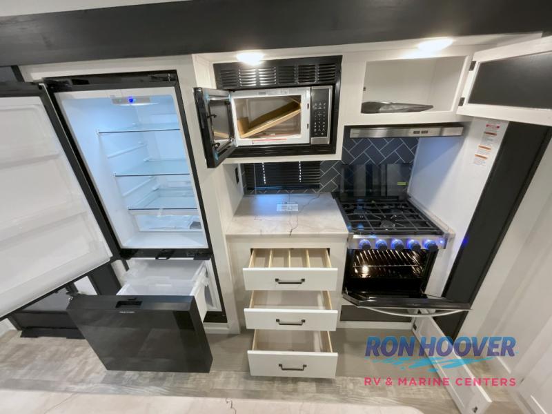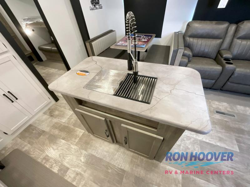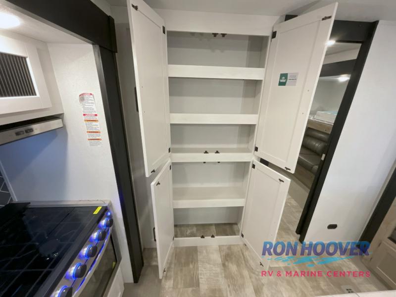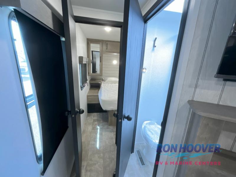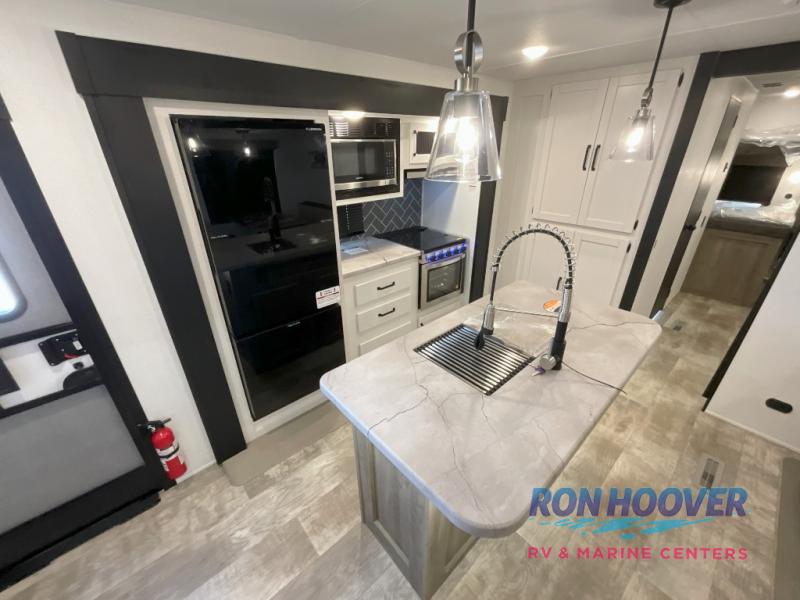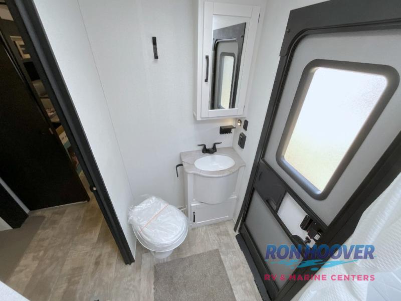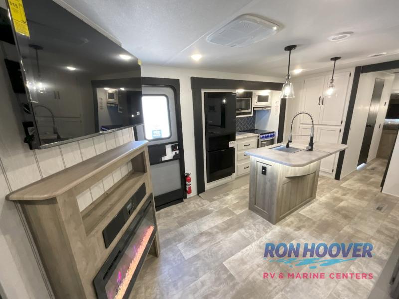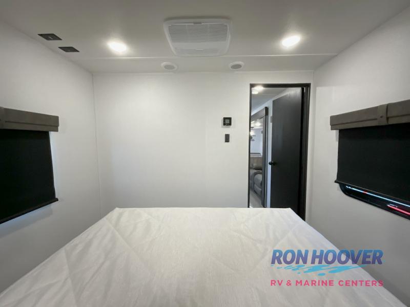 With two full bathrooms, it's a clean decision to take this travel trailer on your next family vacation! Start each morning feeling recharged after sleeping on the queen bed in the front private bedroom or in the rear private bunkhouse with an angled top bunk above a 32" x 69" double bunk bed and a 32" x 69" bunk above a 68" sofa slide. The bunkhouse also has a full bathroom with a 24" x 40" tub and one of the dual entry doors to the unit. You can relax on the sofa while enjoying the entertainment center and eat your meals prepared with the kitchen island at the booth dinette.