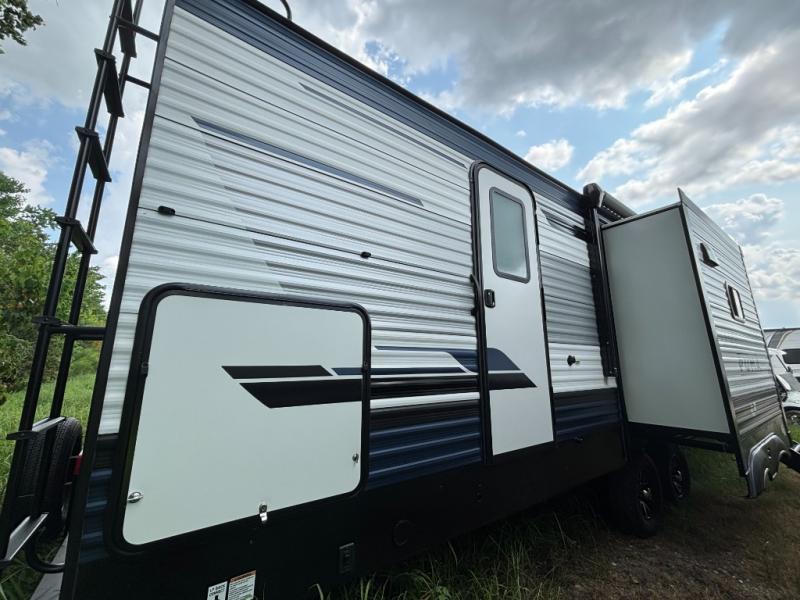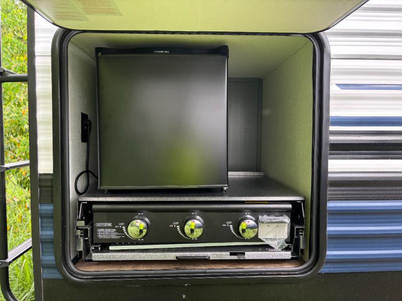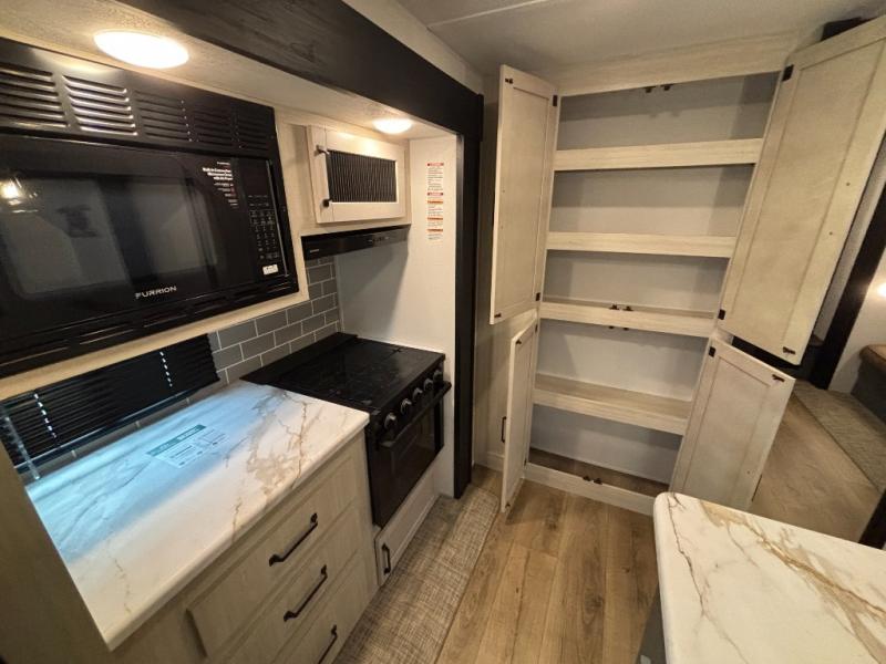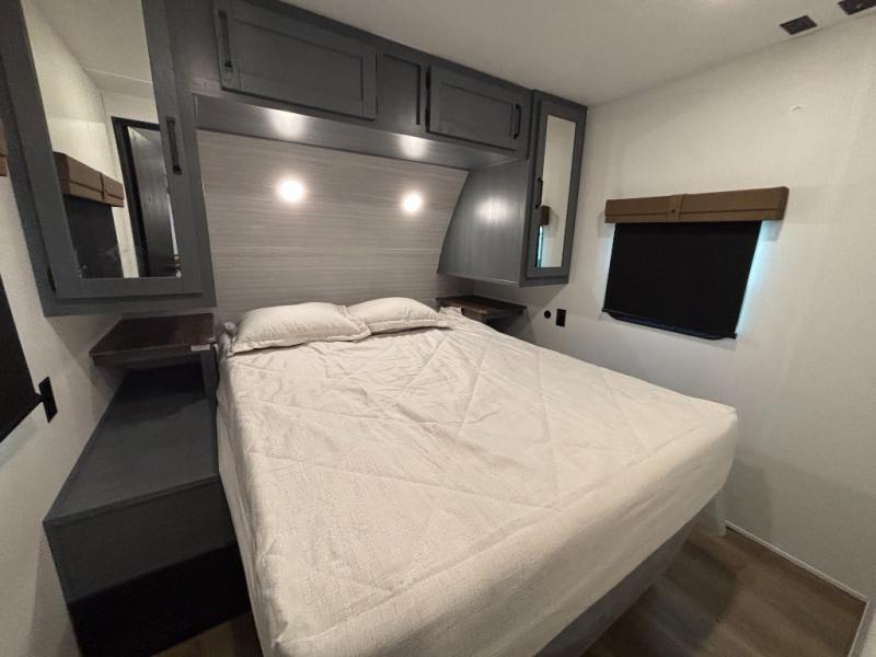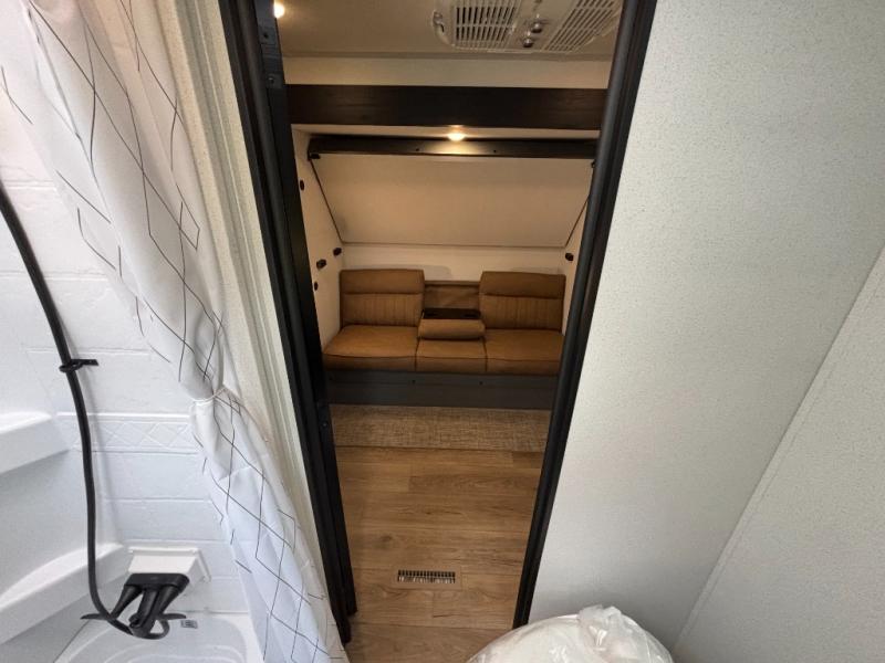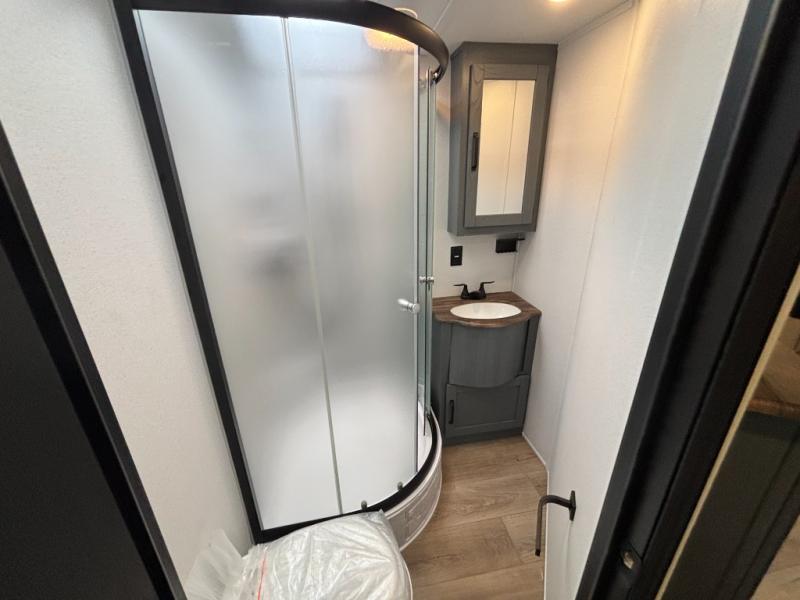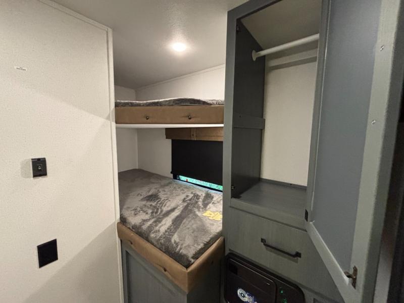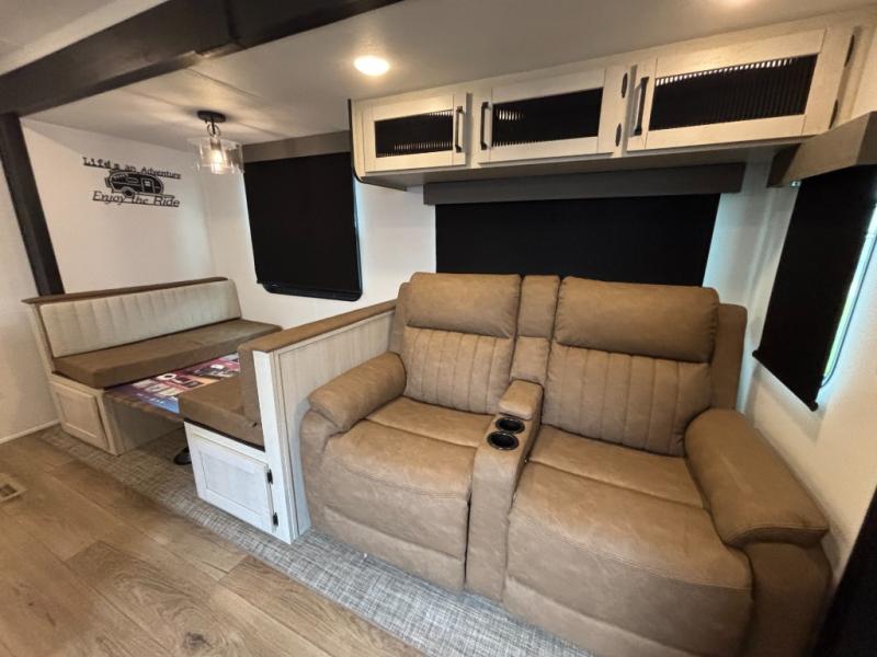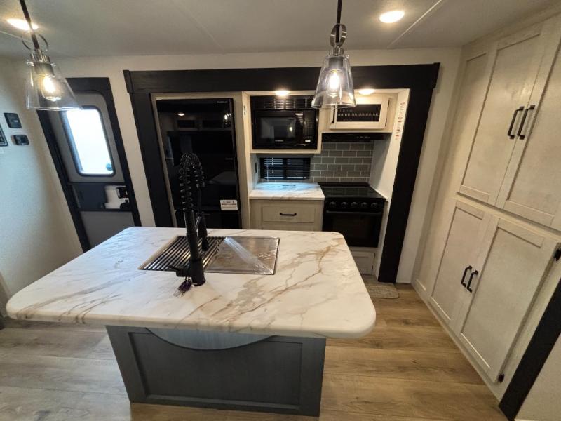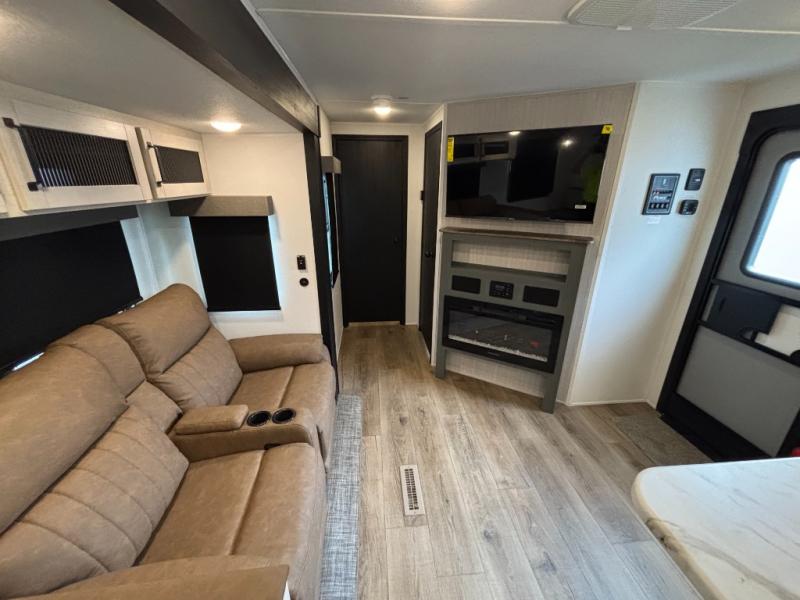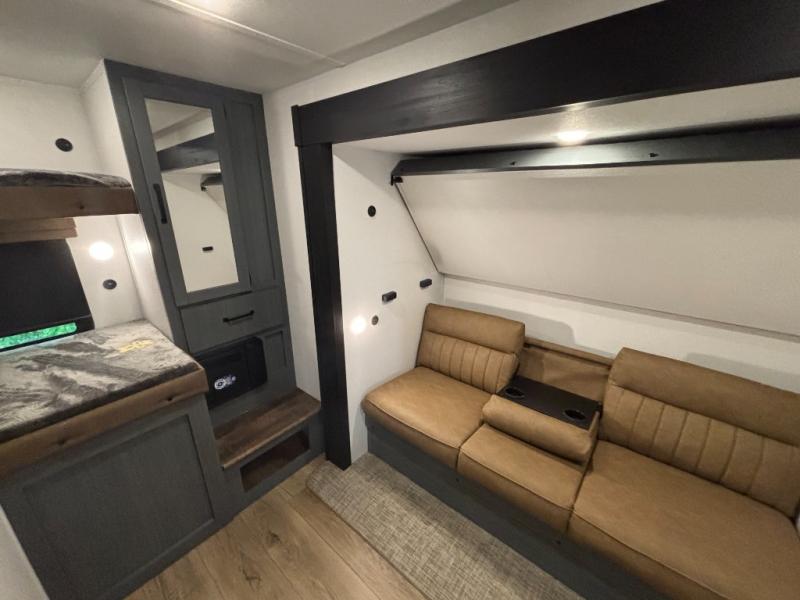 With two full bathrooms, it's a clean decision to take this travel trailer on your next family vacation! Start each morning feeling recharged after sleeping on the queen bed in the front private bedroom or in the rear private bunkhouse with an angled top bunk above a 32" x 69" double bunk bed and a 32" x 69" bunk above a 68" sofa slide. The bunkhouse also has a full bathroom with a 24" x 40" tub and one of the dual entry doors to the unit. You can relax on the sofa while enjoying the entertainment center and eat your meals prepared with the kitchen island at the booth dinette.