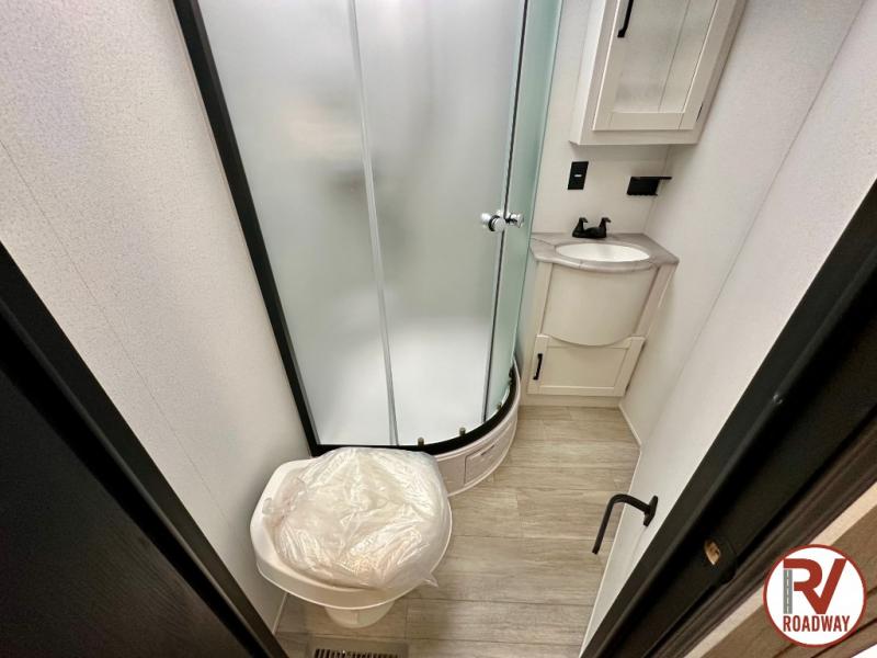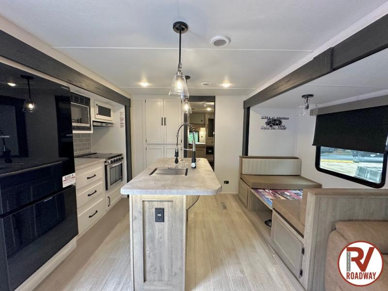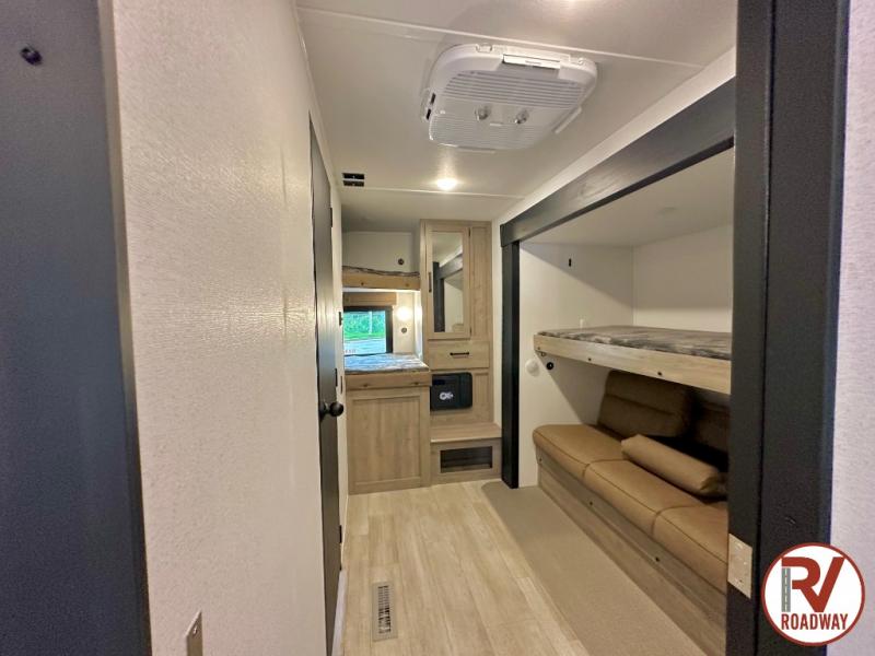 With two full bathrooms, it's a clean decision to take this travel trailer on your next family vacation! Start each morning feeling recharged after sleeping on the queen bed in the front private bedroom or in the rear private bunkhouse with an angled top bunk above a 32" x 69" double bunk bed and a 32" x 69" bunk above a 68" sofa slide. The bunkhouse also has a full bathroom with a 24" x 40" tub and one of the dual entry doors to the unit. You can relax on the sofa while enjoying the entertainment center and eat your meals prepared with the kitchen island at the booth dinette.