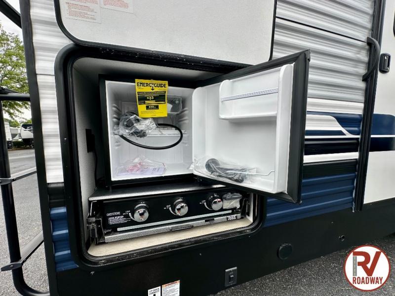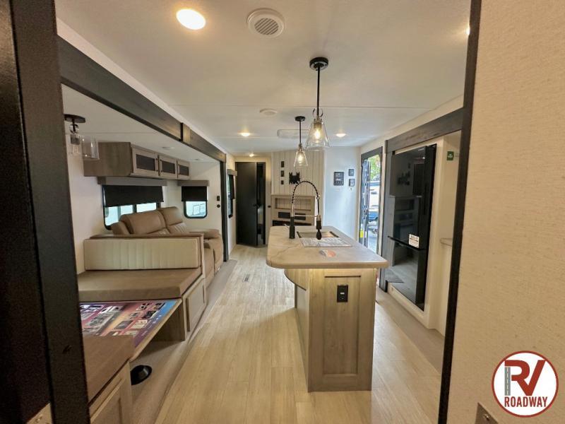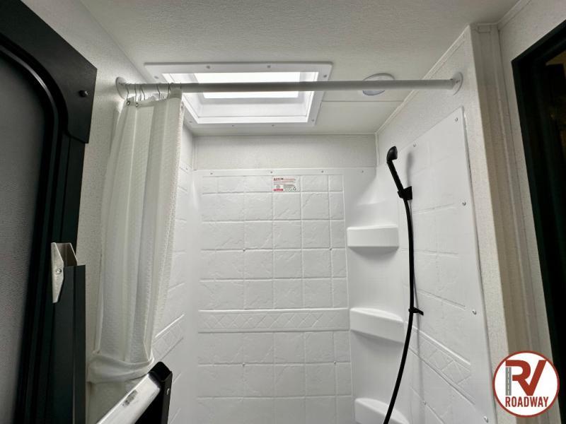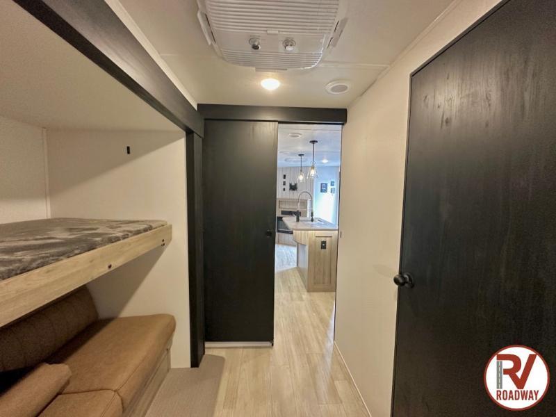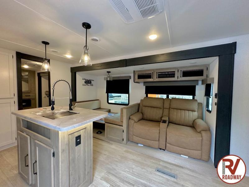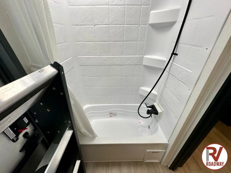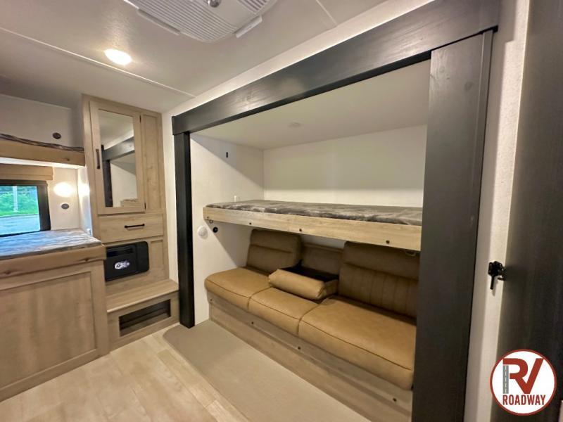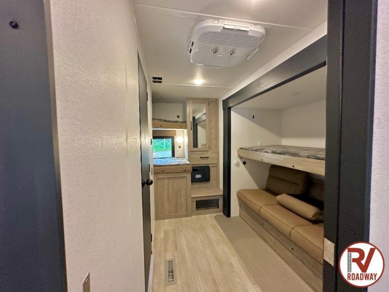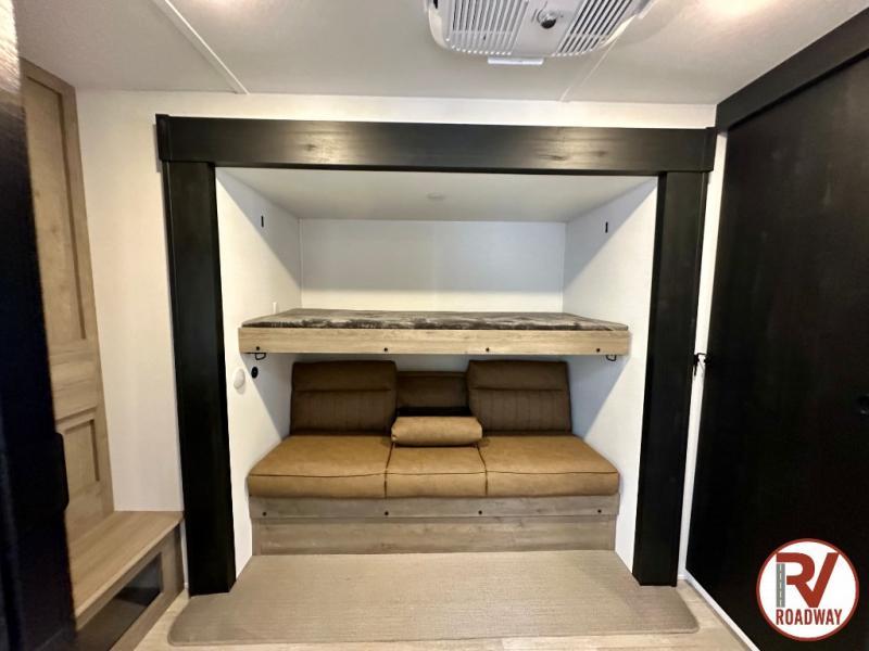 With two full bathrooms, it's a clean decision to take this travel trailer on your next family vacation! Start each morning feeling recharged after sleeping on the queen bed in the front private bedroom or in the rear private bunkhouse with an angled top bunk above a 32" x 69" double bunk bed and a 32" x 69" bunk above a 68" sofa slide. The bunkhouse also has a full bathroom with a 24" x 40" tub and one of the dual entry doors to the unit. You can relax on the sofa while enjoying the entertainment center and eat your meals prepared with the kitchen island at the booth dinette.