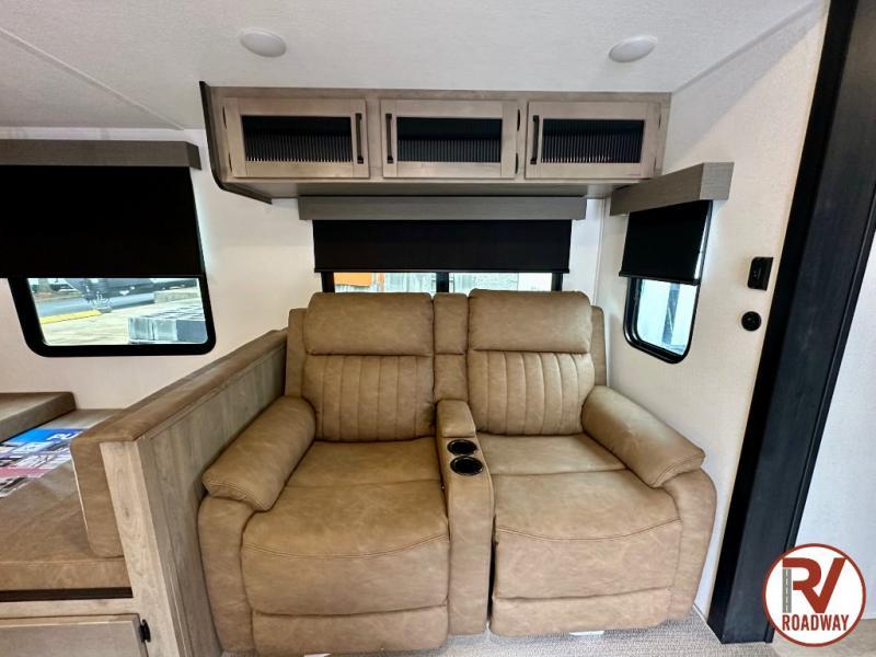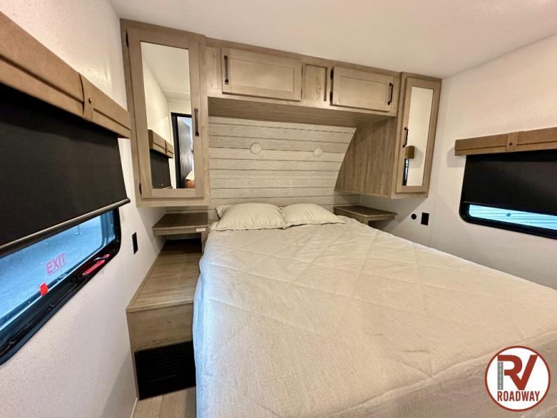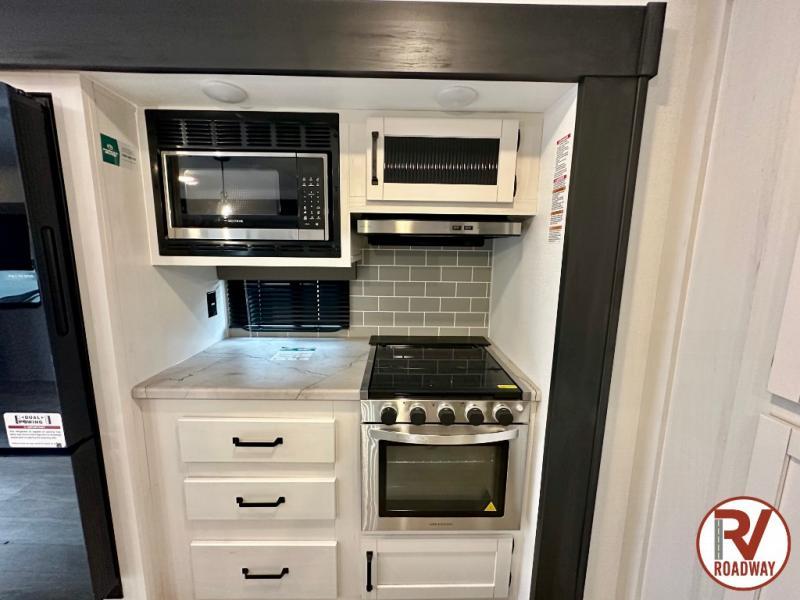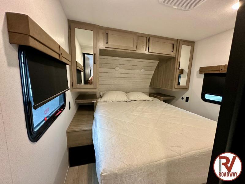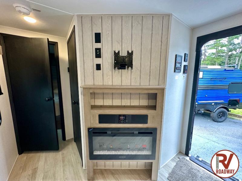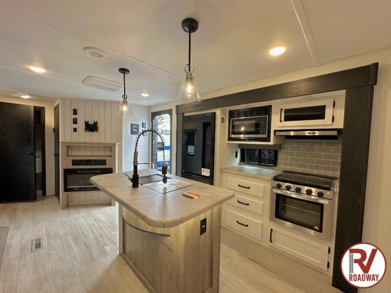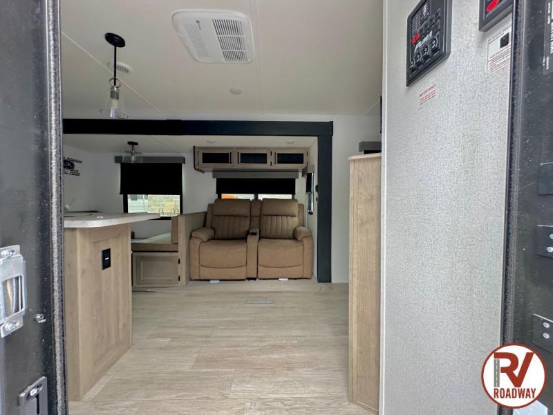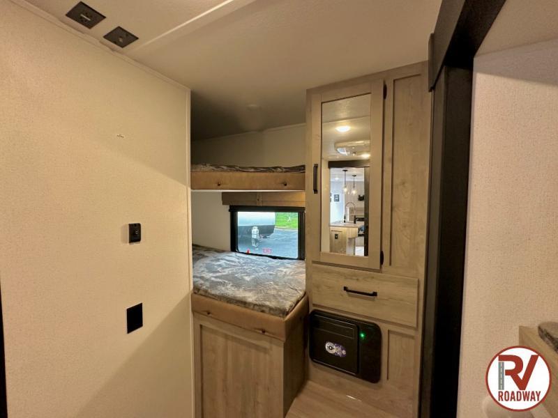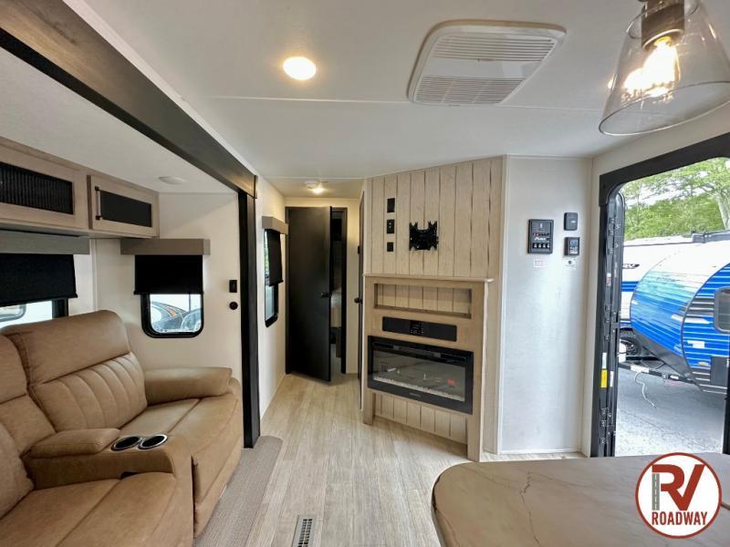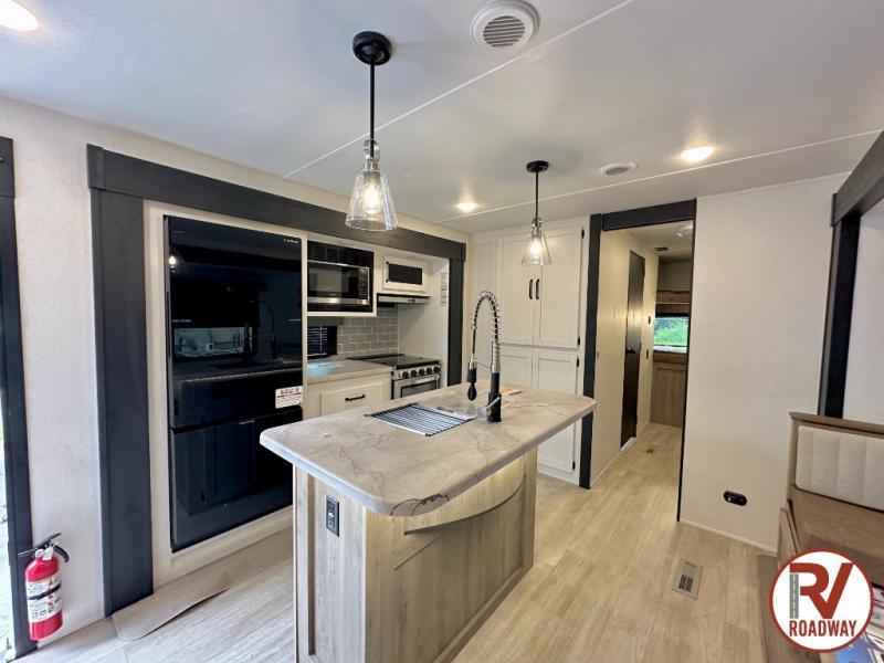 With two full bathrooms, it's a clean decision to take this travel trailer on your next family vacation! Start each morning feeling recharged after sleeping on the queen bed in the front private bedroom or in the rear private bunkhouse with an angled top bunk above a 32" x 69" double bunk bed and a 32" x 69" bunk above a 68" sofa slide. The bunkhouse also has a full bathroom with a 24" x 40" tub and one of the dual entry doors to the unit. You can relax on the sofa while enjoying the entertainment center and eat your meals prepared with the kitchen island at the booth dinette.