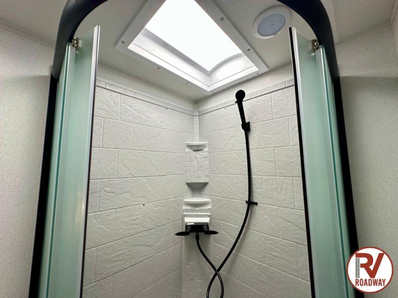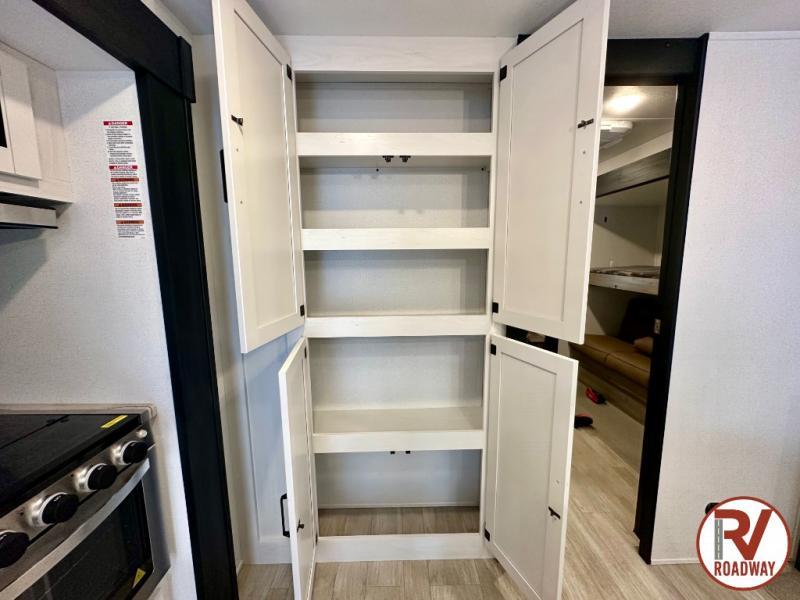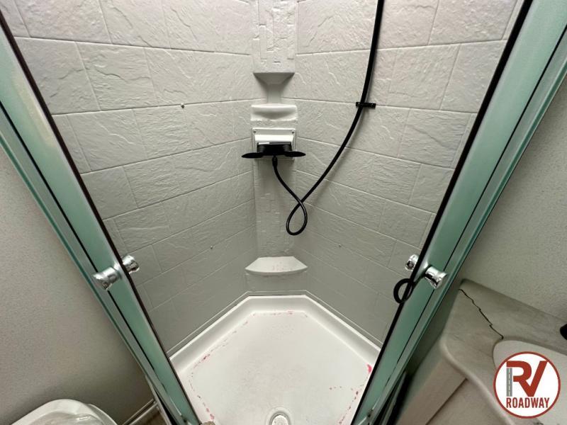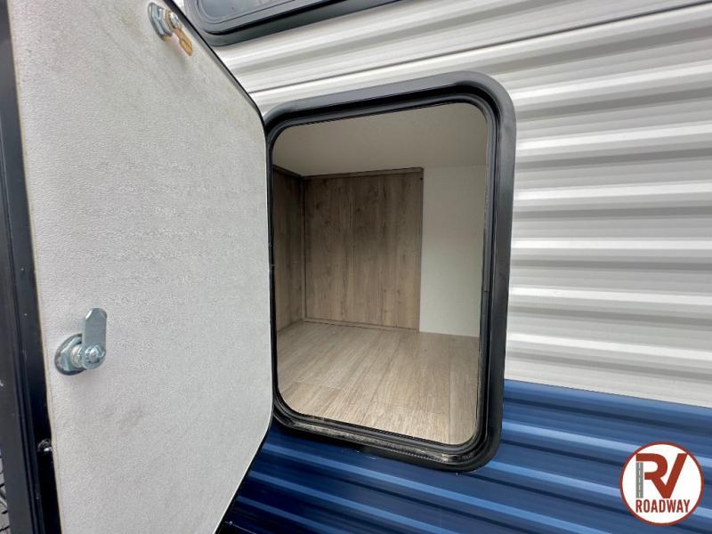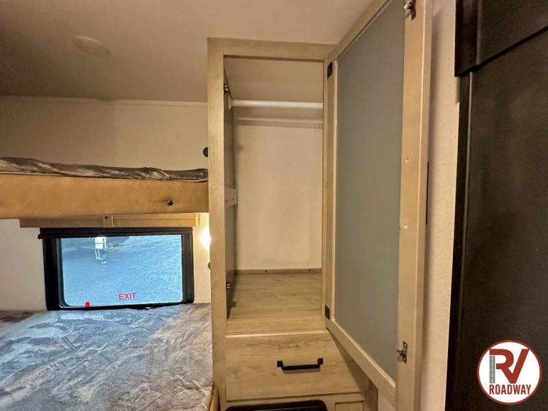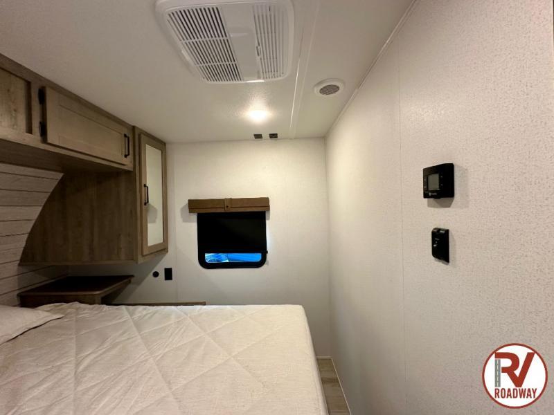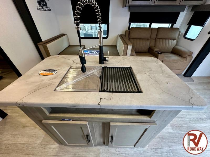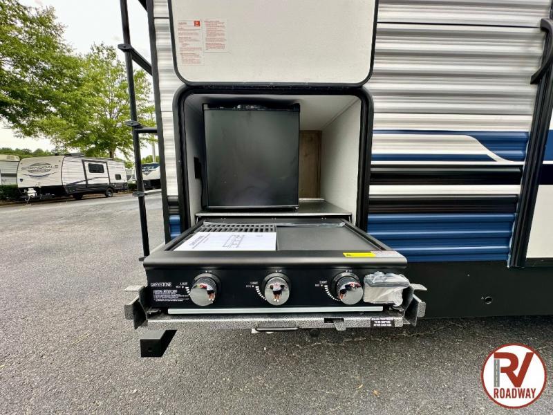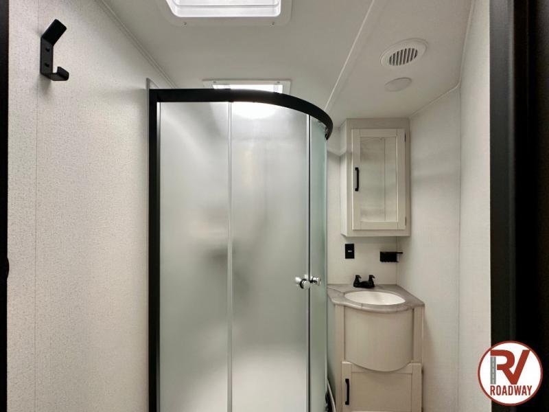 With two full bathrooms, it's a clean decision to take this travel trailer on your next family vacation! Start each morning feeling recharged after sleeping on the queen bed in the front private bedroom or in the rear private bunkhouse with an angled top bunk above a 32" x 69" double bunk bed and a 32" x 69" bunk above a 68" sofa slide. The bunkhouse also has a full bathroom with a 24" x 40" tub and one of the dual entry doors to the unit. You can relax on the sofa while enjoying the entertainment center and eat your meals prepared with the kitchen island at the booth dinette.
