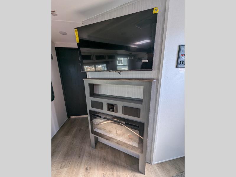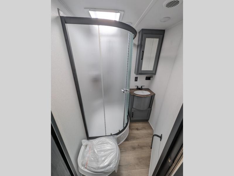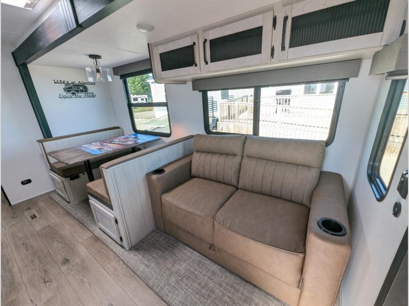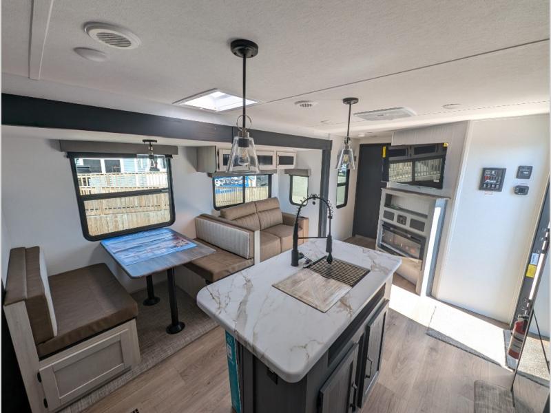 With two full bathrooms, it's a clean decision to take this travel trailer on your next family vacation! Start each morning feeling recharged after sleeping on the queen bed in the front private bedroom or in the rear private bunkhouse with an angled top bunk above a 32" x 69" double bunk bed and a 32" x 69" bunk above a 68" sofa slide. The bunkhouse also has a full bathroom with a 24" x 40" tub and one of the dual entry doors to the unit. You can relax on the sofa while enjoying the entertainment center and eat your meals prepared with the kitchen island at the booth dinette.