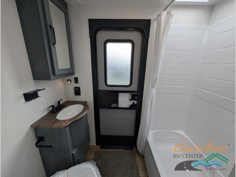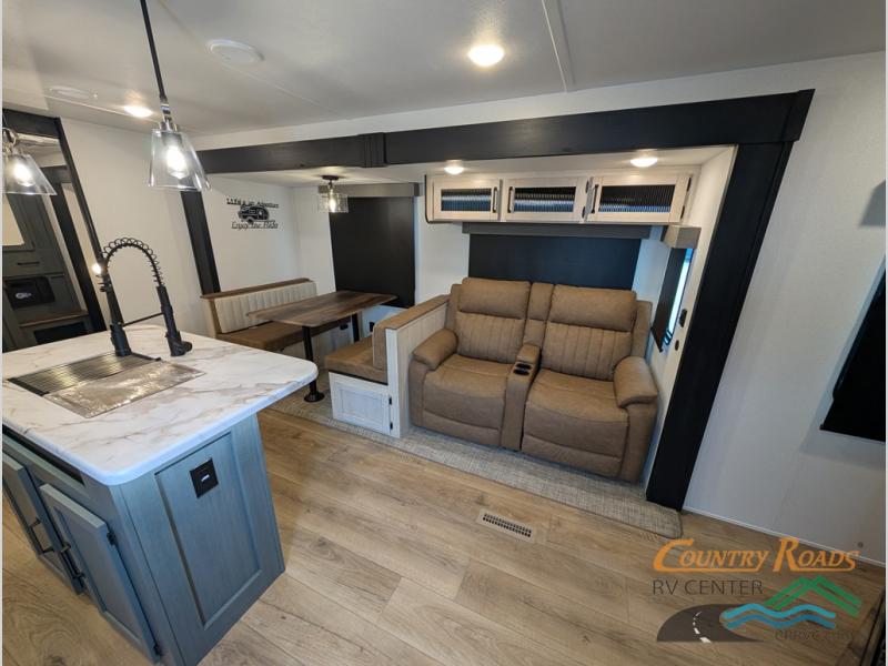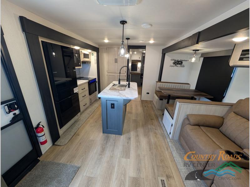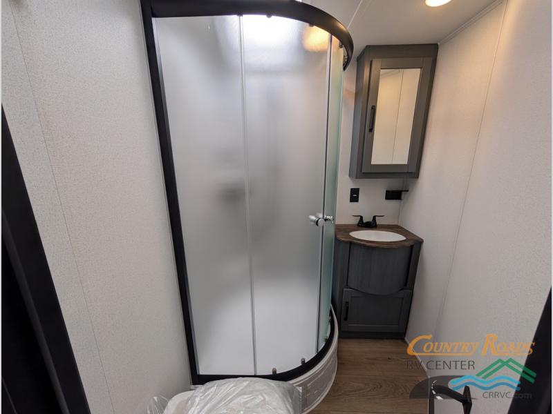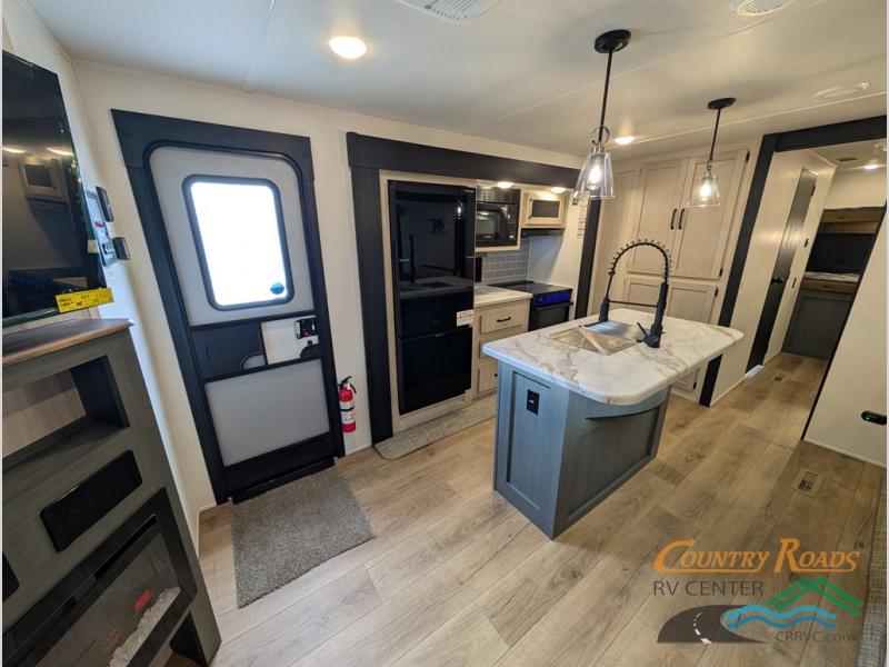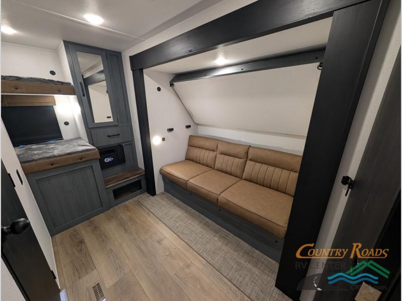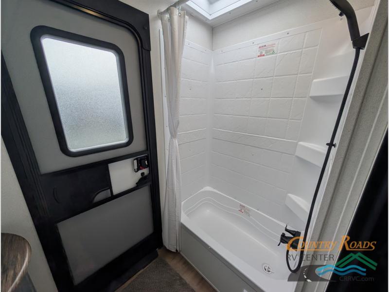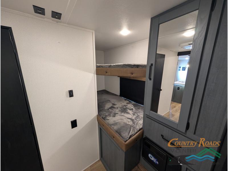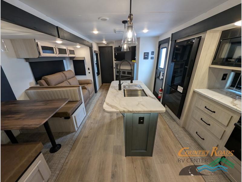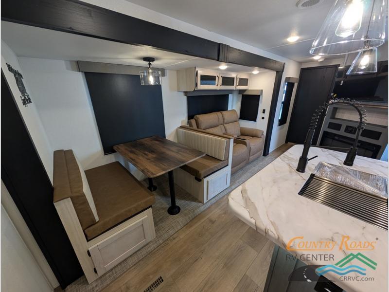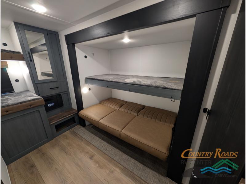 With two full bathrooms, it's a clean decision to take this travel trailer on your next family vacation! Start each morning feeling recharged after sleeping on the queen bed in the front private bedroom or in the rear private bunkhouse with an angled top bunk above a 32" x 69" double bunk bed and a 32" x 69" bunk above a 68" sofa slide. The bunkhouse also has a full bathroom with a 24" x 40" tub and one of the dual entry doors to the unit. You can relax on the sofa while enjoying the entertainment center and eat your meals prepared with the kitchen island at the booth dinette.