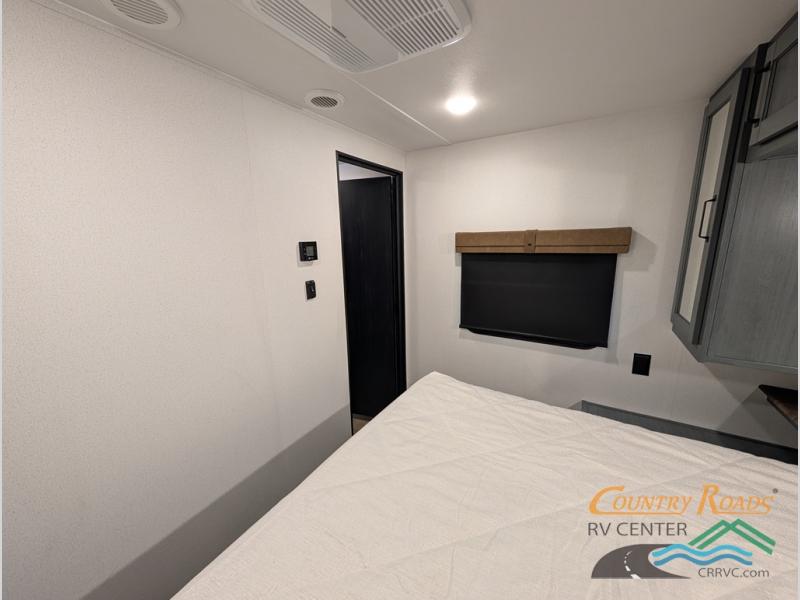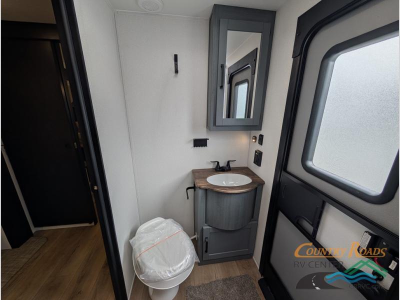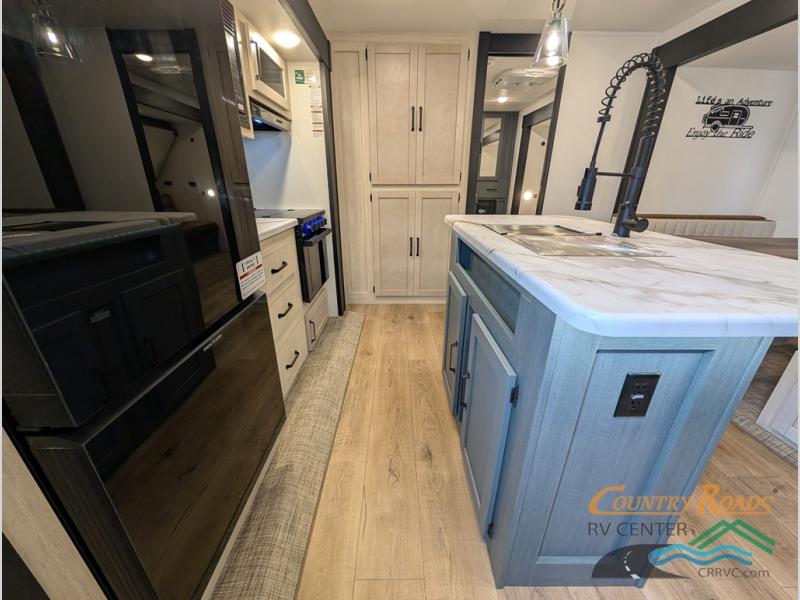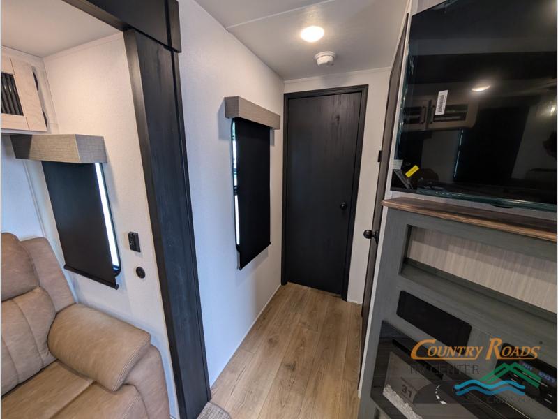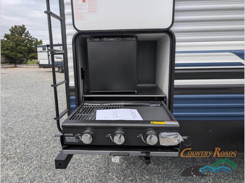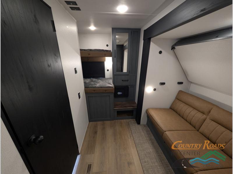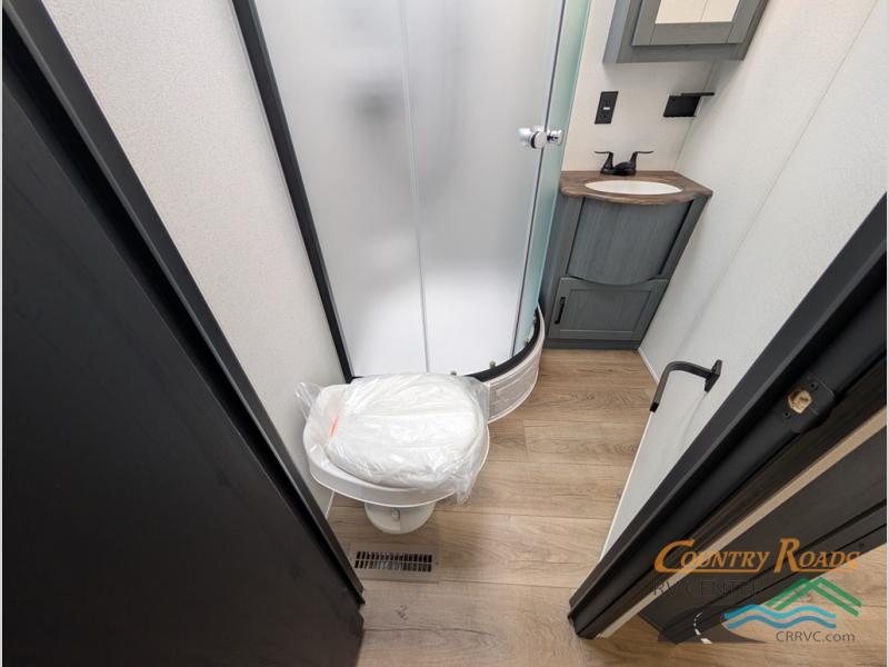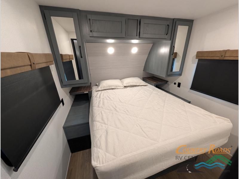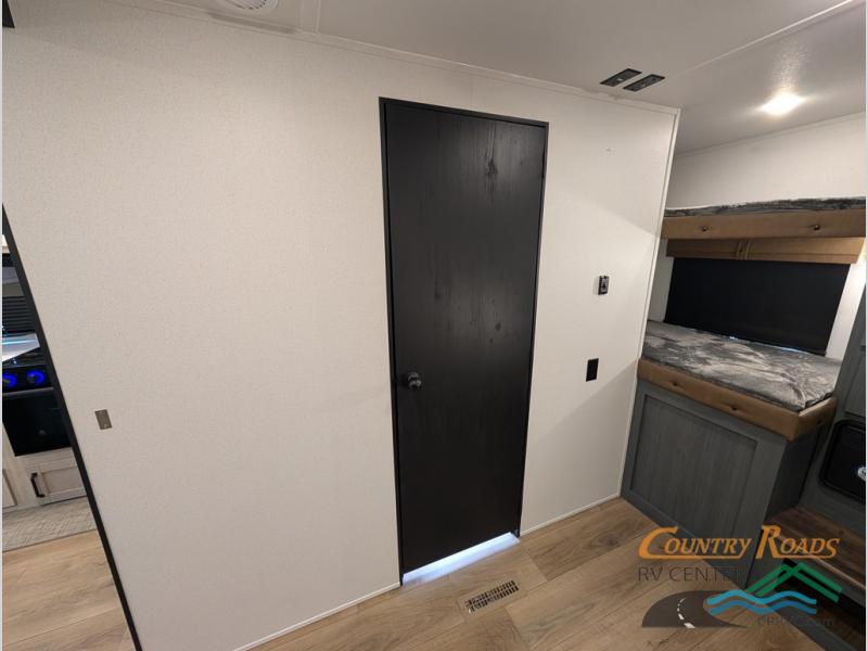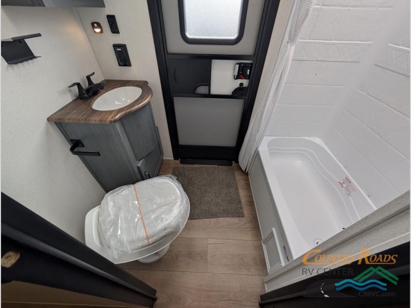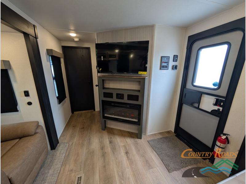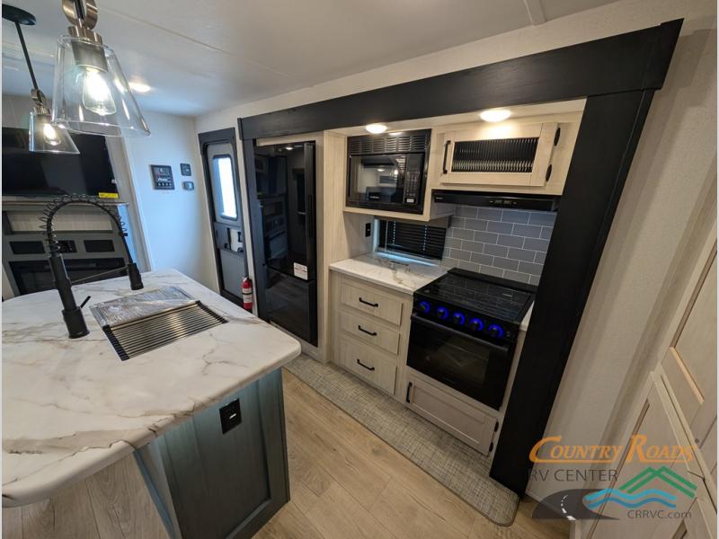 With two full bathrooms, it's a clean decision to take this travel trailer on your next family vacation! Start each morning feeling recharged after sleeping on the queen bed in the front private bedroom or in the rear private bunkhouse with an angled top bunk above a 32" x 69" double bunk bed and a 32" x 69" bunk above a 68" sofa slide. The bunkhouse also has a full bathroom with a 24" x 40" tub and one of the dual entry doors to the unit. You can relax on the sofa while enjoying the entertainment center and eat your meals prepared with the kitchen island at the booth dinette.