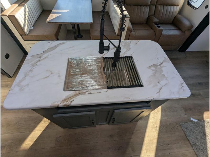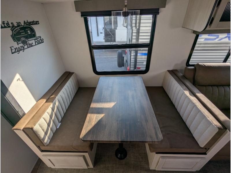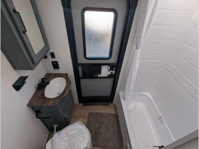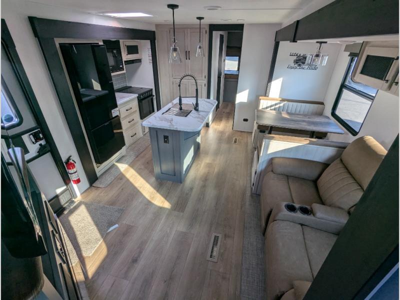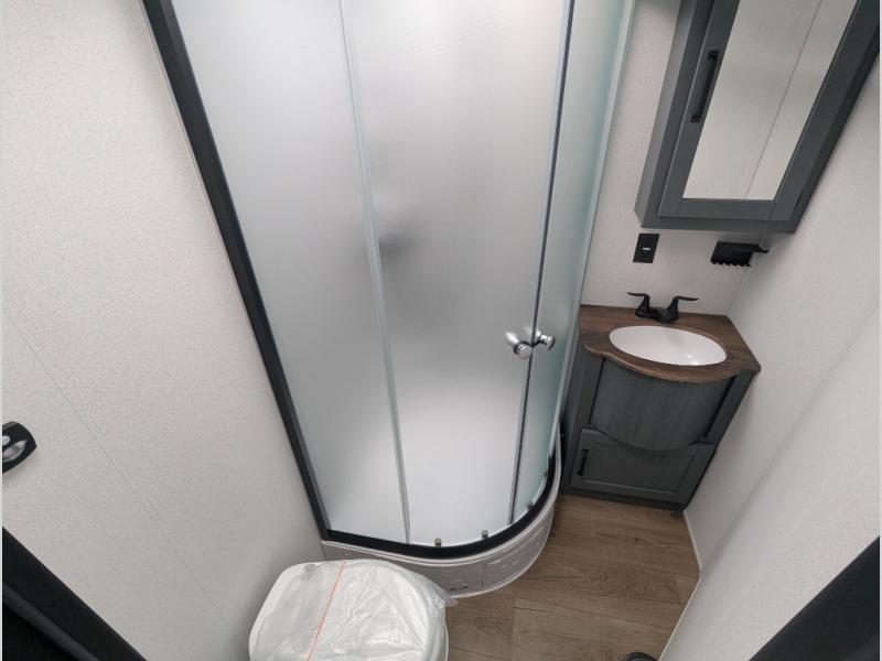 With two full bathrooms, it's a clean decision to take this travel trailer on your next family vacation! Start each morning feeling recharged after sleeping on the queen bed in the front private bedroom or in the rear private bunkhouse with an angled top bunk above a 32" x 69" double bunk bed and a 32" x 69" bunk above a 68" sofa slide. The bunkhouse also has a full bathroom with a 24" x 40" tub and one of the dual entry doors to the unit. You can relax on the sofa while enjoying the entertainment center and eat your meals prepared with the kitchen island at the booth dinette.