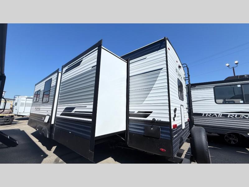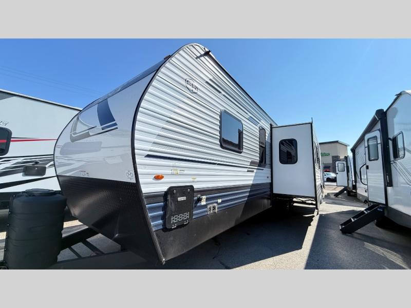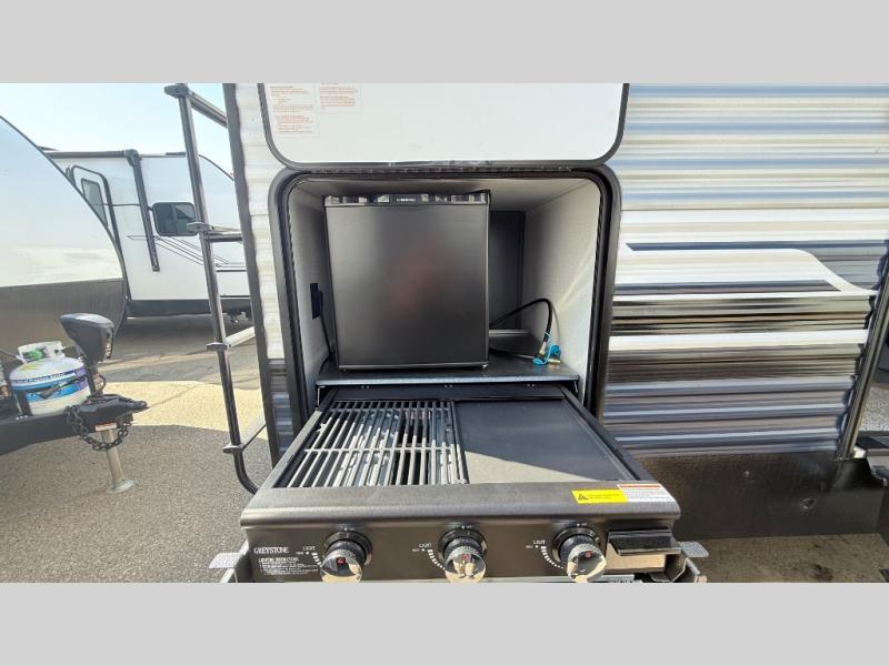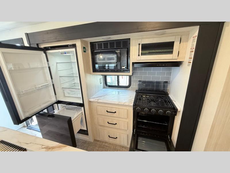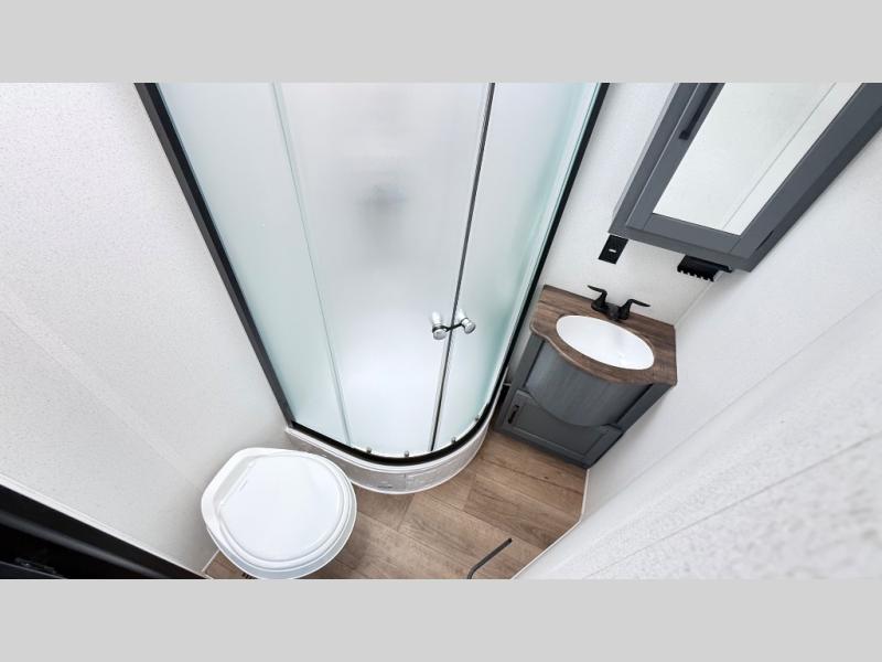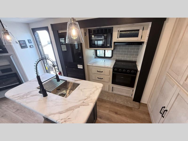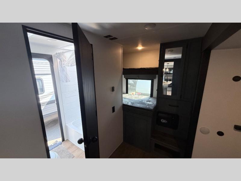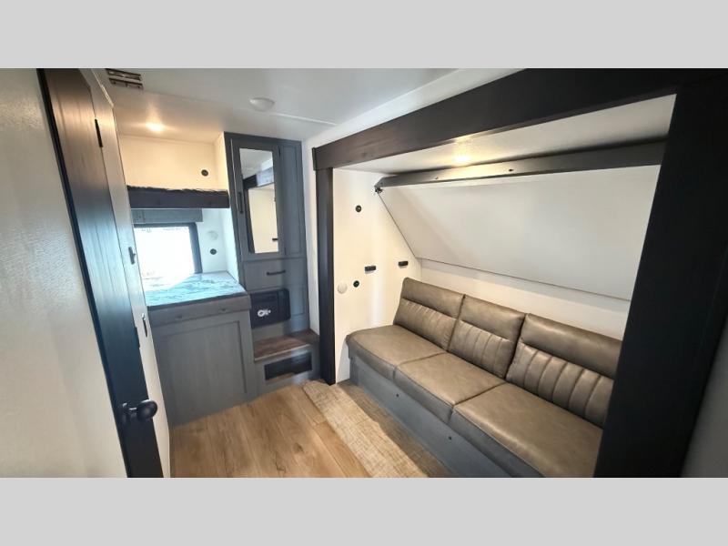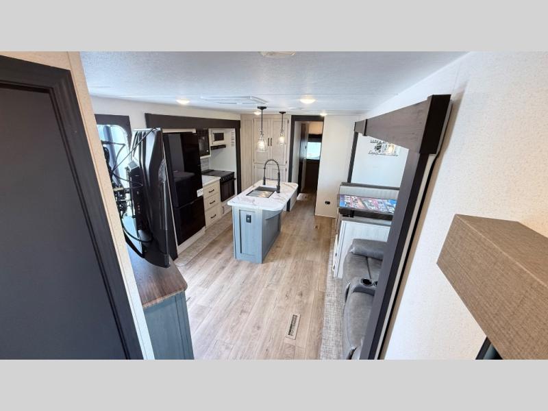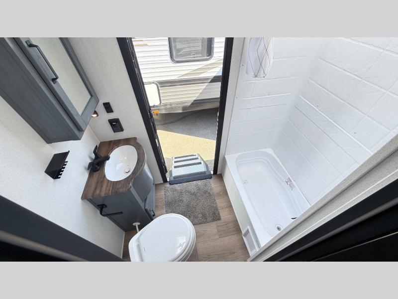 With two full bathrooms, it's a clean decision to take this travel trailer on your next family vacation! Start each morning feeling recharged after sleeping on the queen bed in the front private bedroom or in the rear private bunkhouse with an angled top bunk above a 32" x 69" double bunk bed and a 32" x 69" bunk above a 68" sofa slide. The bunkhouse also has a full bathroom with a 24" x 40" tub and one of the dual entry doors to the unit. You can relax on the sofa while enjoying the entertainment center and eat your meals prepared with the kitchen island at the booth dinette.