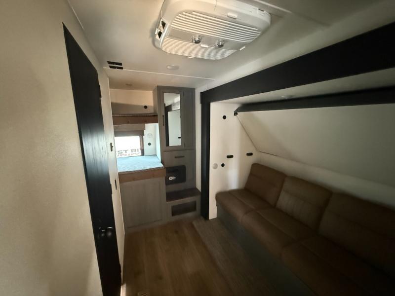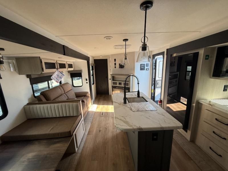 With two full bathrooms, it's a clean decision to take this travel trailer on your next family vacation! Start each morning feeling recharged after sleeping on the queen bed in the front private bedroom or in the rear private bunkhouse with an angled top bunk above a 32" x 69" double bunk bed and a 32" x 69" bunk above a 68" sofa slide. The bunkhouse also has a full bathroom with a 24" x 40" tub and one of the dual entry doors to the unit. You can relax on the sofa while enjoying the entertainment center and eat your meals prepared with the kitchen island at the booth dinette.
