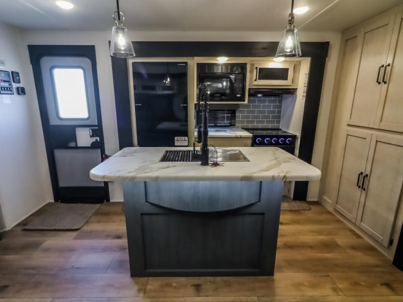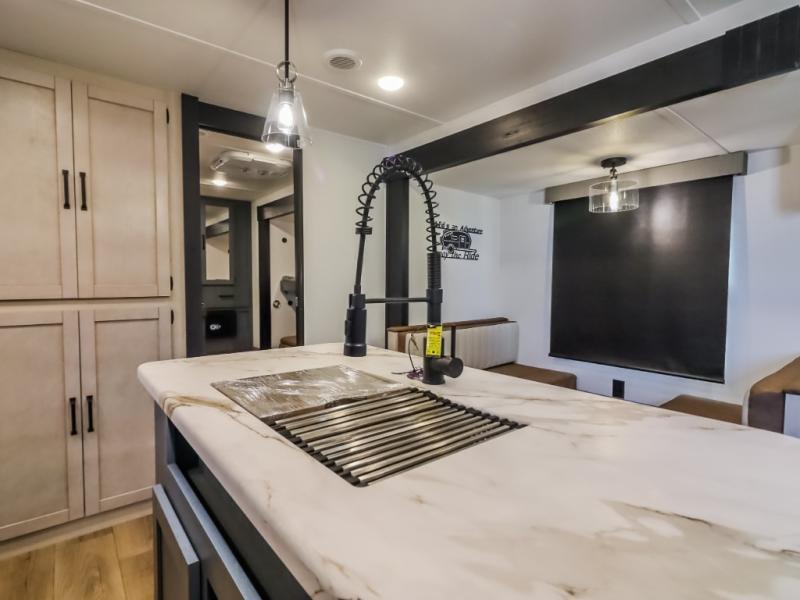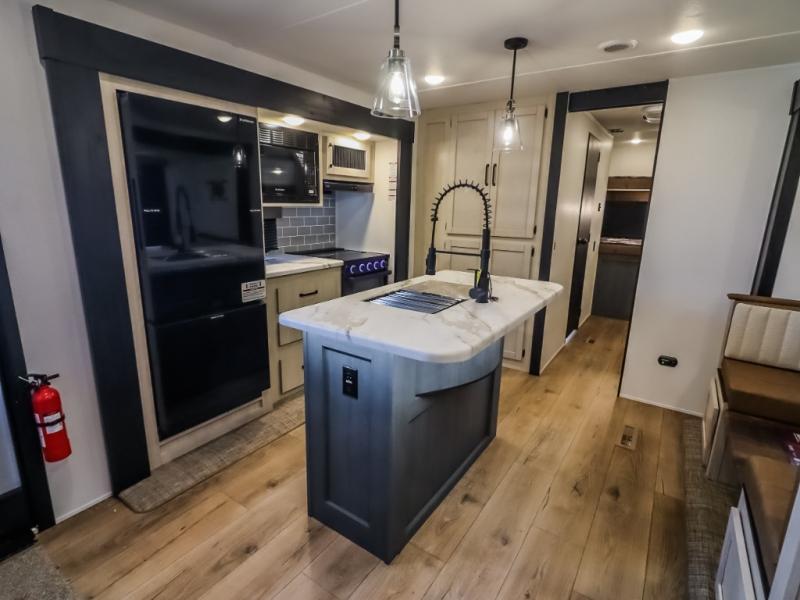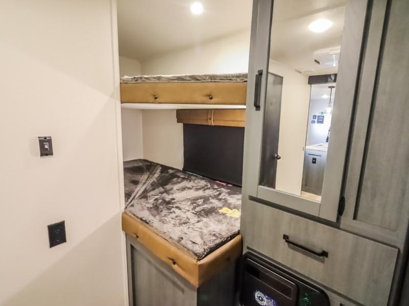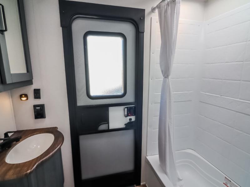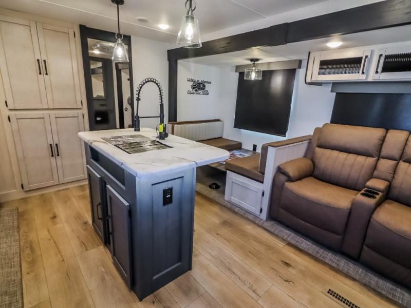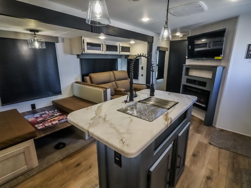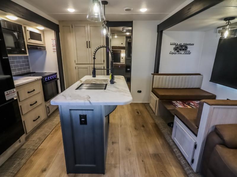 With two full bathrooms, it's a clean decision to take this travel trailer on your next family vacation! Start each morning feeling recharged after sleeping on the queen bed in the front private bedroom or in the rear private bunkhouse with an angled top bunk above a 32" x 69" double bunk bed and a 32" x 69" bunk above a 68" sofa slide. The bunkhouse also has a full bathroom with a 24" x 40" tub and one of the dual entry doors to the unit. You can relax on the sofa while enjoying the entertainment center and eat your meals prepared with the kitchen island at the booth dinette.
