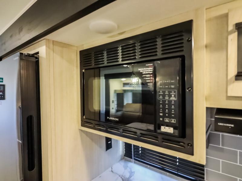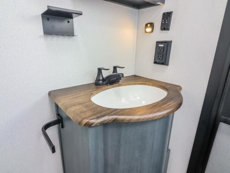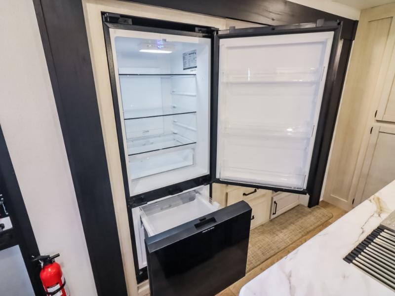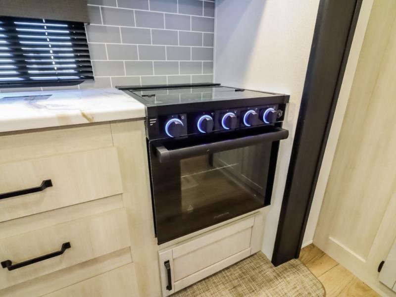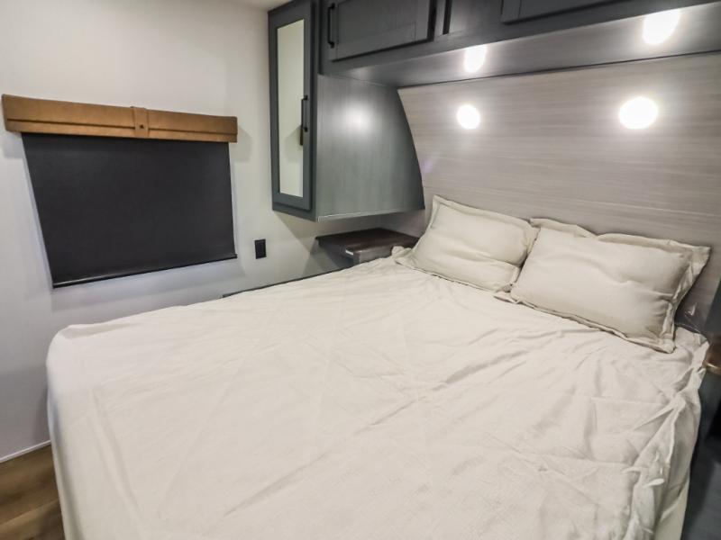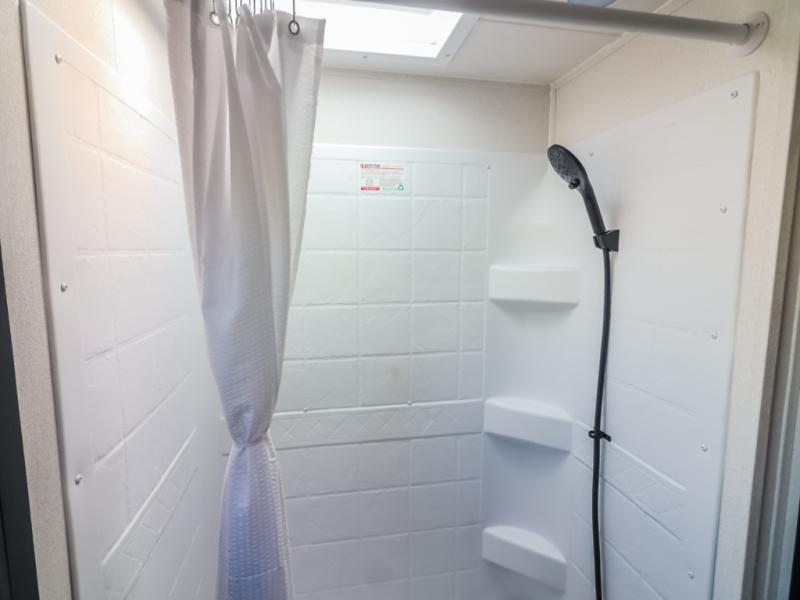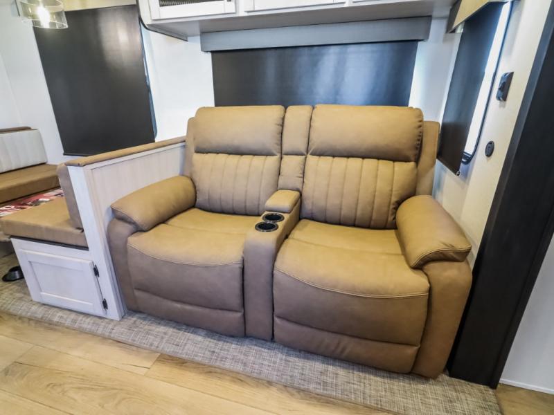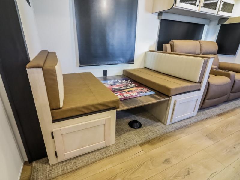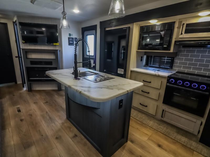 With two full bathrooms, it's a clean decision to take this travel trailer on your next family vacation! Start each morning feeling recharged after sleeping on the queen bed in the front private bedroom or in the rear private bunkhouse with an angled top bunk above a 32" x 69" double bunk bed and a 32" x 69" bunk above a 68" sofa slide. The bunkhouse also has a full bathroom with a 24" x 40" tub and one of the dual entry doors to the unit. You can relax on the sofa while enjoying the entertainment center and eat your meals prepared with the kitchen island at the booth dinette.