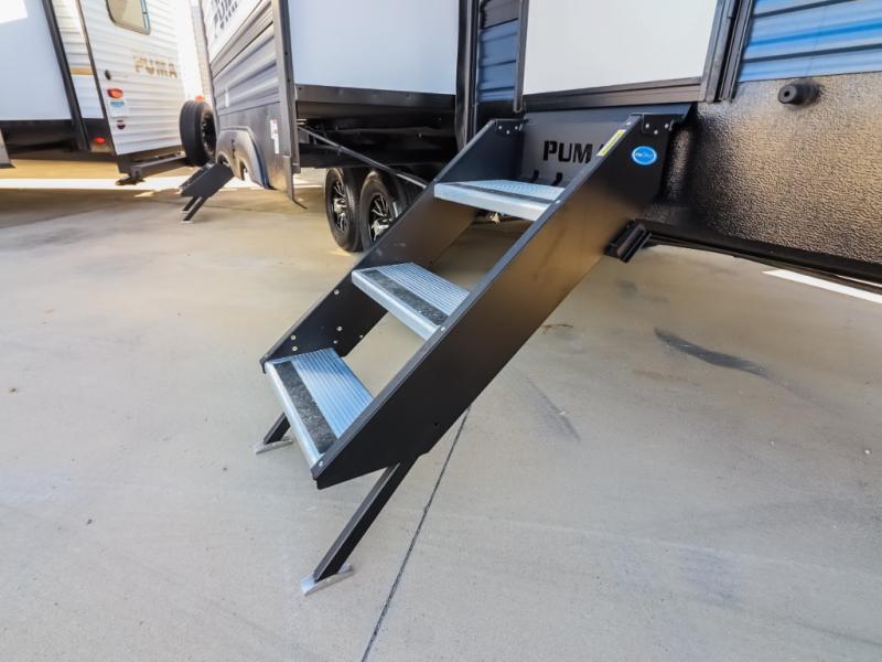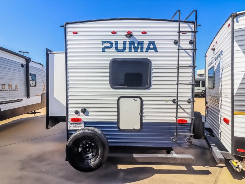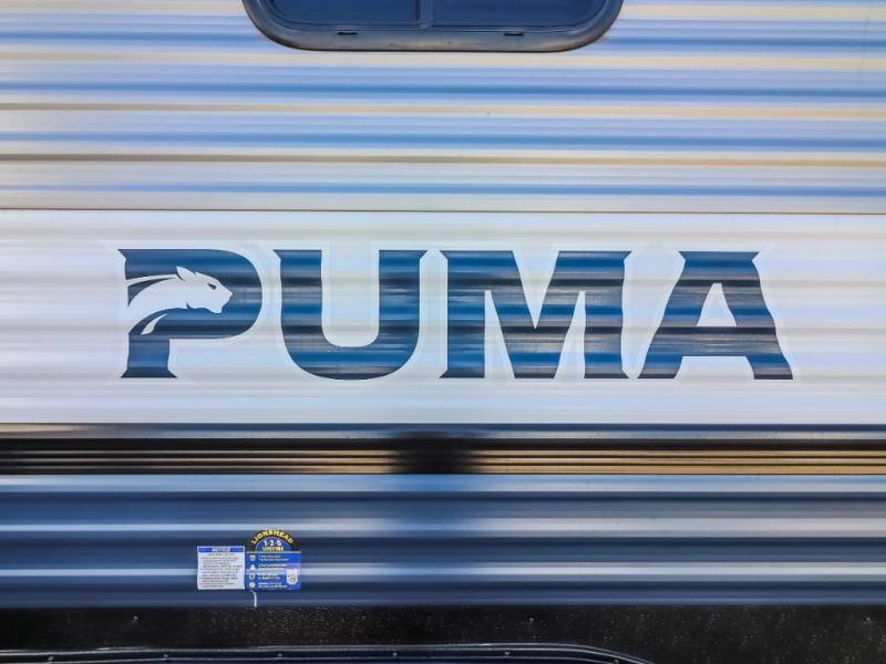 If you're looking for family-fun adventures, then you need one of these Forest River Puma travel trailers! They are built rugged, easy to tow, and jam packed with features. The Darco wrapped underbelly will help protect your unit, and the roof and side mount solar prep gives you the option to add off-grid power. Inside, the Congoleum linoleum will be easy to keep clean, and the night roller shades will provide privacy when it's time to turn in. You'll also enjoy an electric awning with an LED light strip plus an AM/FM/Bluetooth stereo and two outside speakers to keep the party going!