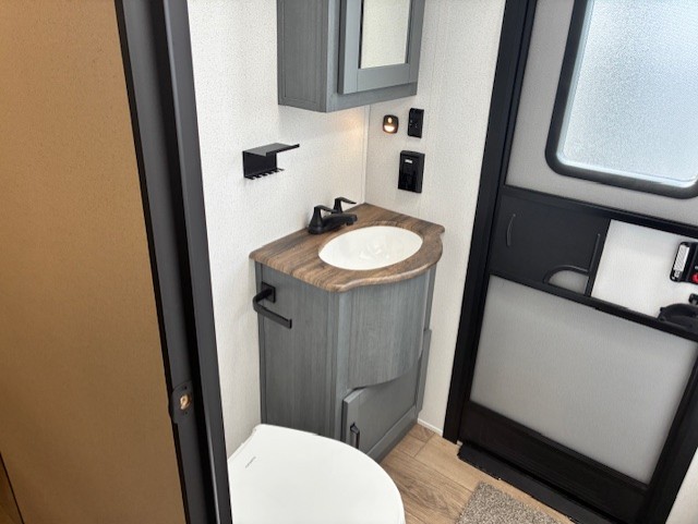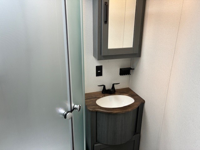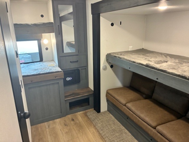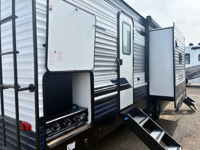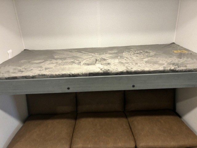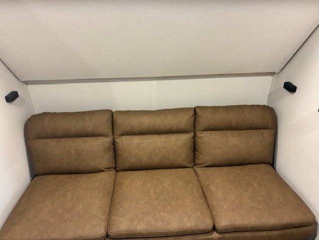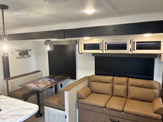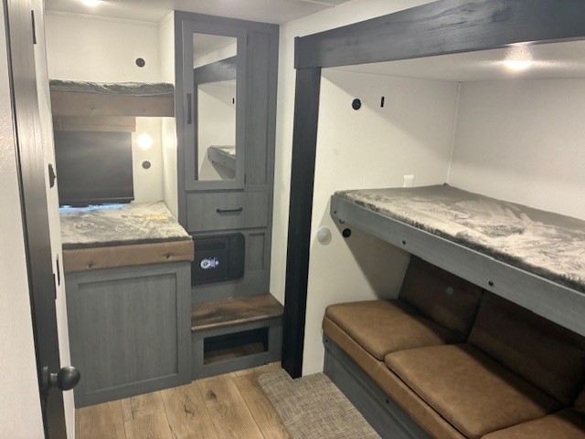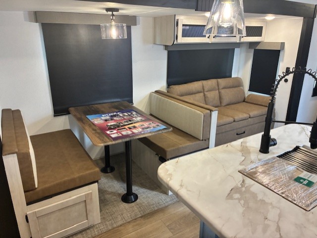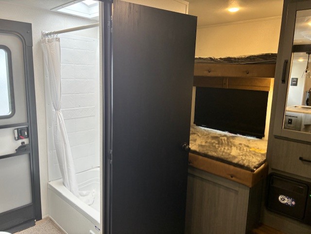 With two full bathrooms, it's a clean decision to take this travel trailer on your next family vacation! Start each morning feeling recharged after sleeping on the queen bed in the front private bedroom or in the rear private bunkhouse with an angled top bunk above a 32" x 69" double bunk bed and a 32" x 69" bunk above a 68" sofa slide. The bunkhouse also has a full bathroom with a 24" x 40" tub and one of the dual entry doors to the unit. You can relax on the sofa while enjoying the entertainment center and eat your meals prepared with the kitchen island at the booth dinette.
