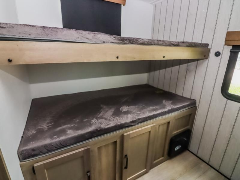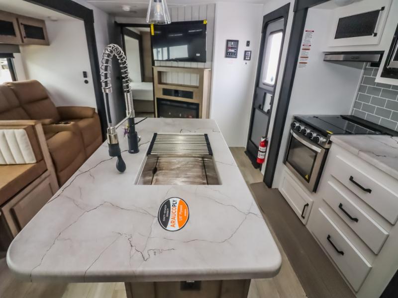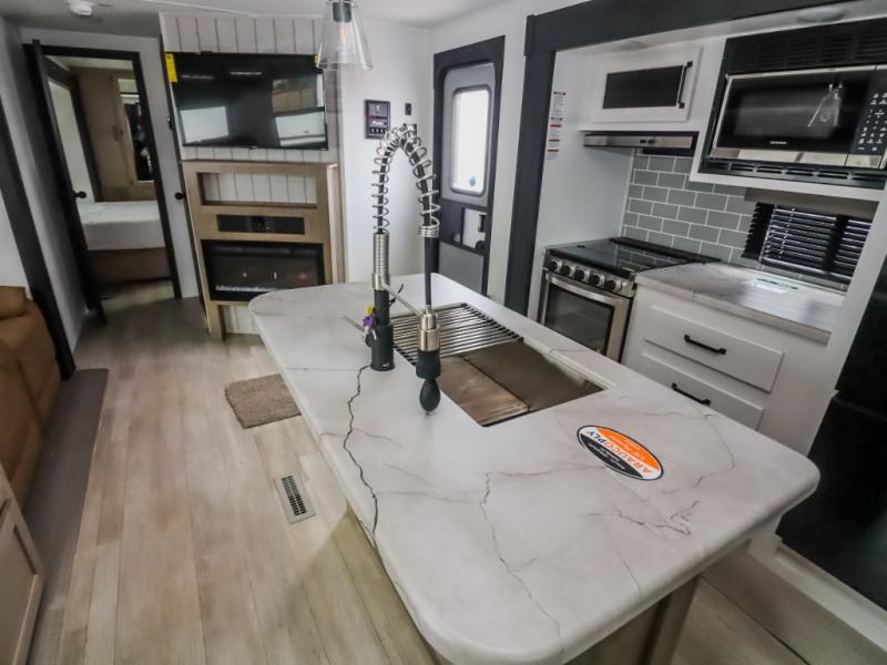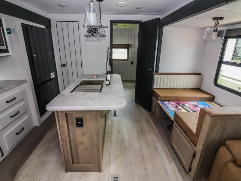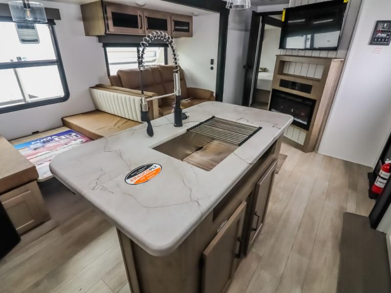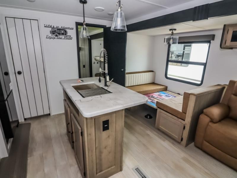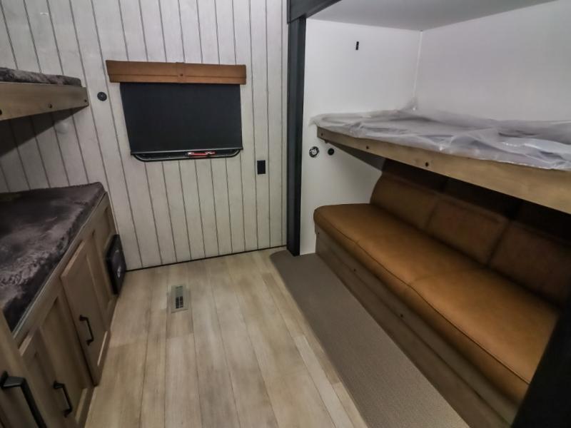 You will be the talk of the campground with this travel trailer! The front private bedroom has a queen bed slide across from a dresser and a front closet plus a second closet with washer and dryer prep . Freshen up each morning in the full bathroom with the 34" x 34" radius shower then head to the kitchen to fry up some eggs with the stainless steel oven and range. You can enjoy your meals at the booth dinette, and the kitchen island will make your clean up easier with the sink that has a high rise faucet and sprayer. The rear private bunkhouse has a 32" x 69" bunk above a jiffy sofa slide, a 36" x 69" bunk above a 36" x 71" bunk and a linen closet. Choose the optional outside mini kitchen for even more convenience!