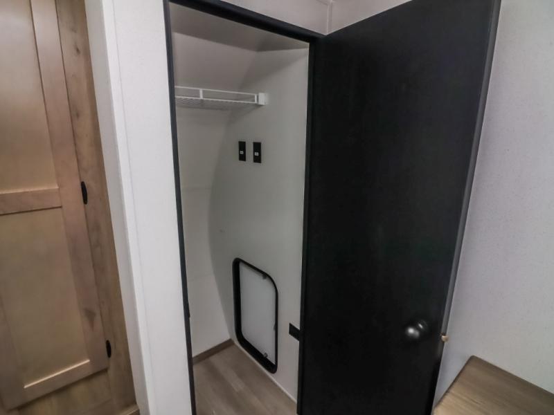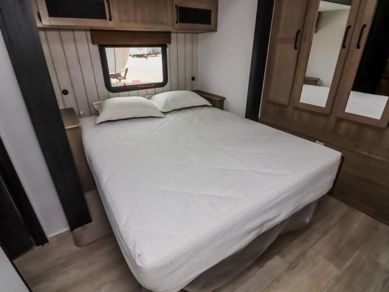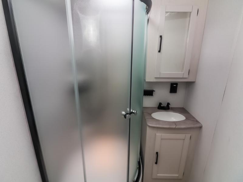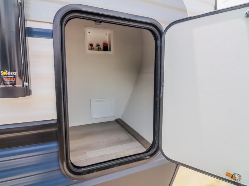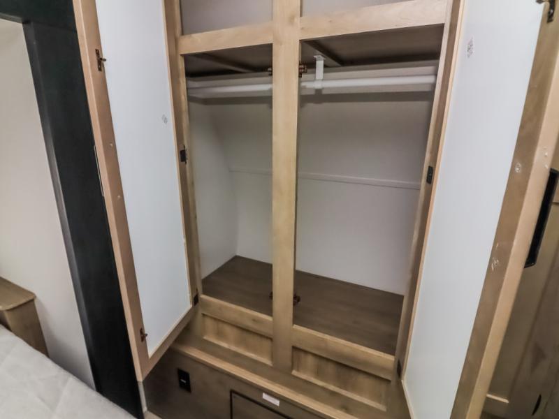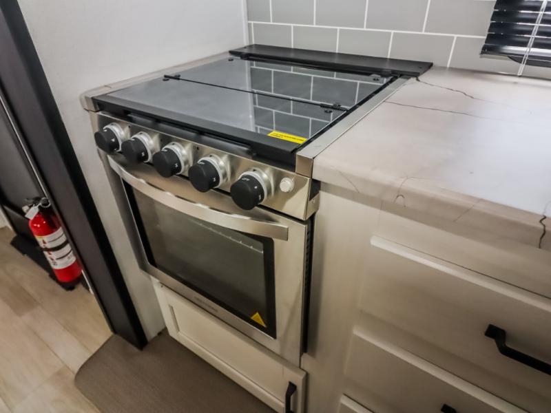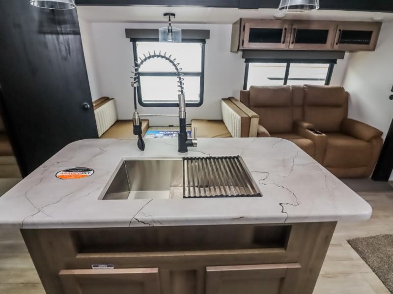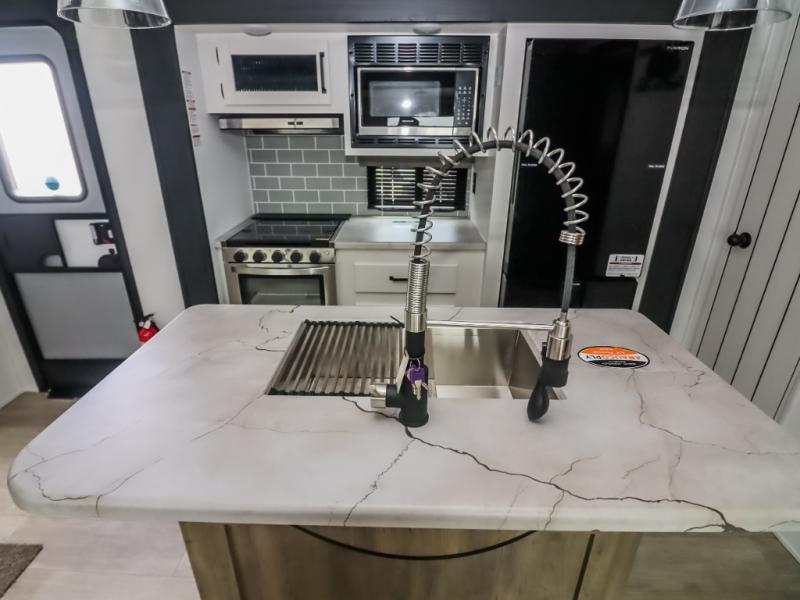 You will be the talk of the campground with this travel trailer! The front private bedroom has a queen bed slide across from a dresser and a front closet plus a second closet with washer and dryer prep . Freshen up each morning in the full bathroom with the 34" x 34" radius shower then head to the kitchen to fry up some eggs with the stainless steel oven and range. You can enjoy your meals at the booth dinette, and the kitchen island will make your clean up easier with the sink that has a high rise faucet and sprayer. The rear private bunkhouse has a 32" x 69" bunk above a jiffy sofa slide, a 36" x 69" bunk above a 36" x 71" bunk and a linen closet. Choose the optional outside mini kitchen for even more convenience!