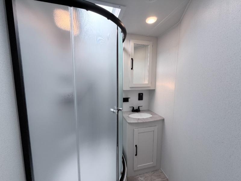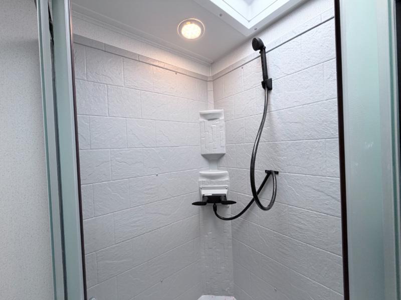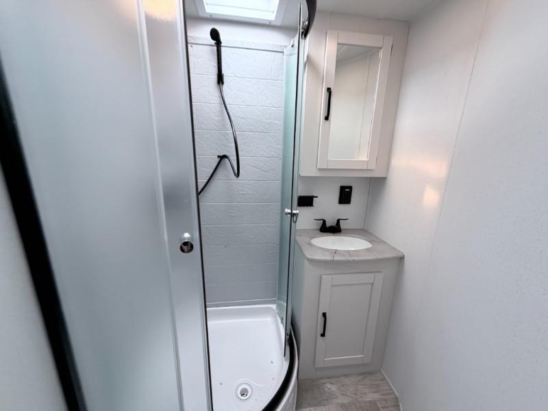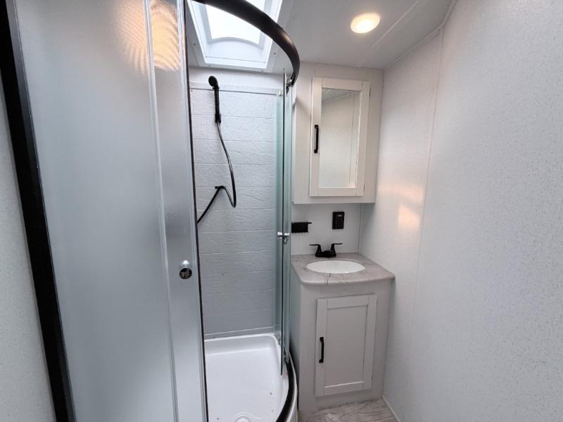 - Full bathroom with 34" x 34" radius shower, toilet, and sink