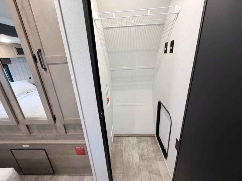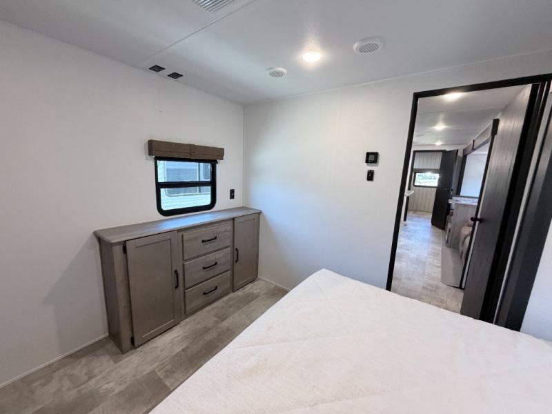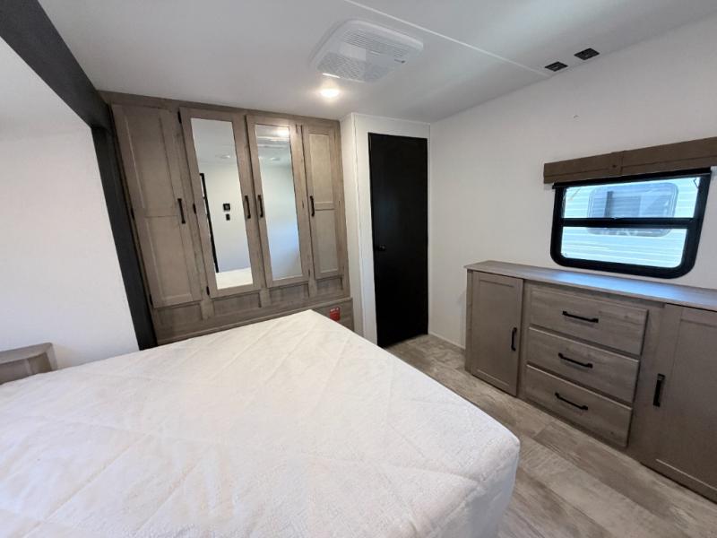 - Front private bedroom with queen bed slide, dresser, and dual closets