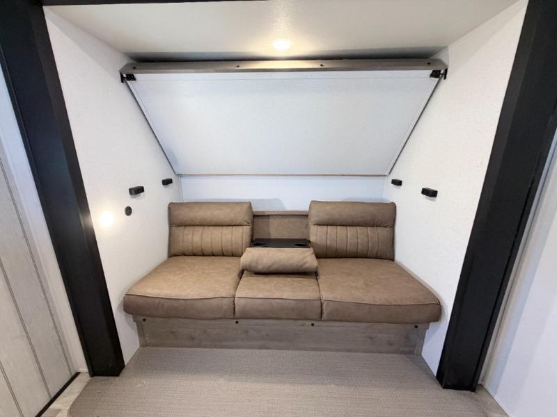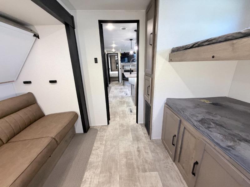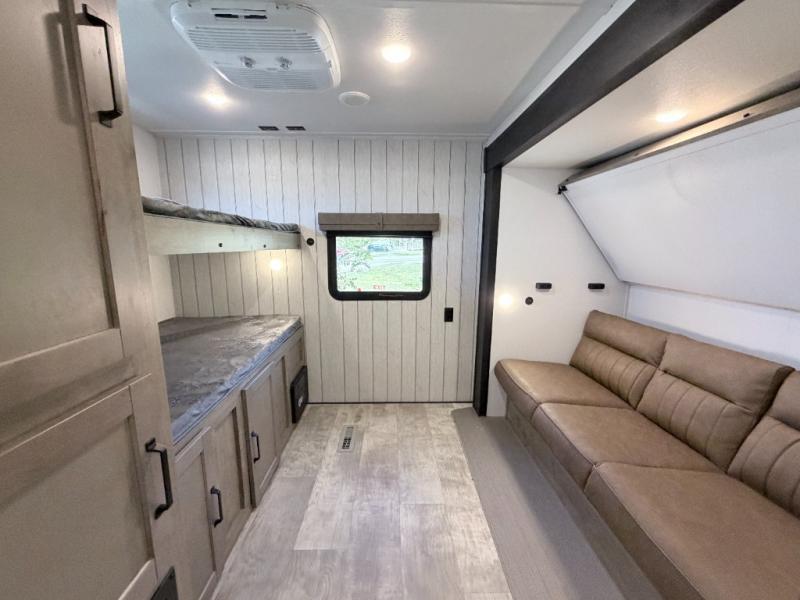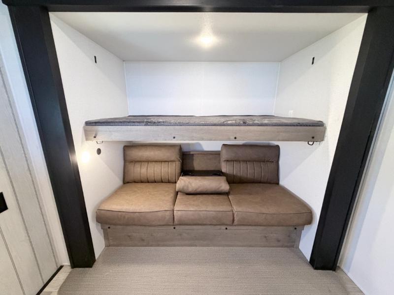 - Rear private bunkhouse with multiple bunks and a jiffy sofa slide for extra sleeping space