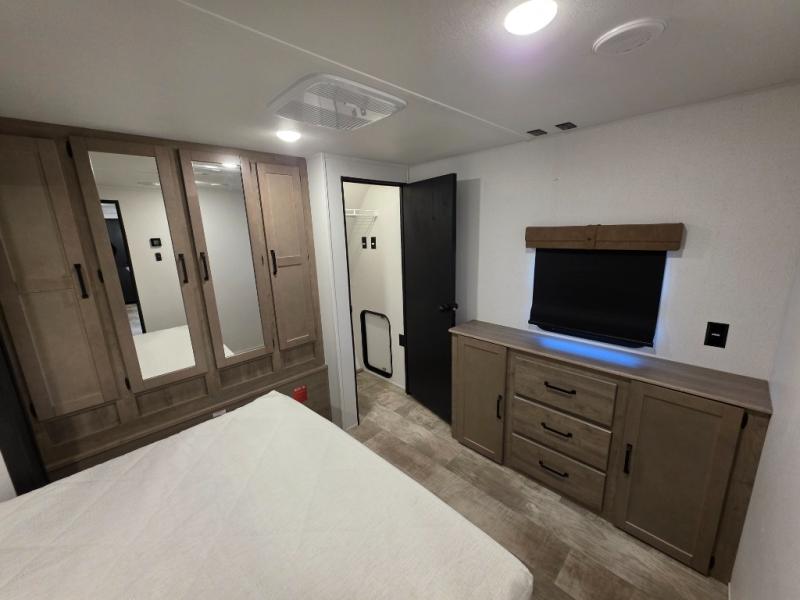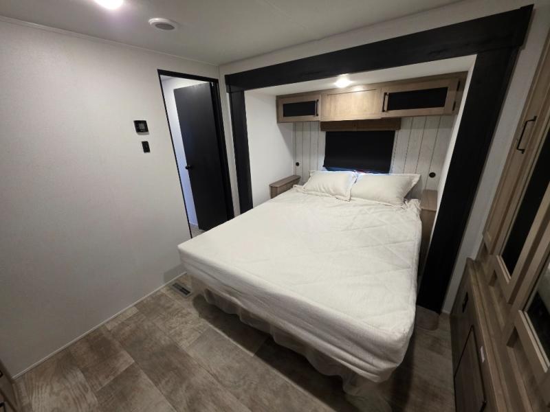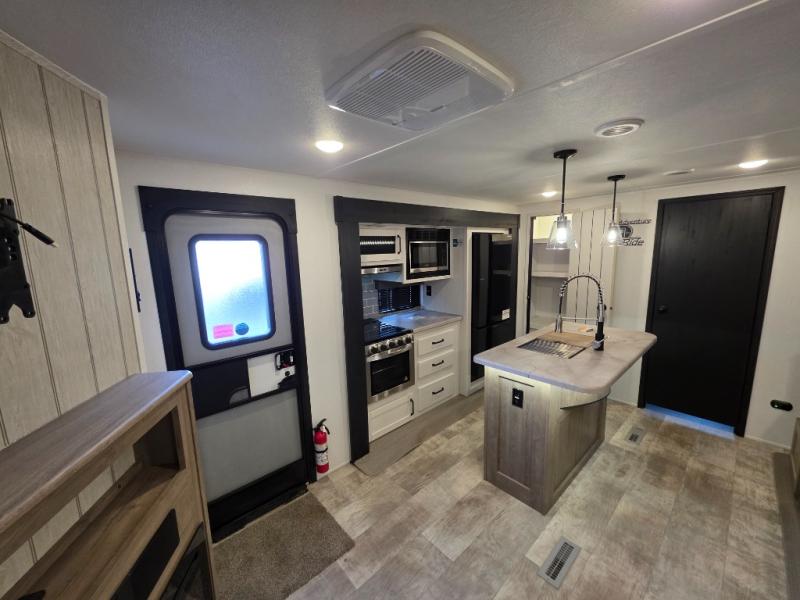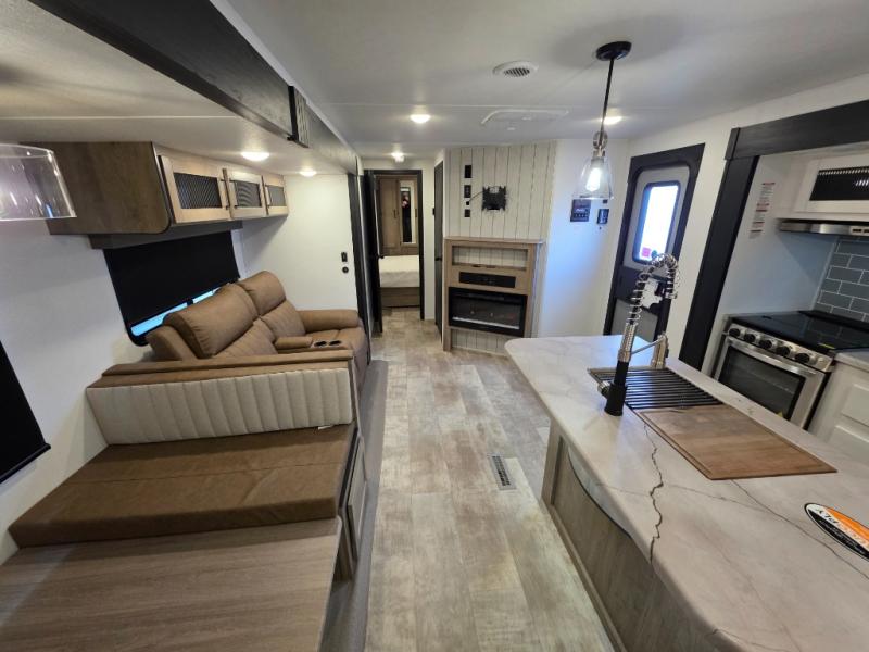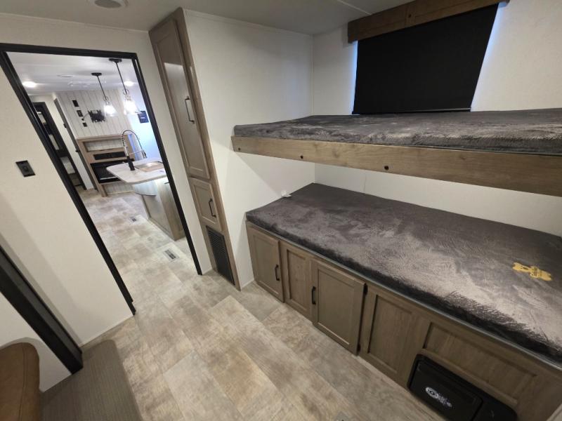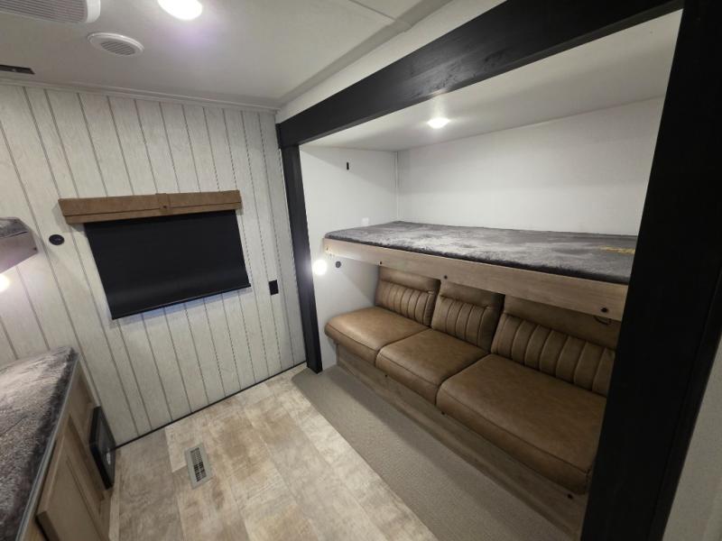 You will be the talk of the campground with this travel trailer! The front private bedroom has a queen bed slide across from a dresser and a front closet plus a second closet with washer and dryer prep. Freshen up each morning in the full bathroom with the 34" x 34" radius shower then head to the kitchen to fry up some eggs with the stainless-steel oven and range. You can enjoy your meals at the booth dinette, and the kitchen island will make your clean up easier with the sink that has a high-rise faucet and sprayer. The rear private bunkhouse has a 32" x 69" bunk above a jiffy sofa slide, a 36" x 69" bunk above a 36" x 71" bunk and a linen closet. Choose one of the outside kitchen options for even more convenience!