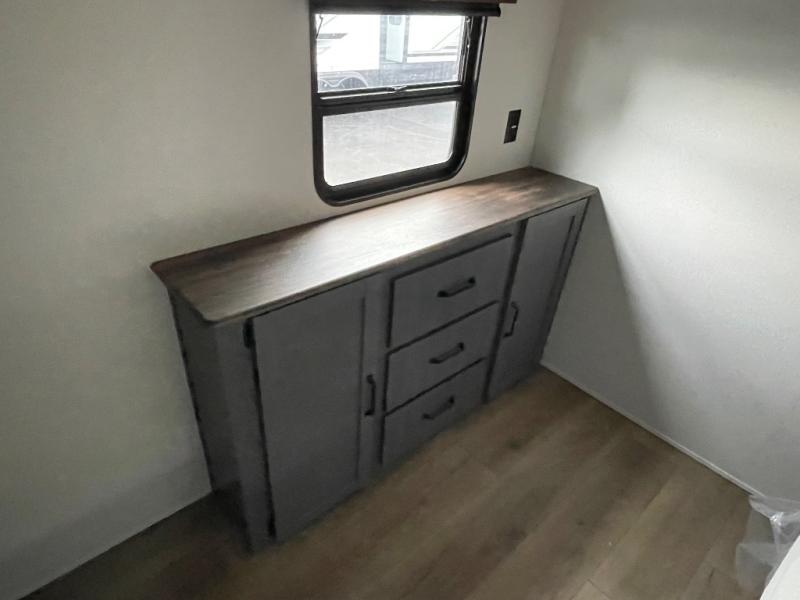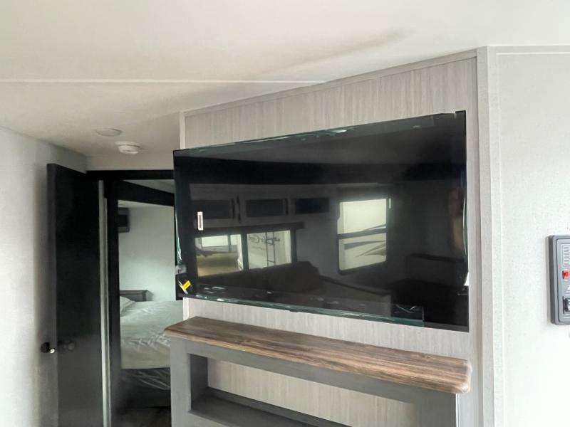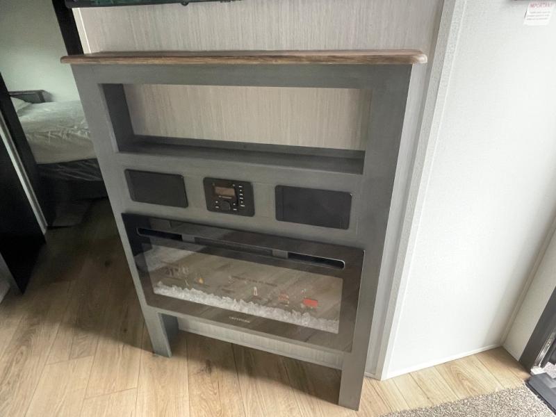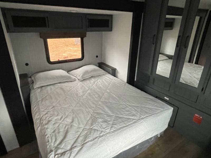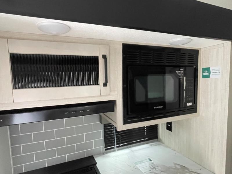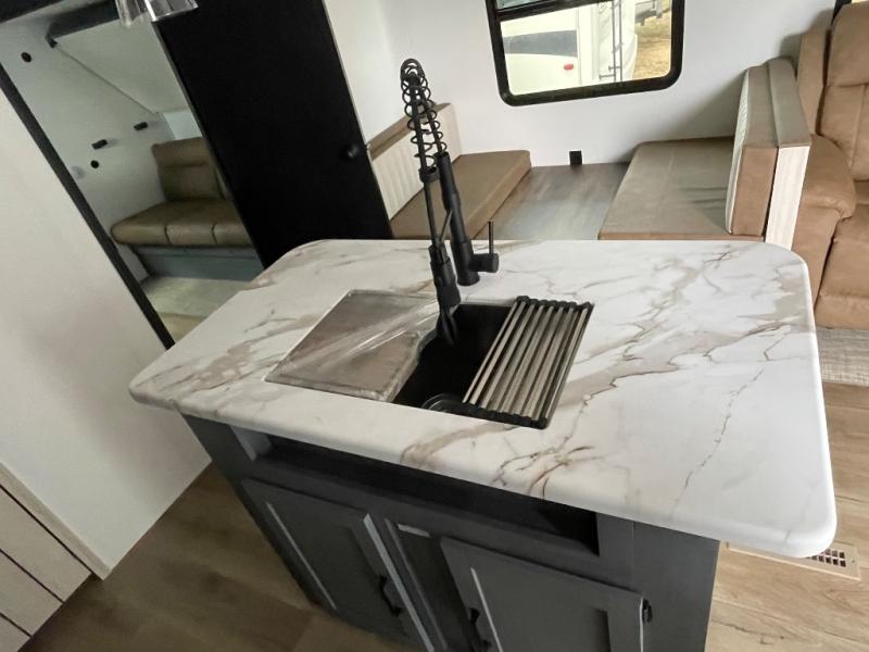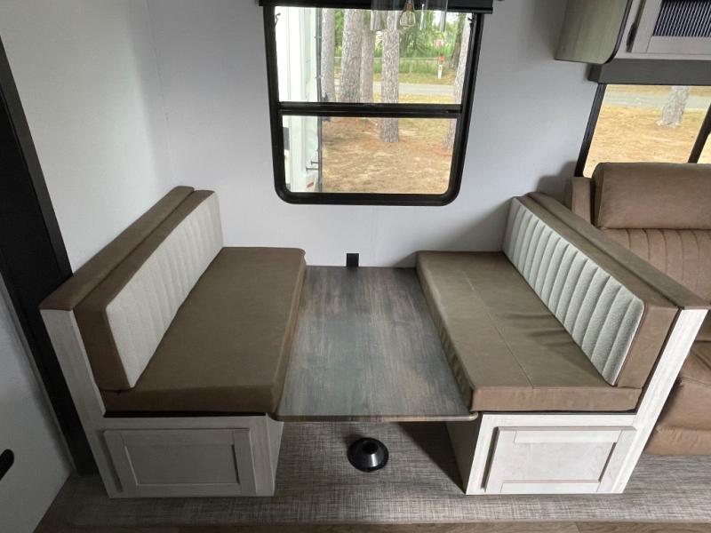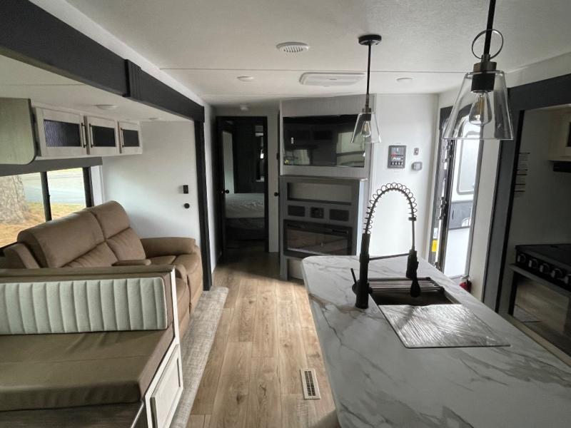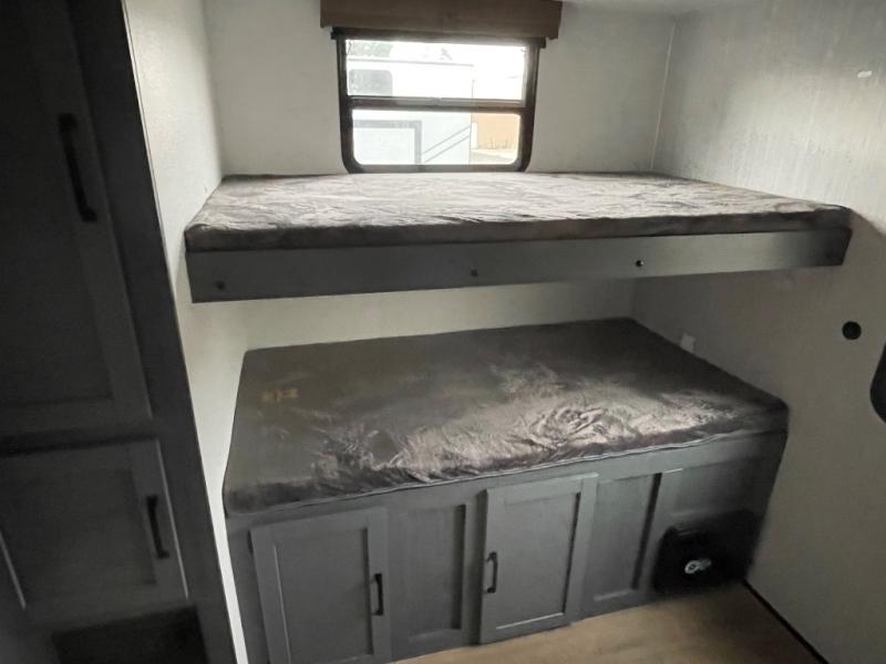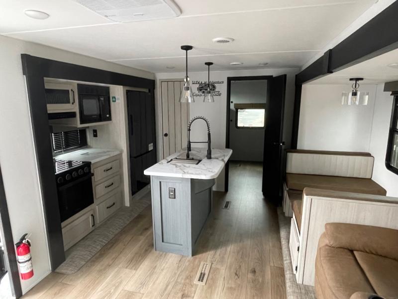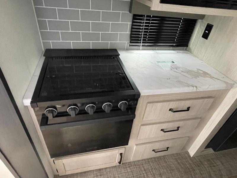 You will be the talk of the campground with this travel trailer! The front private bedroom has a queen bed slide across from a dresser and a front closet plus a second closet with washer and dryer prep . Freshen up each morning in the full bathroom with the 34" x 34" radius shower then head to the kitchen to fry up some eggs with the stainless steel oven and range. You can enjoy your meals at the booth dinette, and the kitchen island will make your clean up easier with the sink that has a high rise faucet and sprayer. The rear private bunkhouse has a 32" x 69" bunk above a jiffy sofa slide, a 36" x 69" bunk above a 36" x 71" bunk and a linen closet. Choose the optional outside mini kitchen for even more convenience!