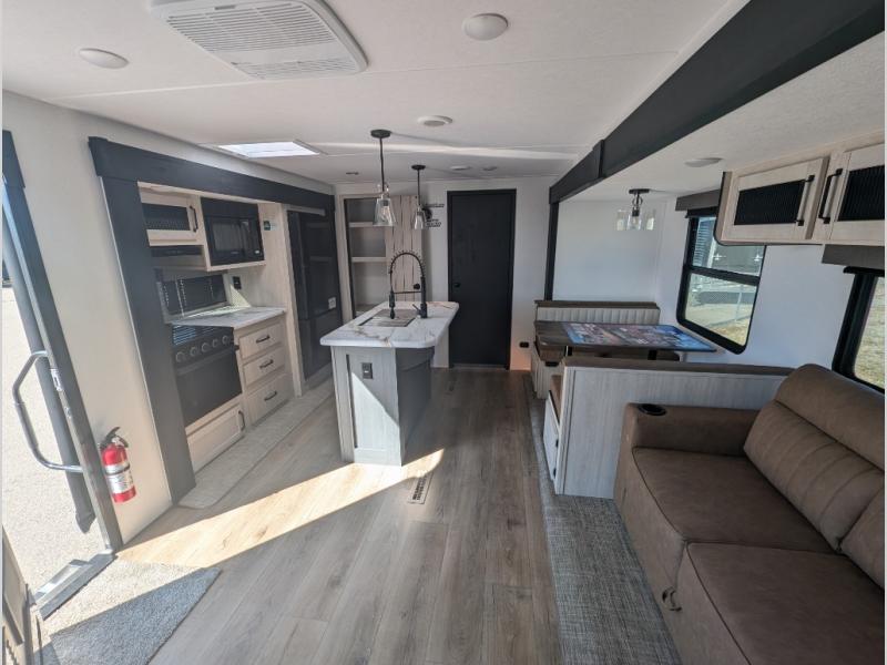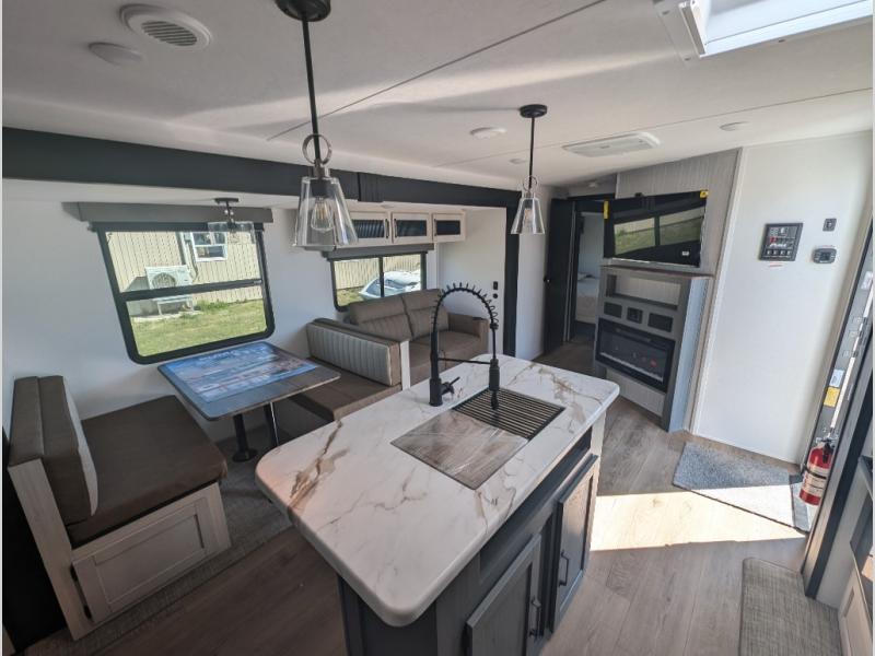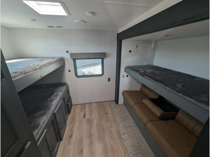 The rear bunkhouse is perfect for kids or guests with dual bunk beds, a jiffy sofa, and ample storage. Mealtime is a breeze thanks to the stainless steel kitchen appliances, center island with sink and sprayer, and the cozy booth dinette for dining and games.