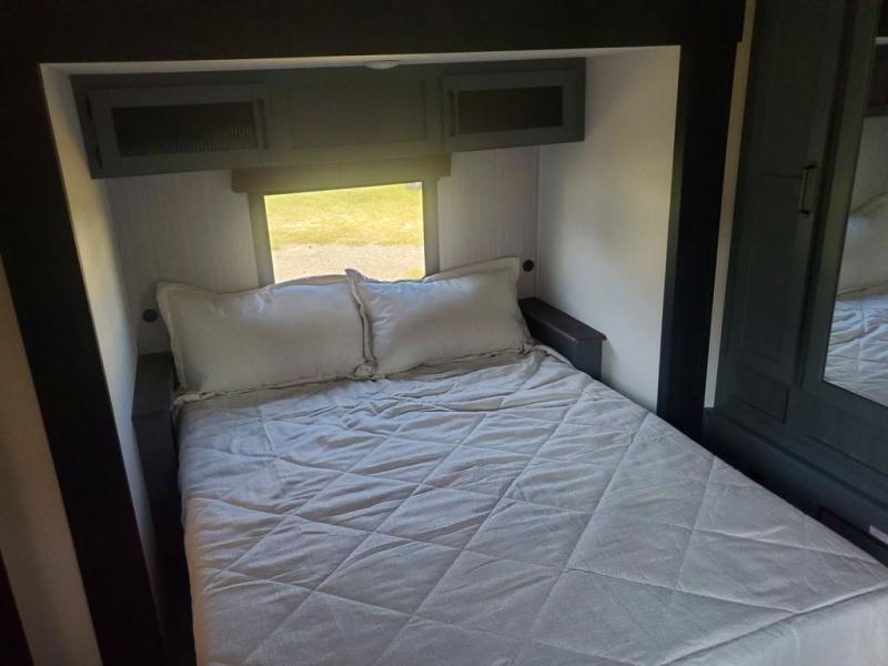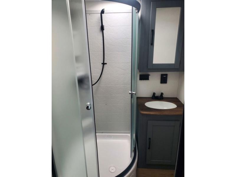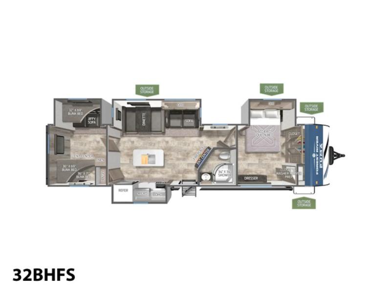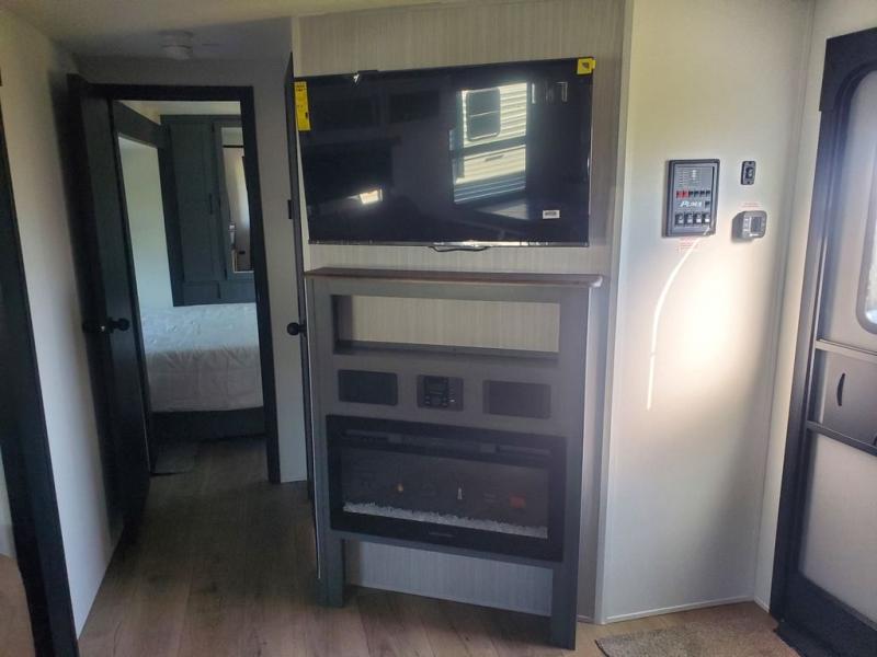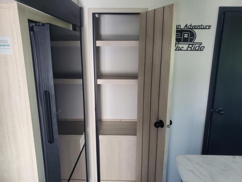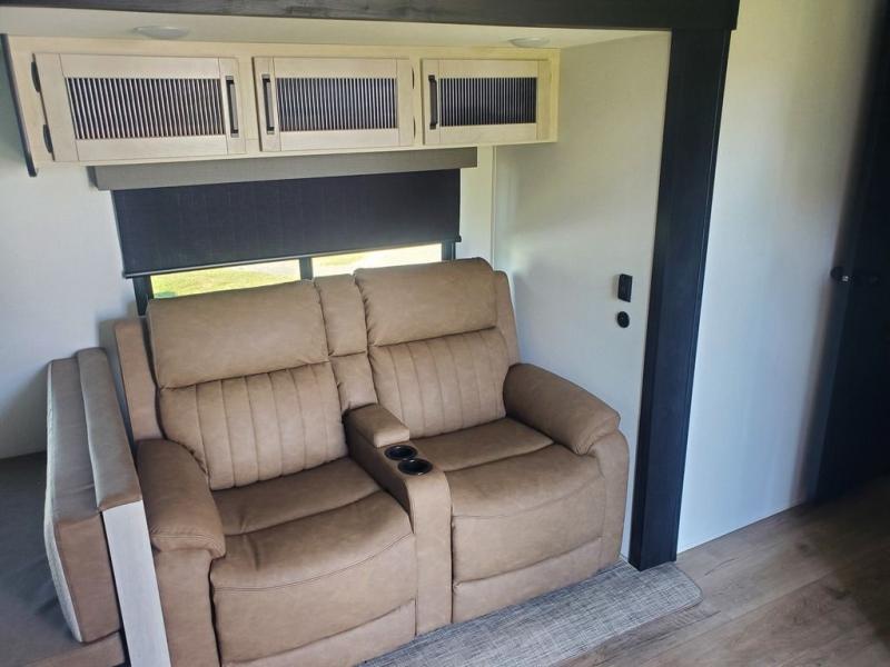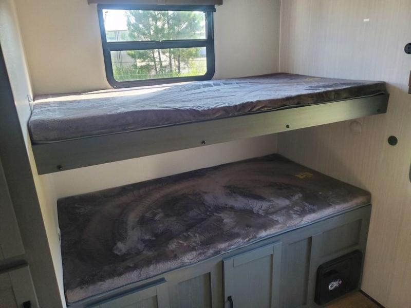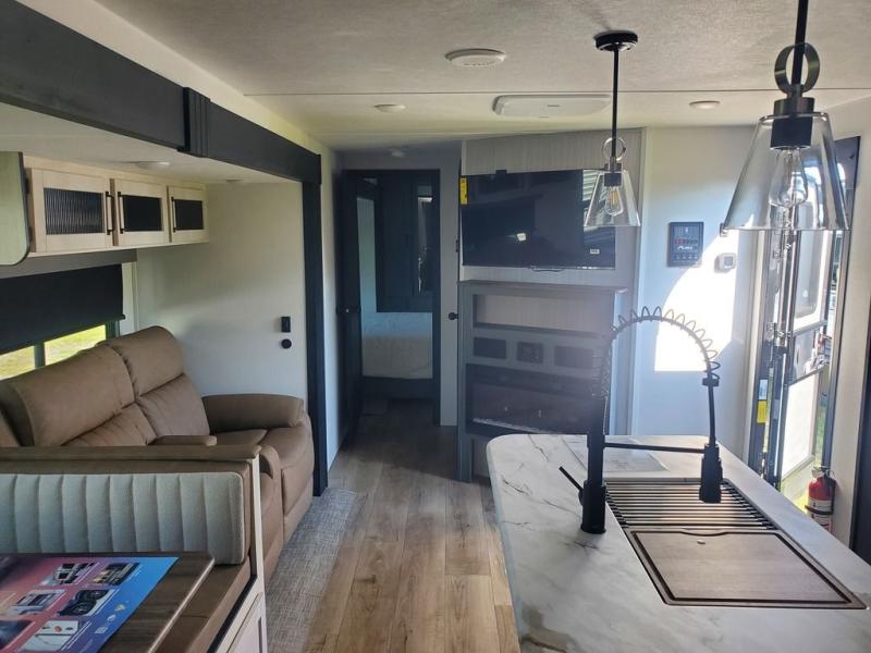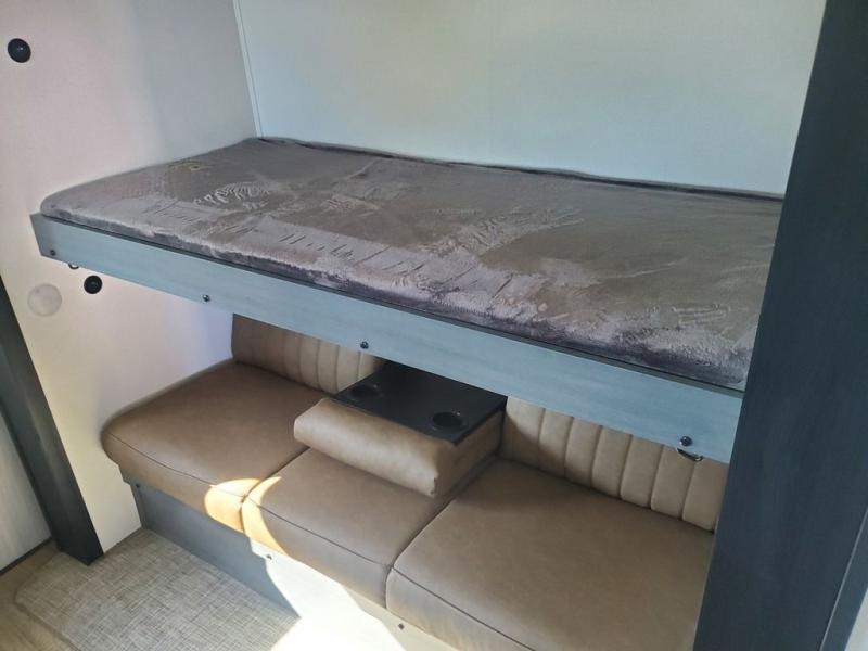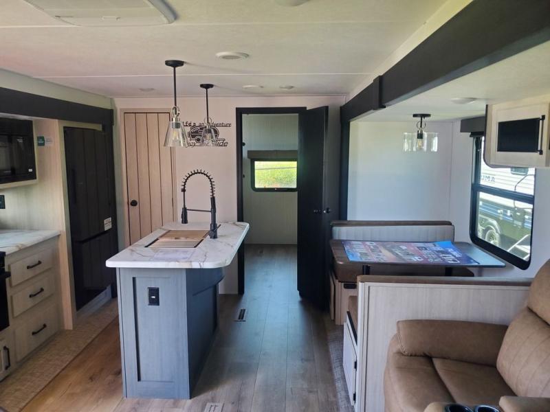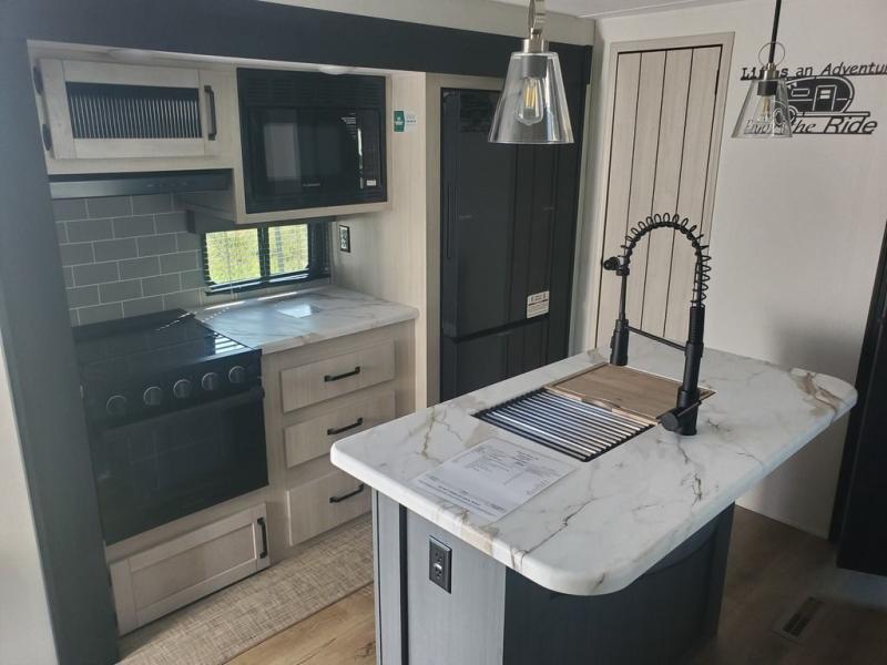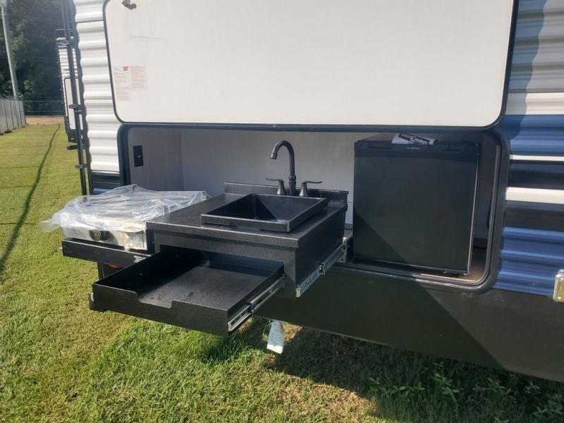 You will be the talk of the campground with this travel trailer! The front private bedroom has a queen bed slide across from a dresser and a front closet plus a second closet with washer and dryer prep. Freshen up each morning in the full bathroom with the 34" x 34" radius shower then head to the kitchen to fry up some eggs with the stainless-steel oven and range. You can enjoy your meals at the booth dinette, and the kitchen island will make your clean up easier with the sink that has a high-rise faucet and sprayer. The rear private bunkhouse has a 32" x 69" bunk above a jiffy sofa slide, a 36" x 69" bunk above a 36" x 71" bunk and a linen closet. Choose one of the outside kitchen options for even more convenience!