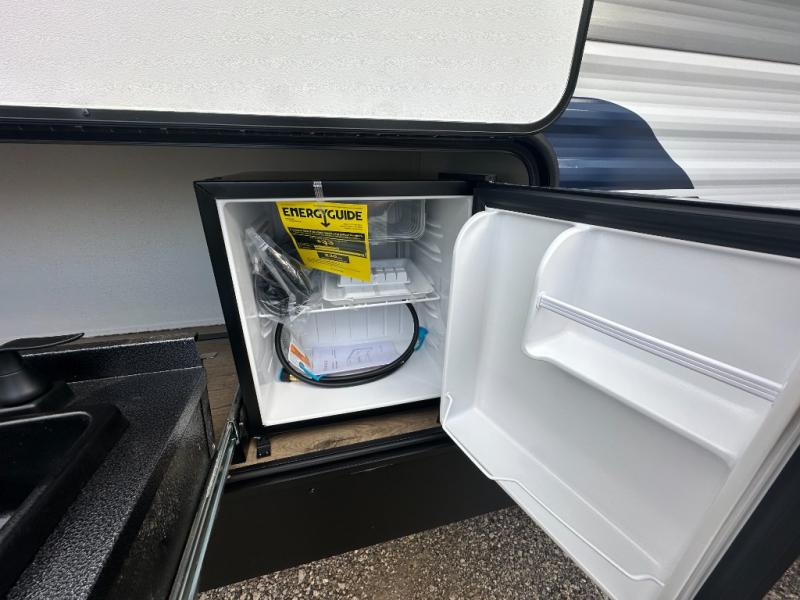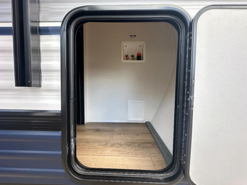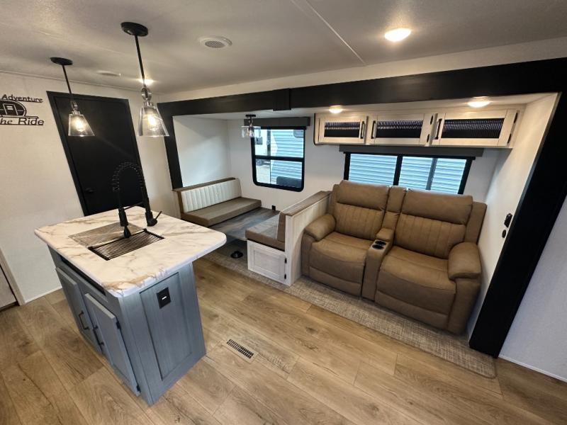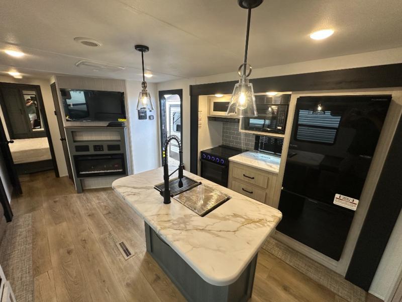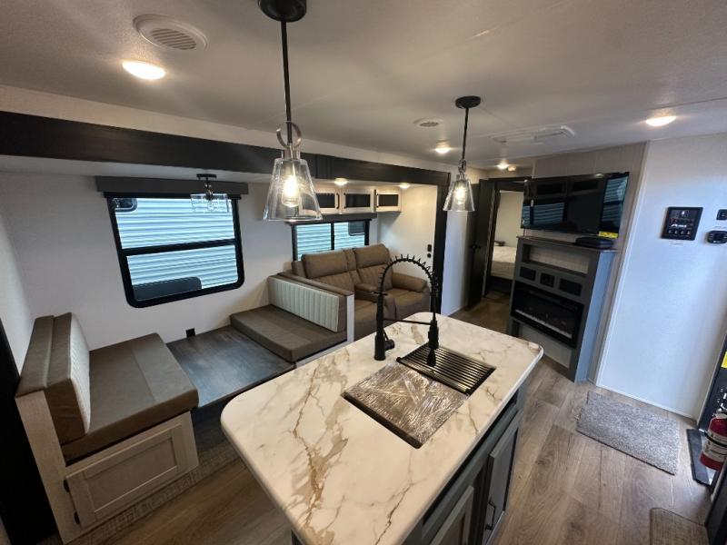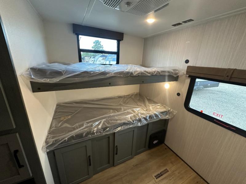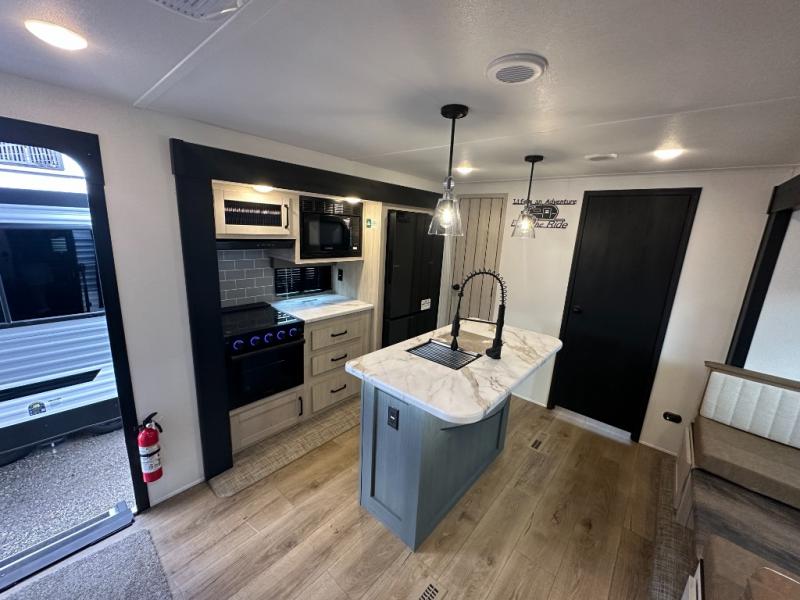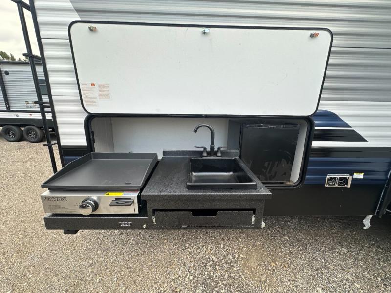 You will be the talk of the campground with this travel trailer! The front private bedroom has a queen bed slide across from a dresser and a front closet plus a second closet with washer and dryer prep . Freshen up each morning in the full bathroom with the 34" x 34" radius shower then head to the kitchen to fry up some eggs with the stainless steel oven and range. You can enjoy your meals at the booth dinette, and the kitchen island will make your clean up easier with the sink that has a high rise faucet and sprayer. The rear private bunkhouse has a 32" x 69" bunk above a jiffy sofa slide, a 36" x 69" bunk above a 36" x 71" bunk and a linen closet. Choose the optional outside mini kitchen for even more convenience!