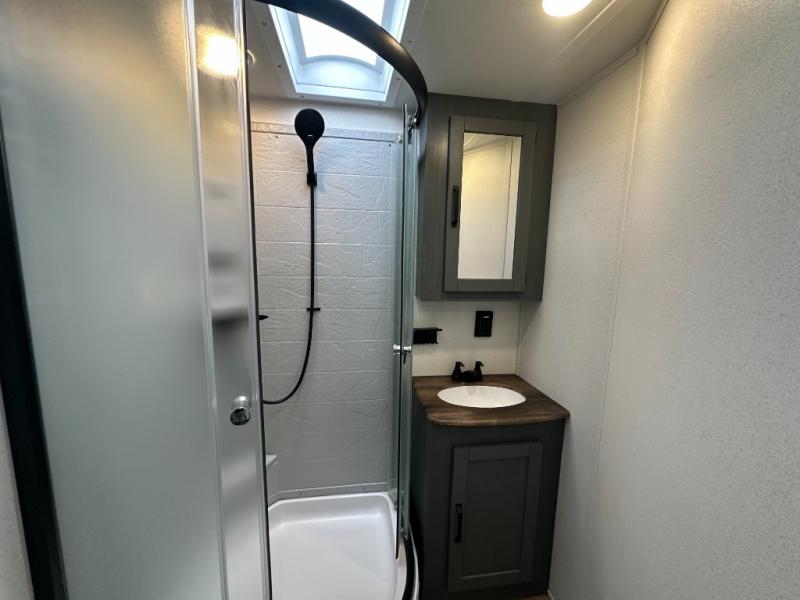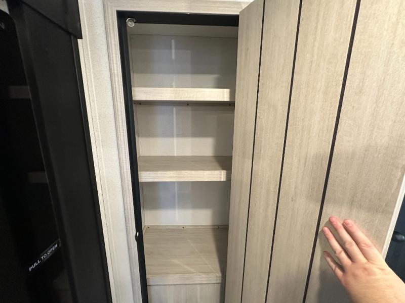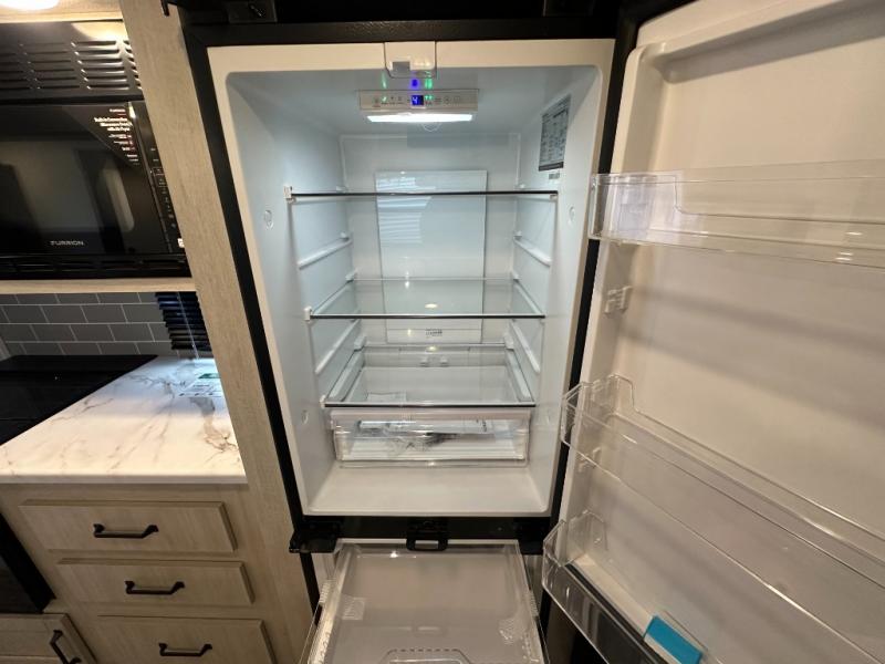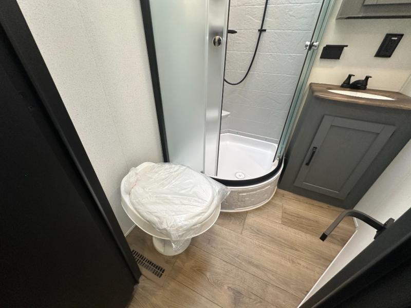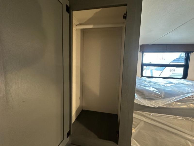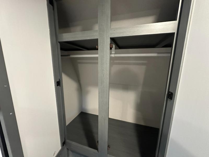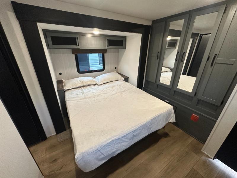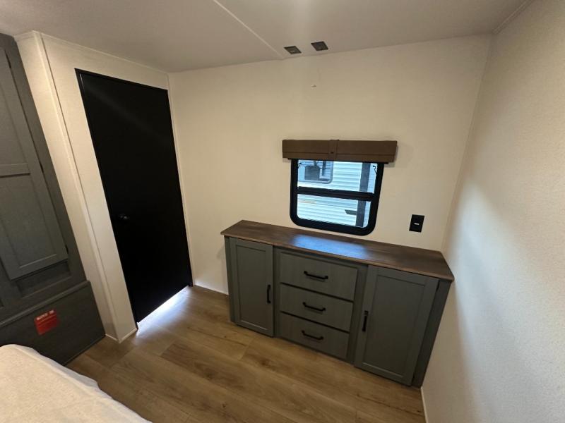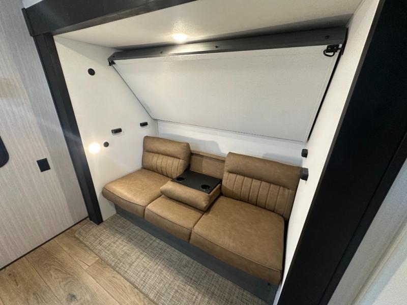 You will be the talk of the campground with this travel trailer! The front private bedroom has a queen bed slide across from a dresser and a front closet plus a second closet with washer and dryer prep . Freshen up each morning in the full bathroom with the 34" x 34" radius shower then head to the kitchen to fry up some eggs with the stainless steel oven and range. You can enjoy your meals at the booth dinette, and the kitchen island will make your clean up easier with the sink that has a high rise faucet and sprayer. The rear private bunkhouse has a 32" x 69" bunk above a jiffy sofa slide, a 36" x 69" bunk above a 36" x 71" bunk and a linen closet. Choose the optional outside mini kitchen for even more convenience!