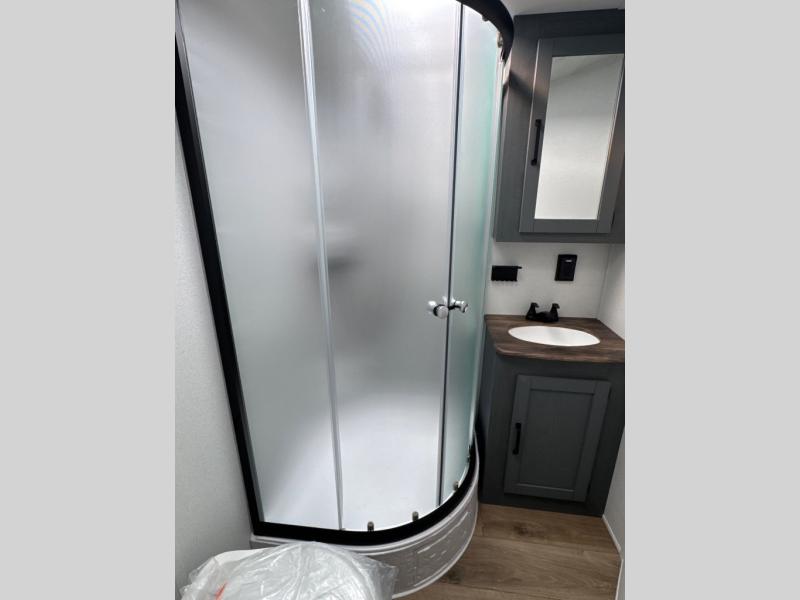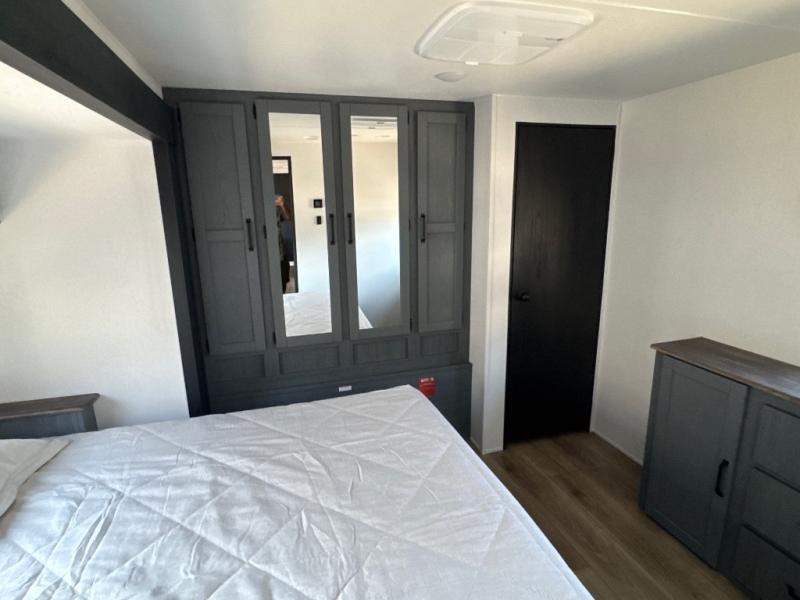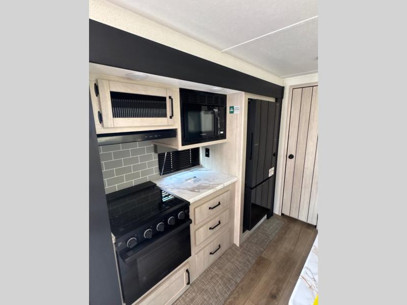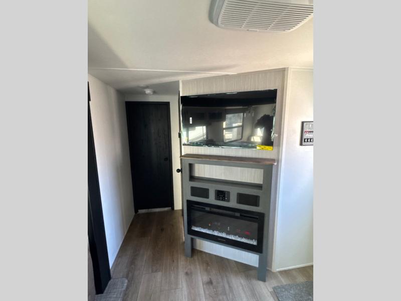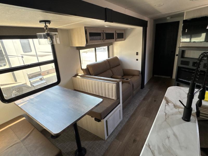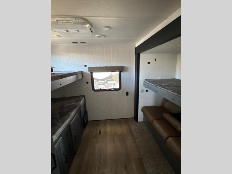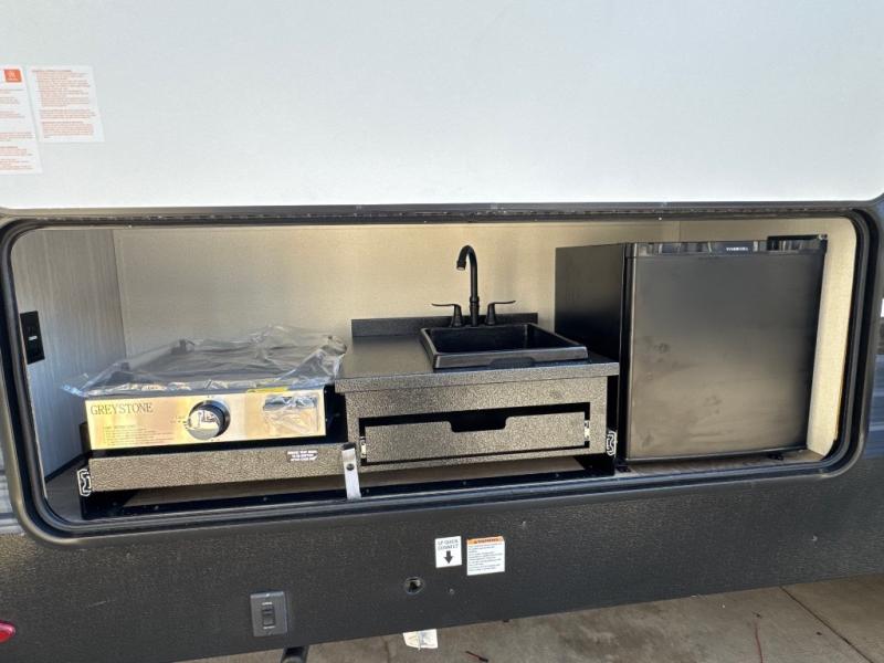 You will be the talk of the campground with this travel trailer! The front private bedroom has a queen bed slide across from a dresser and a front closet plus a second closet with washer and dryer prep . Freshen up each morning in the full bathroom with the 34" x 34" radius shower then head to the kitchen to fry up some eggs with the stainless steel oven and range. You can enjoy your meals at the booth dinette, and the kitchen island will make your clean up easier with the sink that has a high rise faucet and sprayer. The rear private bunkhouse has a 32" x 69" bunk above a jiffy sofa slide, a 36" x 69" bunk above a 36" x 71" bunk and a linen closet. Choose the optional outside mini kitchen for even more convenience!