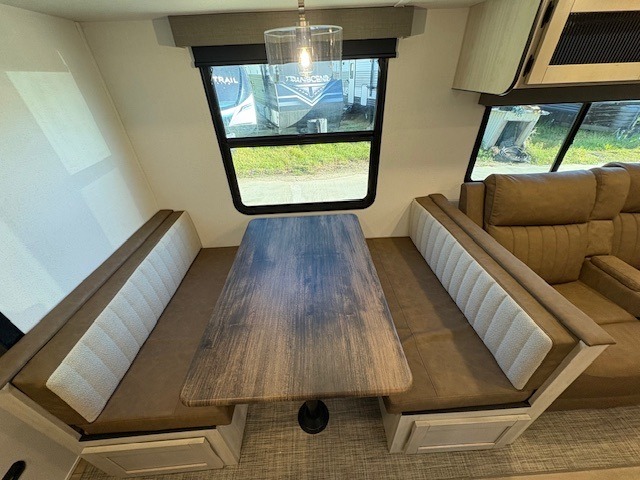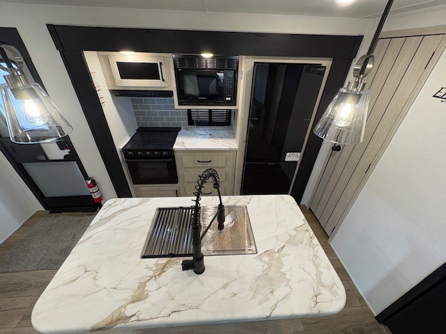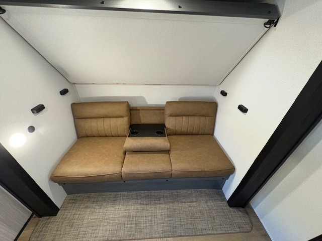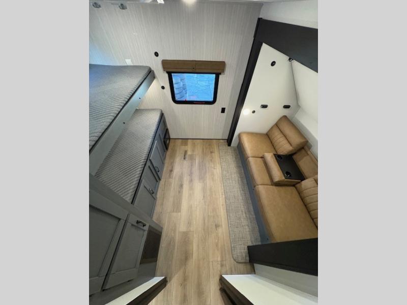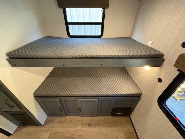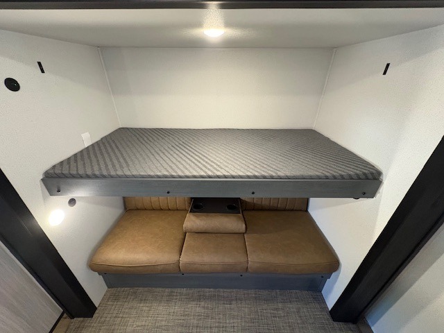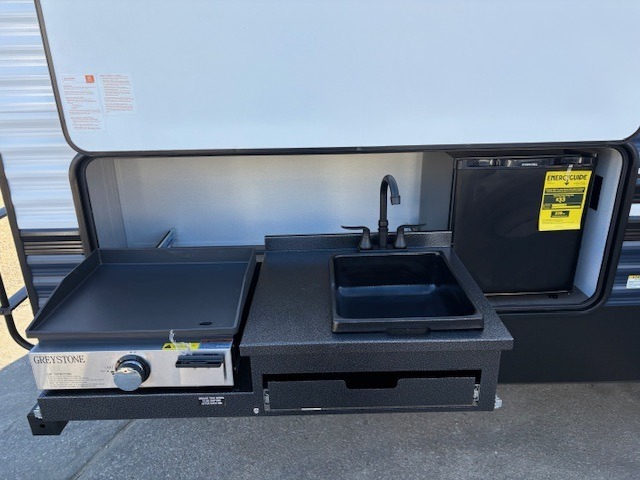 You will be the talk of the campground with this travel trailer! The front private bedroom has a queen bed slide across from a dresser and a front closet plus a second closet with washer and dryer prep. Freshen up each morning in the full bathroom with the 34" x 34" radius shower then head to the kitchen to fry up some eggs with the stainless-steel oven and range. You can enjoy your meals at the booth dinette, and the kitchen island will make your clean up easier with the sink that has a high-rise faucet and sprayer. The rear private bunkhouse has a 32" x 69" bunk above a jiffy sofa slide, a 36" x 69" bunk above a 36" x 71" bunk and a linen closet. Choose one of the outside kitchen options for even more convenience!