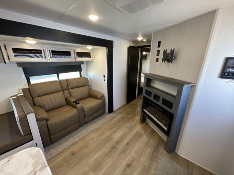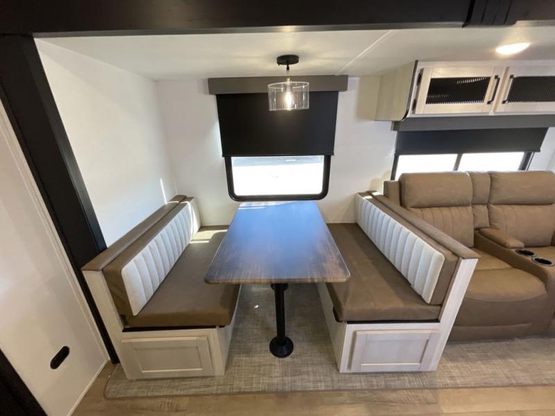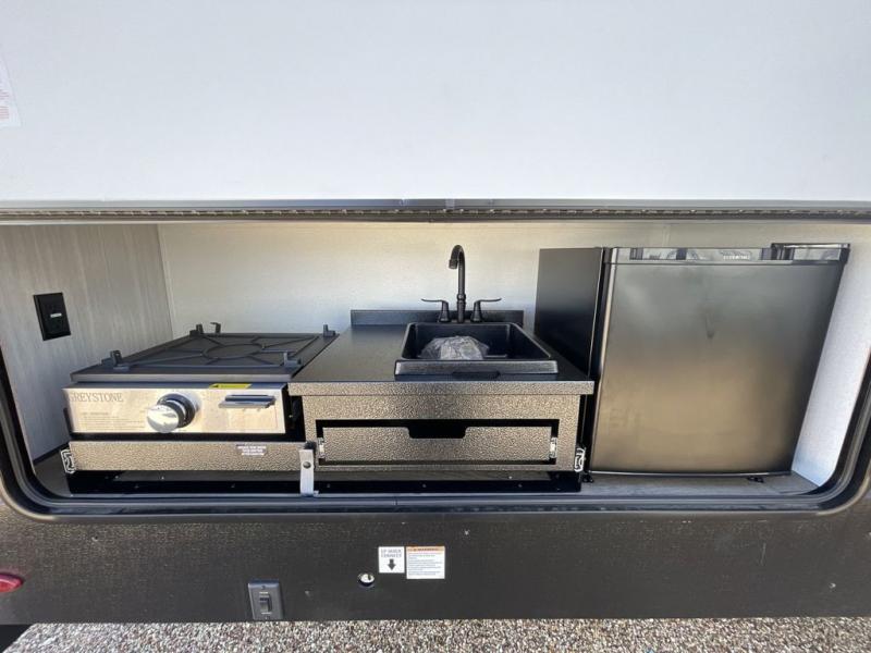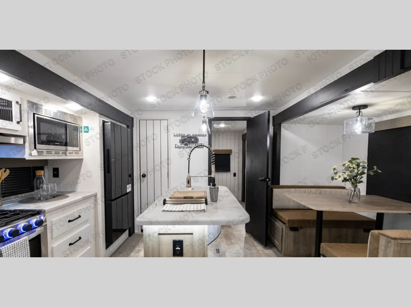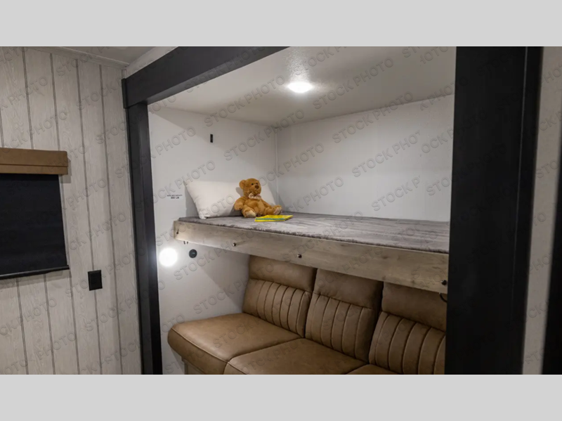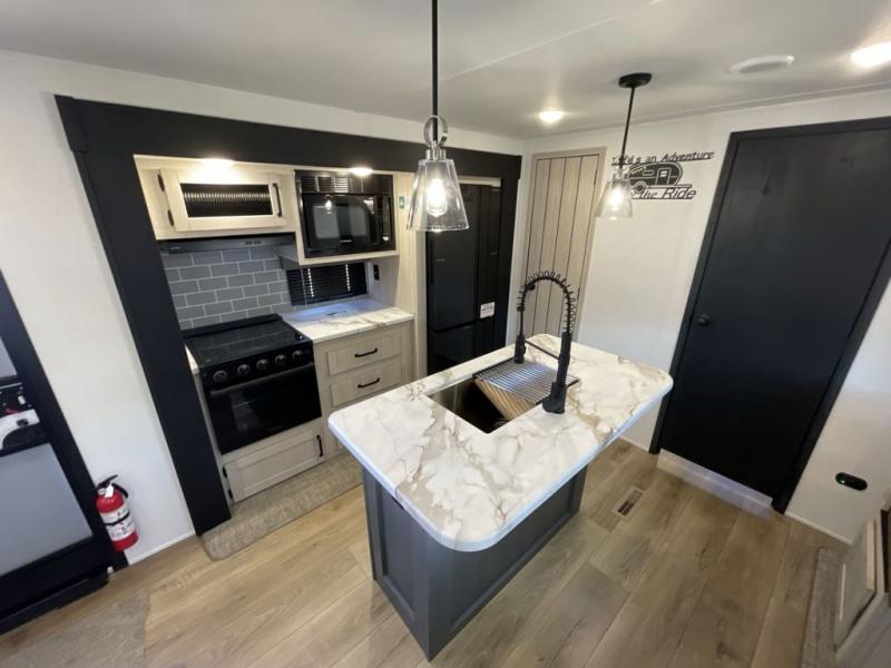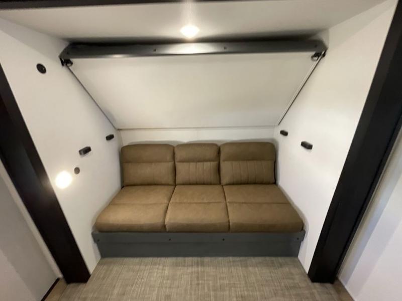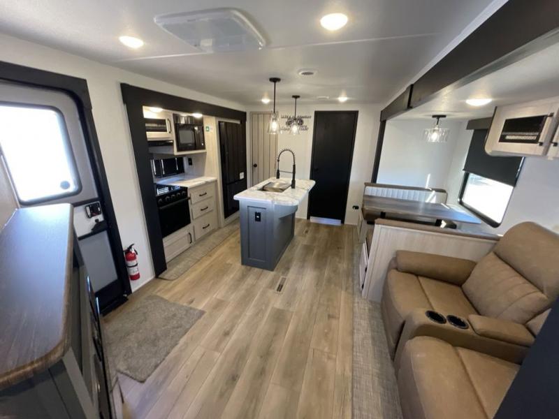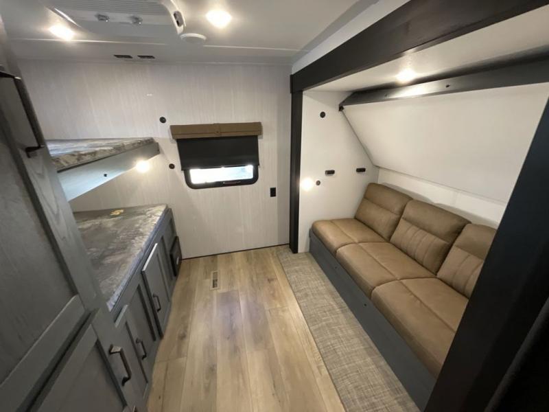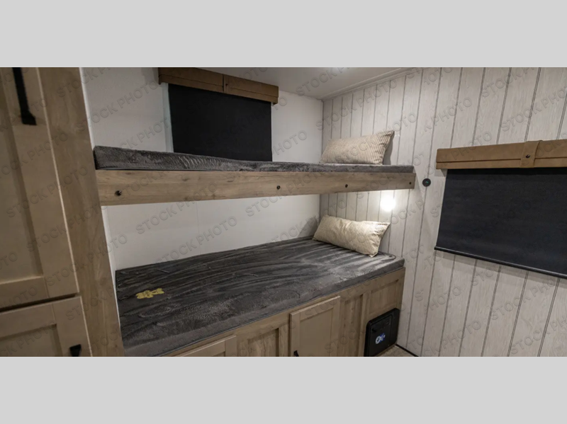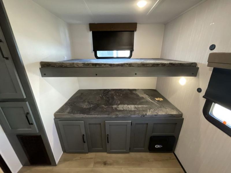 You will be the talk of the campground with this travel trailer! The front private bedroom has a queen bed slide across from a dresser and a front closet plus a second closet with washer and dryer prep . Freshen up each morning in the full bathroom with the 34" x 34" radius shower then head to the kitchen to fry up some eggs with the stainless steel oven and range. You can enjoy your meals at the booth dinette, and the kitchen island will make your clean up easier with the sink that has a high rise faucet and sprayer. The rear private bunkhouse has a 32" x 69" bunk above a jiffy sofa slide, a 36" x 69" bunk above a 36" x 71" bunk and a linen closet. Choose the optional outside mini kitchen for even more convenience!