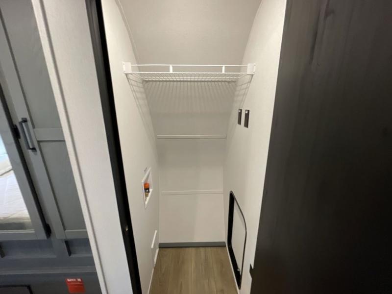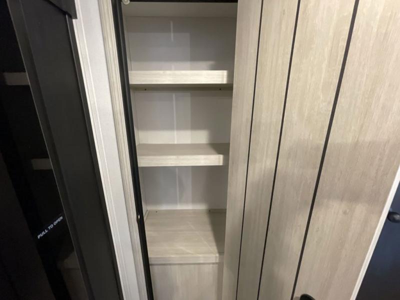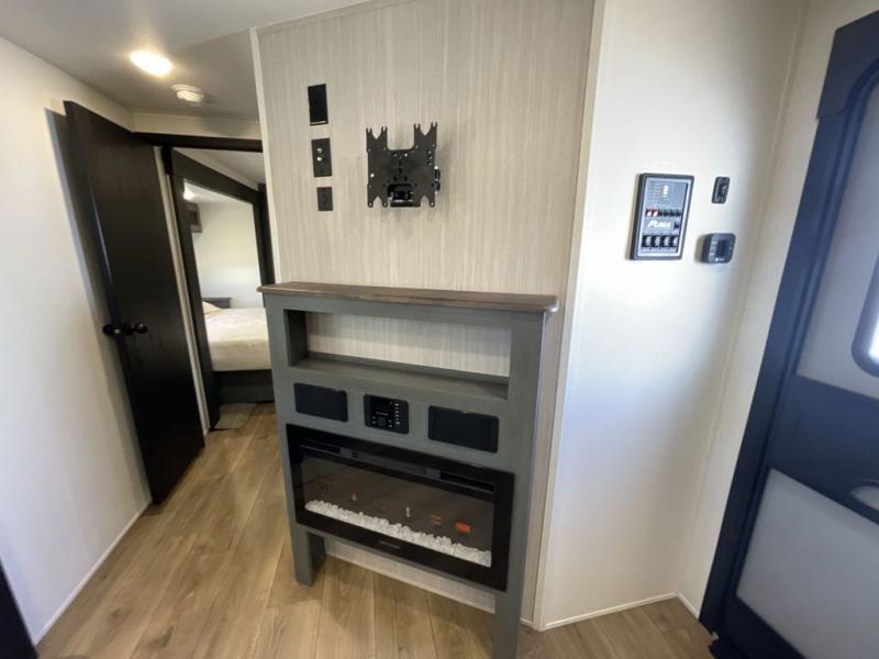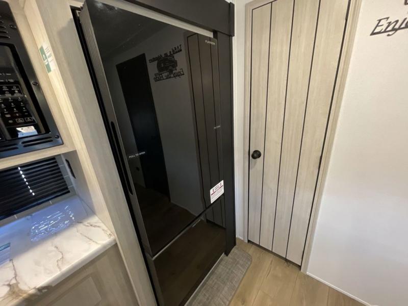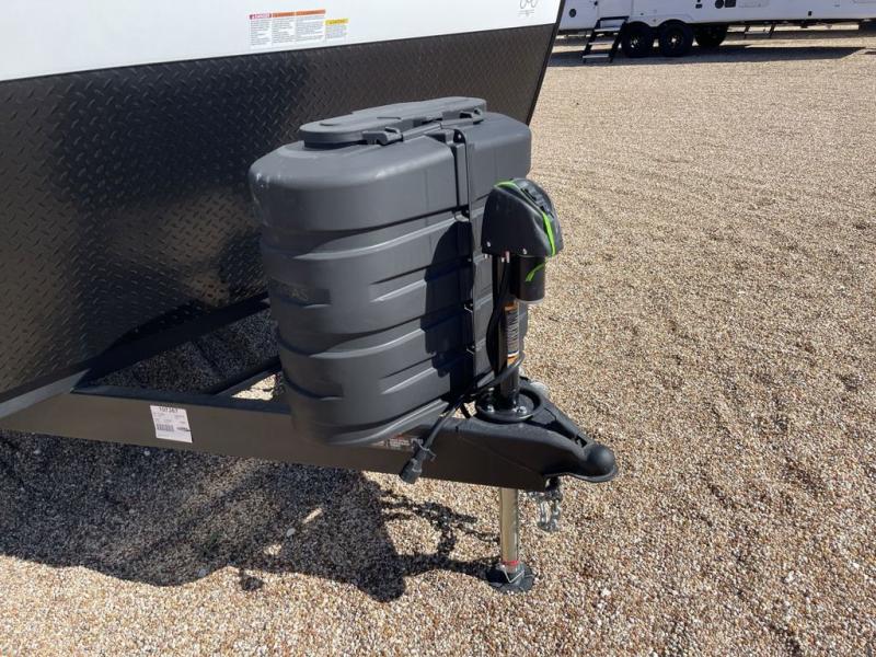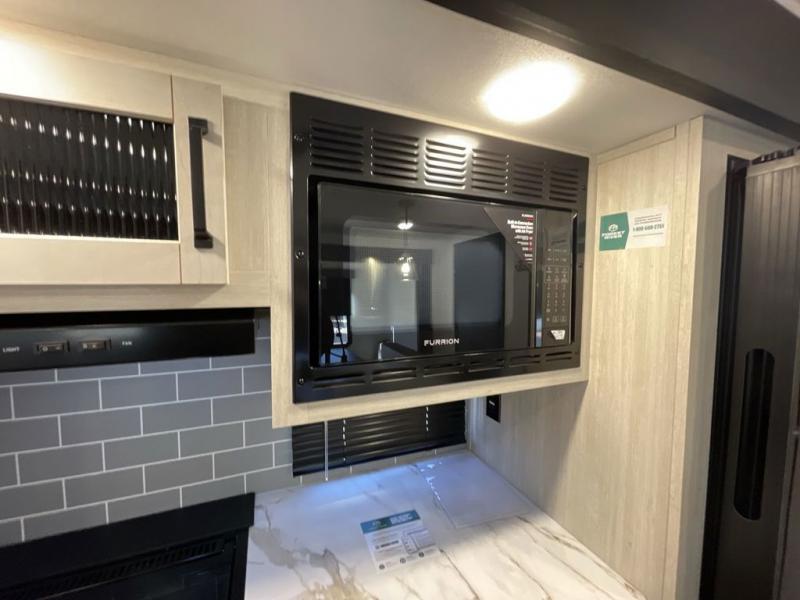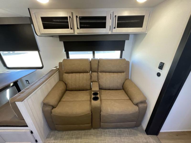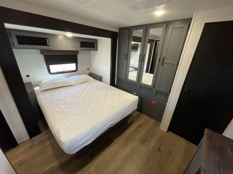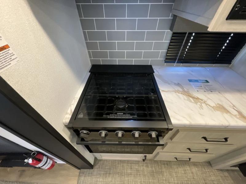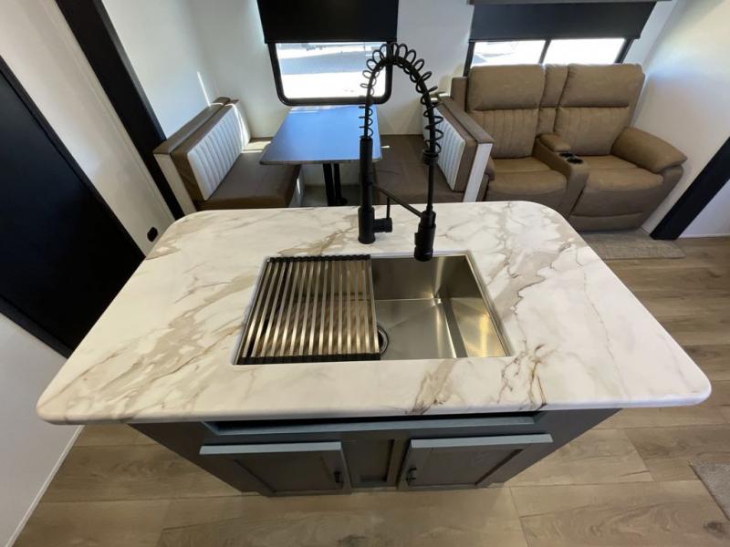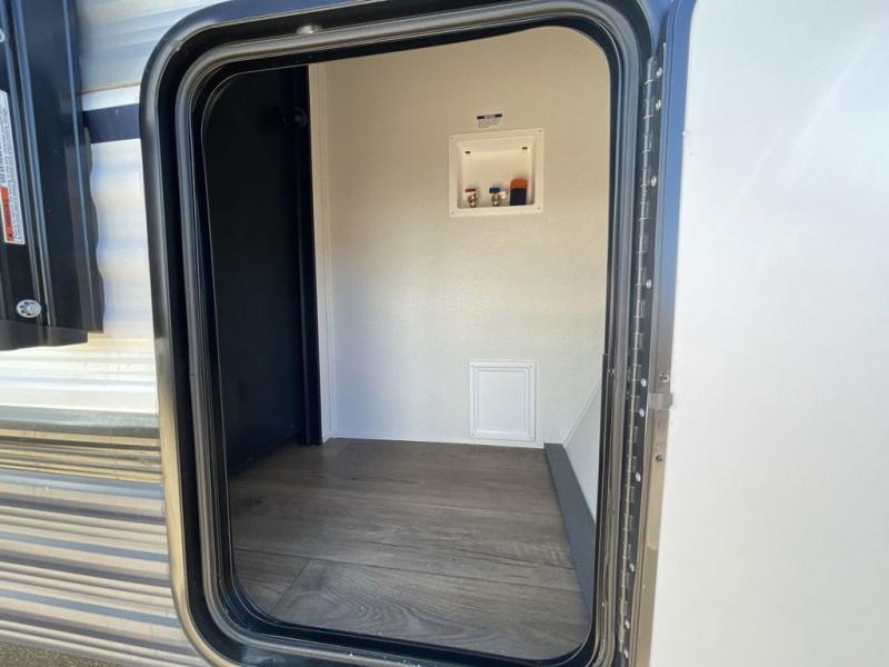 You will be the talk of the campground with this travel trailer! The front private bedroom has a queen bed slide across from a dresser and a front closet plus a second closet with washer and dryer prep . Freshen up each morning in the full bathroom with the 34" x 34" radius shower then head to the kitchen to fry up some eggs with the stainless steel oven and range. You can enjoy your meals at the booth dinette, and the kitchen island will make your clean up easier with the sink that has a high rise faucet and sprayer. The rear private bunkhouse has a 32" x 69" bunk above a jiffy sofa slide, a 36" x 69" bunk above a 36" x 71" bunk and a linen closet. Choose the optional outside mini kitchen for even more convenience!