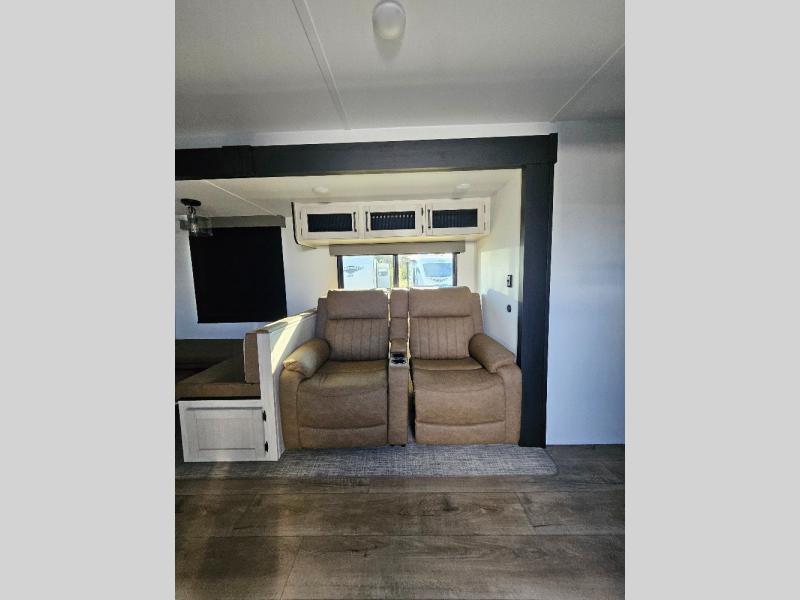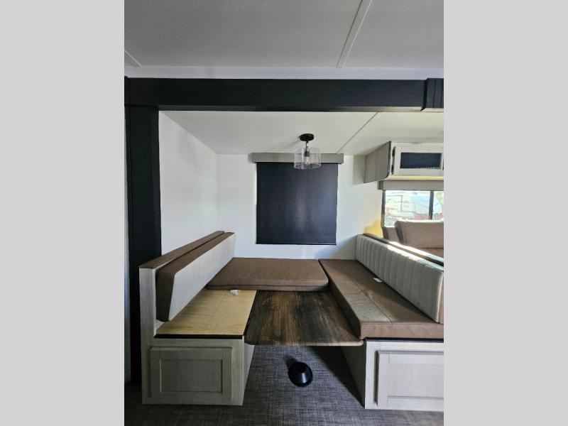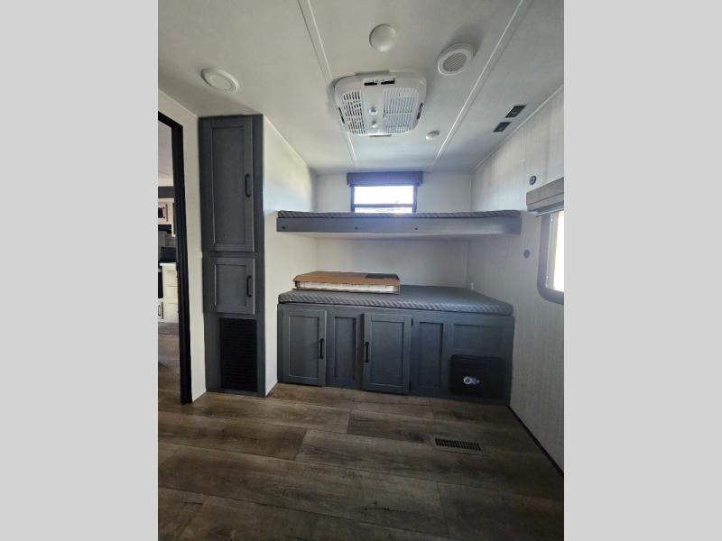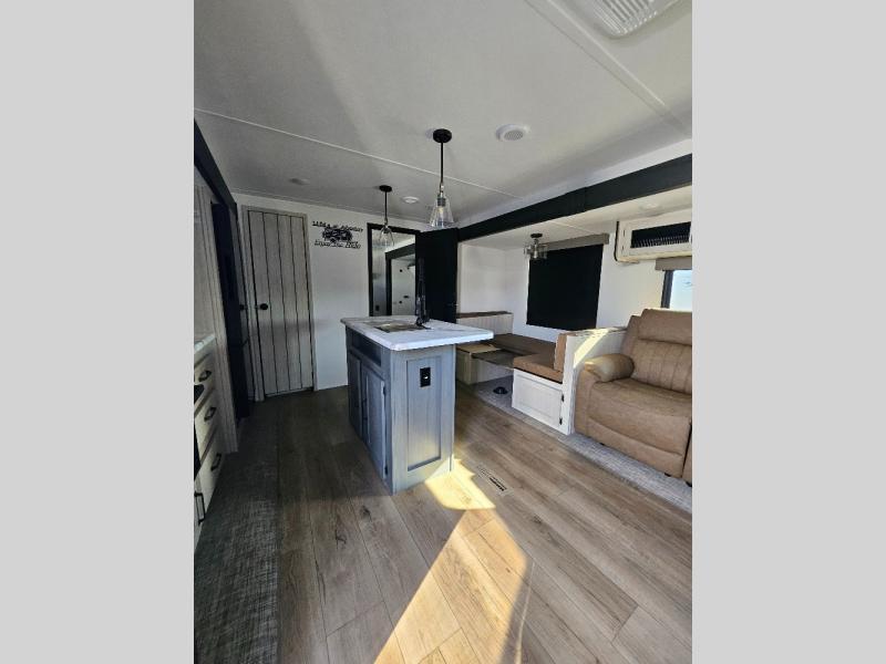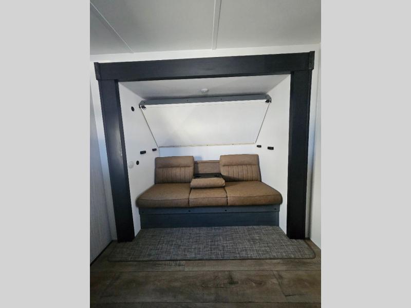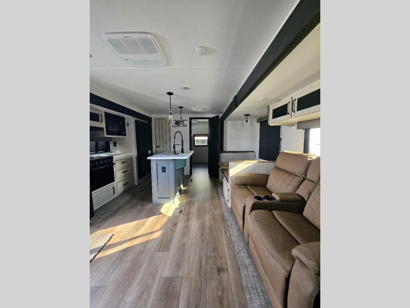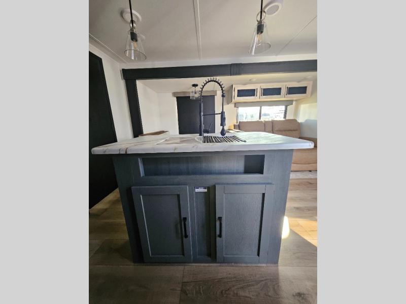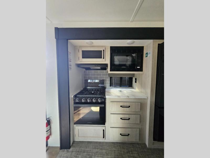 You will be the talk of the campground with this travel trailer! The front private bedroom has a queen bed slide across from a dresser and a front closet plus a second closet with washer and dryer prep. Freshen up each morning in the full bathroom with the 34" x 34" radius shower then head to the kitchen to fry up some eggs with the stainless-steel oven and range. You can enjoy your meals at the booth dinette, and the kitchen island will make your clean up easier with the sink that has a high-rise faucet and sprayer. The rear private bunkhouse has a 32" x 69" bunk above a jiffy sofa slide, a 36" x 69" bunk above a 36" x 71" bunk and a linen closet. Choose one of the outside kitchen options for even more convenience!