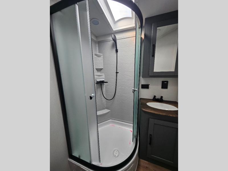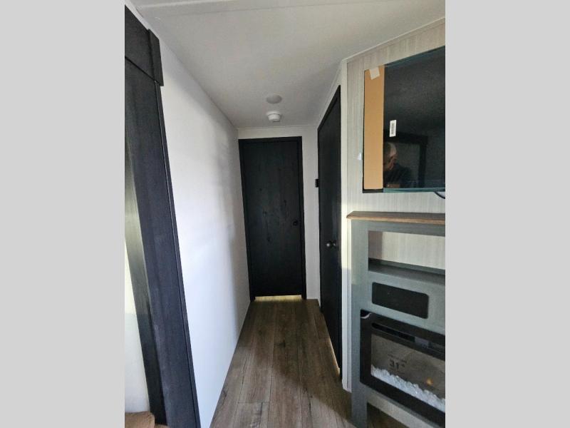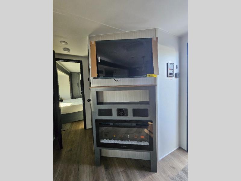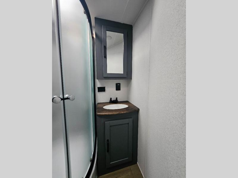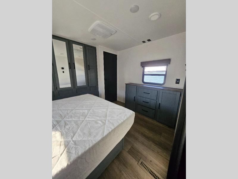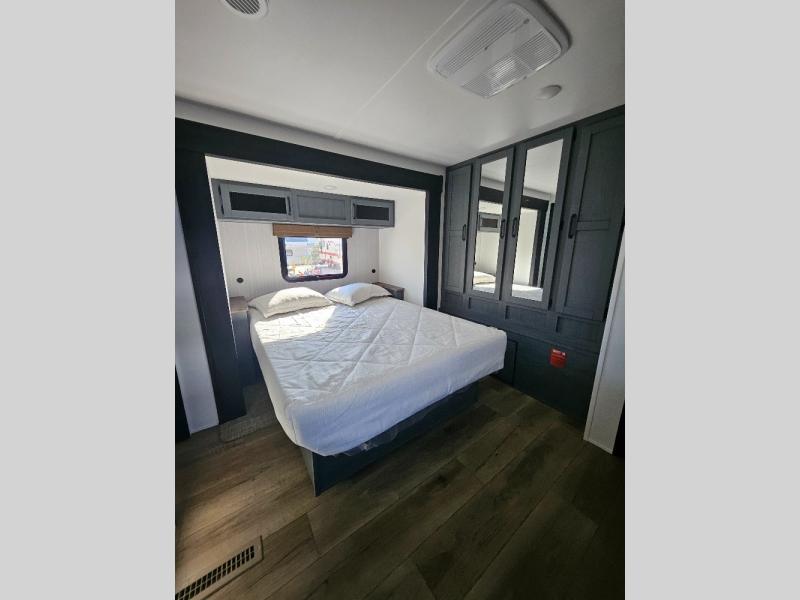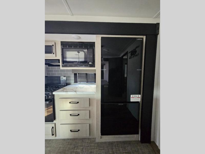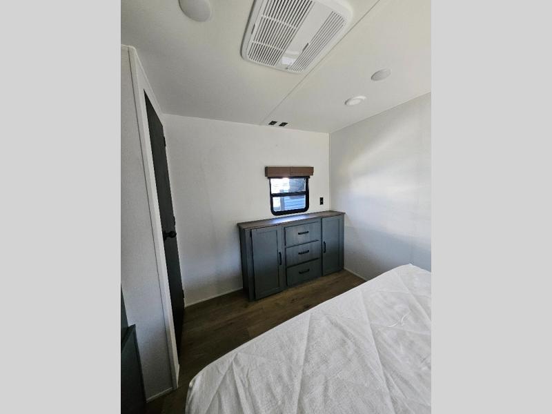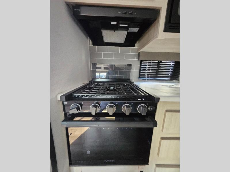 You will be the talk of the campground with this travel trailer! The front private bedroom has a queen bed slide across from a dresser and a front closet plus a second closet with washer and dryer prep. Freshen up each morning in the full bathroom with the 34" x 34" radius shower then head to the kitchen to fry up some eggs with the stainless-steel oven and range. You can enjoy your meals at the booth dinette, and the kitchen island will make your clean up easier with the sink that has a high-rise faucet and sprayer. The rear private bunkhouse has a 32" x 69" bunk above a jiffy sofa slide, a 36" x 69" bunk above a 36" x 71" bunk and a linen closet. Choose one of the outside kitchen options for even more convenience!