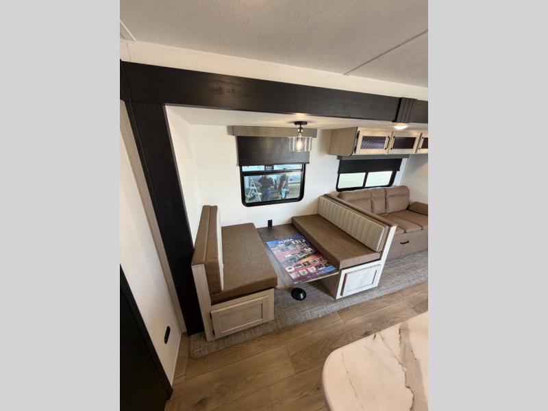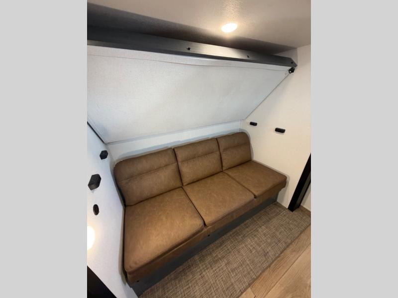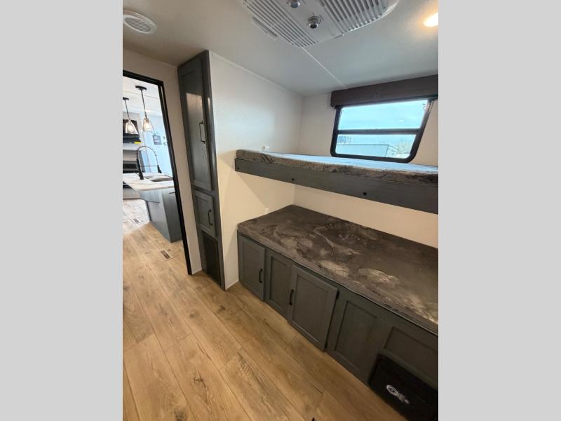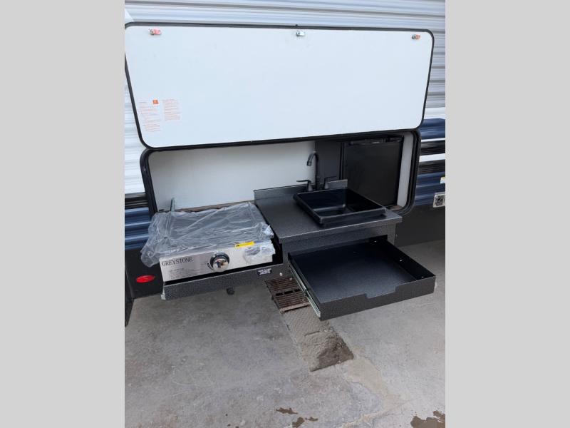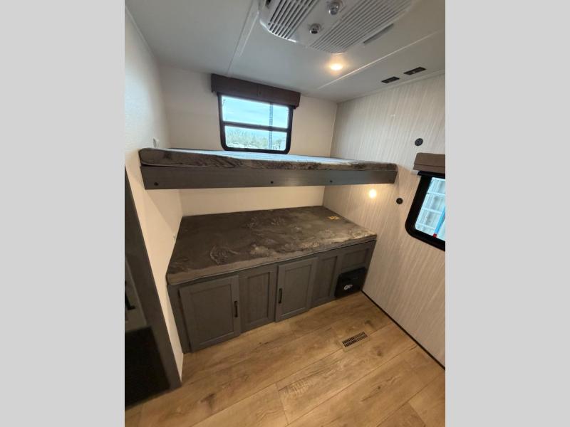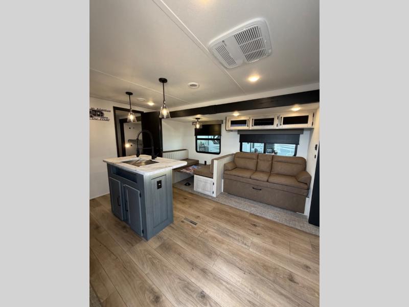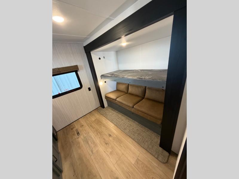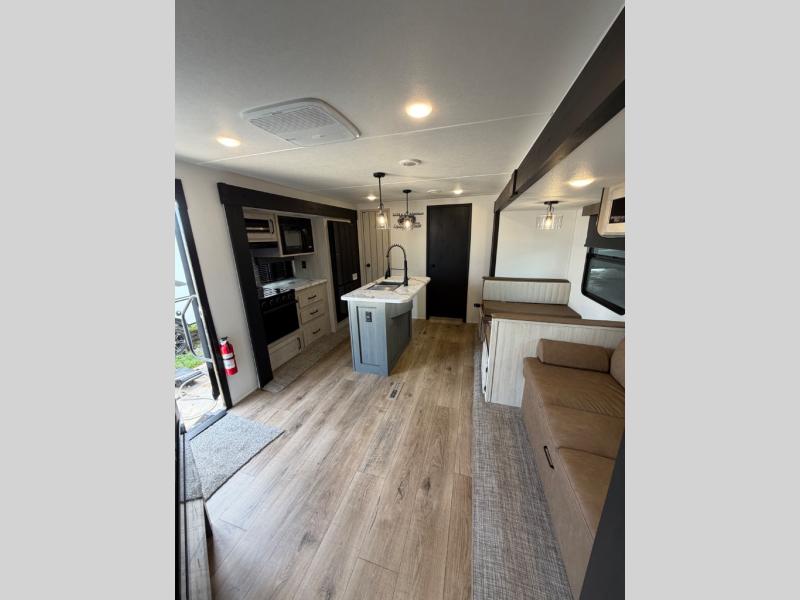 You will be the talk of the campground with this travel trailer! The front private bedroom has a queen bed slide across from a dresser and a front closet plus a second closet with washer and dryer prep. Freshen up each morning in the full bathroom with the 34" x 34" radius shower then head to the kitchen to fry up some eggs with the stainless-steel oven and range. You can enjoy your meals at the booth dinette, and the kitchen island will make your clean up easier with the sink that has a high-rise faucet and sprayer. The rear private bunkhouse has a 32" x 69" bunk above a jiffy sofa slide, a 36" x 69" bunk above a 36" x 71" bunk and a linen closet. Choose one of the outside kitchen options for even more convenience!